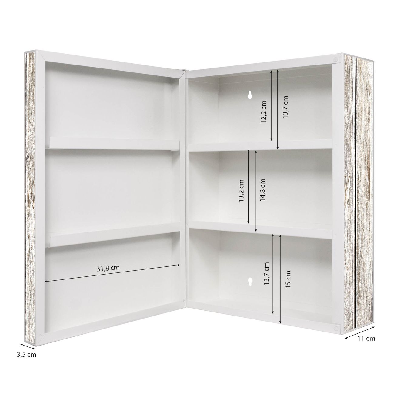 Der Medizinschrank ist gesamt 35x46x15cm groß und wiegt ca. 3900g. Der Türanschlag ist links und kann nicht verändert werden, die Fronttür öffnet ca. 115°. Die Folierung befindet sich auf der Front und den Seiten. Das Gehäuse ist zeitlos weiß und aus Stahl gefertigt. Die innenliegenden Fächer haben verschiedene Größen für unterschiedliche Aufbewahrungsmöglichkeiten, in der Innentür können ebenfalls Dinge abgelegt werden. Befestigt wird der Medizinschrank an 4 Stellen auf der Rückseite, Sie erhalten 3 Schlüssel.
