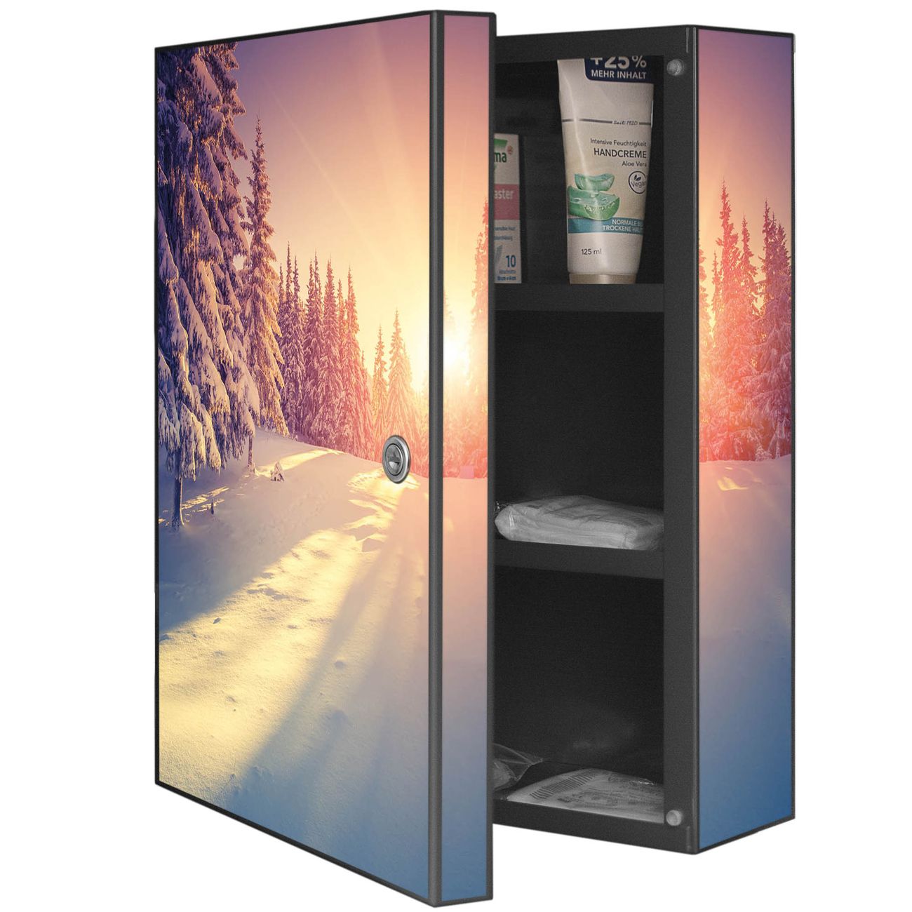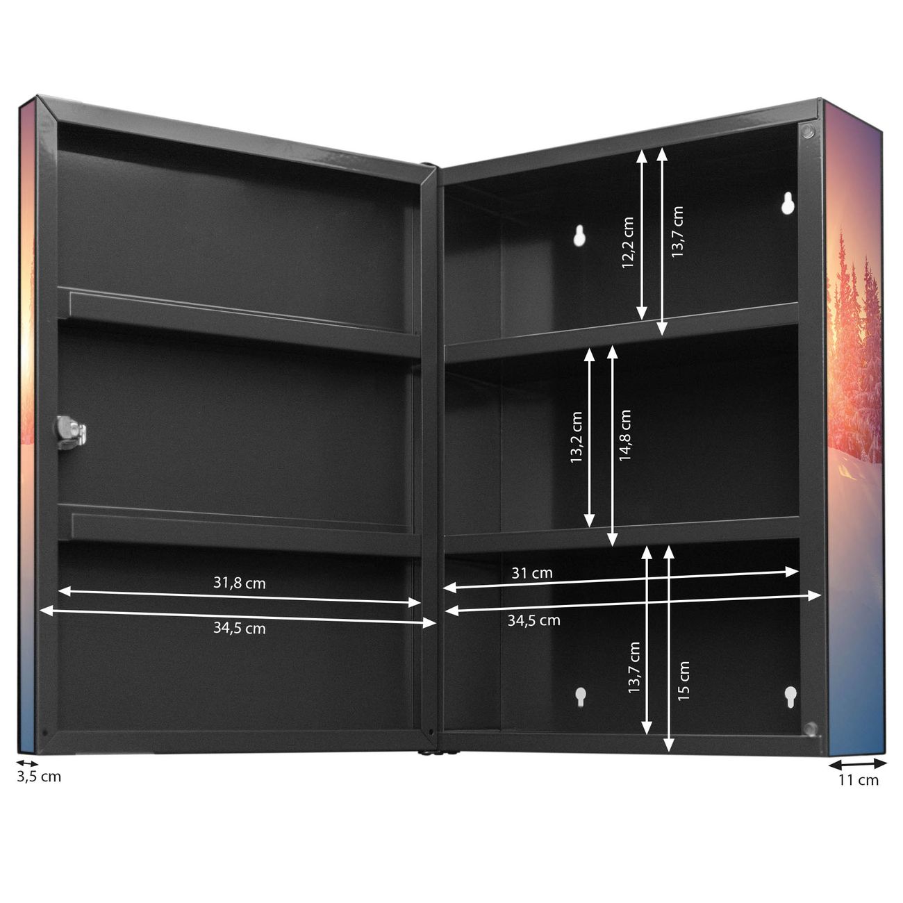 Der Medizinschrank ist gesamt 35x46x15cm groß und wiegt ca. 3900g. Der Türanschlag ist links und kann nicht verändert werden, die Fronttür öffnet ca. 115°. Die Folierung befindet sich auf der Front und den Seiten. Das Gehäuse ist zeitlos anthrazit und aus Stahl gefertigt. Die innenliegenden Fächer haben verschiedene Größen für unterschiedliche Aufbewahrungsmöglichkeiten, in der Innentür können ebenfalls Dinge abgelegt werden. Befestigt wird der Medizinschrank an 4 Stellen auf der Rückseite, Sie erhalten 3 Schlüssel.
