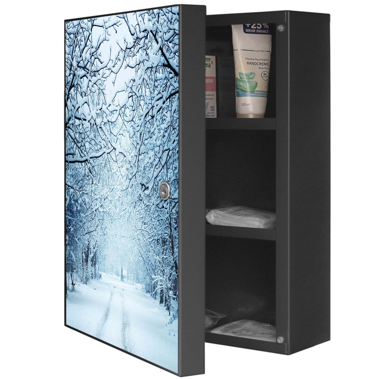 Der Medizinschrank ist gesamt 35x46x15cm groß und wiegt ca. 3900g. Der Türanschlag ist links und kann nicht verändert werden, die Fronttür öffnet ca. 115°. Die Folierung befindet sich auf der Front. Das Gehäuse ist zeitlos anthrazit und aus Stahl gefertigt. Die innenliegenden Fächer haben verschiedene Größen für unterschiedliche Aufbewahrungsmöglichkeiten, in der Innentür können ebenfalls Dinge abgelegt werden. Befestigt wird der Medizinschrank an 4 Stellen auf der Rückseite, Sie erhalten 3 Schlüssel.