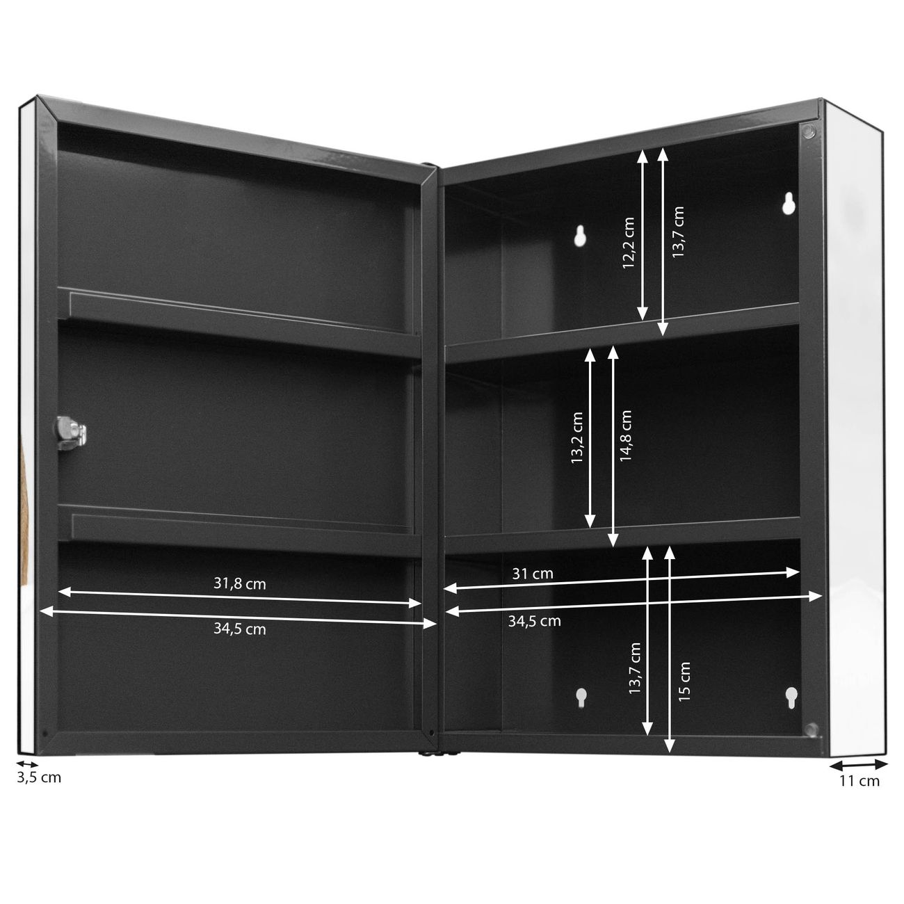 Der Medizinschrank ist gesamt 35x46x15cm groß und wiegt ca. 3900g. Der Türanschlag ist links und kann nicht verändert werden, die Fronttür öffnet ca. 115°. Die Folierung befindet sich auf der Front und den Seiten. Das Gehäuse ist zeitlos anthrazit und aus Stahl gefertigt. Die innenliegenden Fächer haben verschiedene Größen für unterschiedliche Aufbewahrungsmöglichkeiten, in der Innentür können ebenfalls Dinge abgelegt werden. Befestigt wird der Medizinschrank an 4 Stellen auf der Rückseite, Sie erhalten 3 Schlüssel.