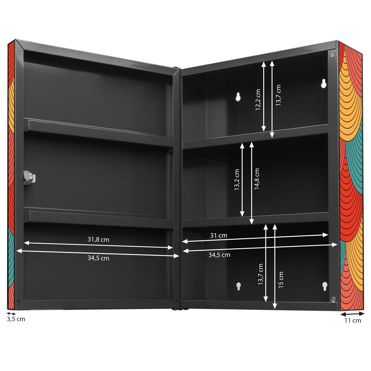 Der Medizinschrank ist gesamt 35x46x15cm groß und wiegt ca. 3900g. Der Türanschlag ist links und kann nicht verändert werden, die Fronttür öffnet ca. 115°. Die Folierung befindet sich auf der Front und den Seiten. Das Gehäuse ist zeitlos anthrazit und aus Stahl gefertigt. Die innenliegenden Fächer haben verschiedene Größen für unterschiedliche Aufbewahrungsmöglichkeiten, in der Innentür können ebenfalls Dinge abgelegt werden. Befestigt wird der Medizinschrank an 4 Stellen auf der Rückseite, Sie erhalten 3 Schlüssel.