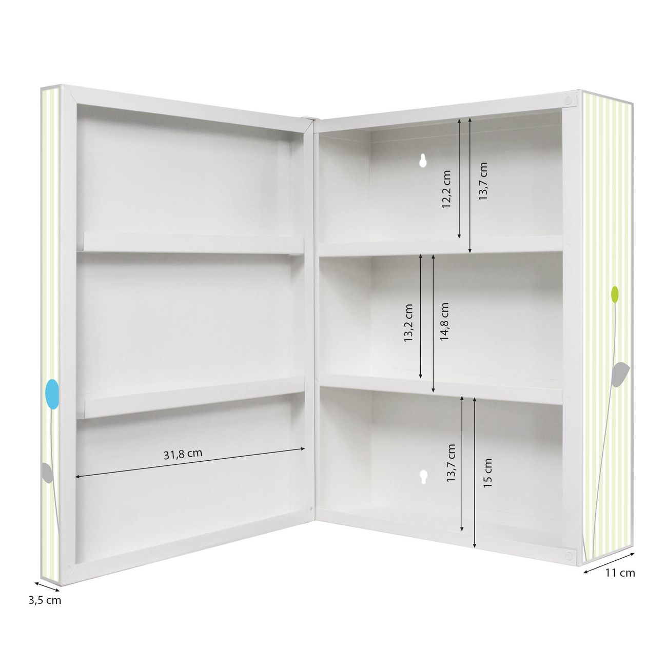 Der Medizinschrank ist gesamt 35x46x15cm groß und wiegt ca. 3900g. Der Türanschlag ist links und kann nicht verändert werden, die Fronttür öffnet ca. 115°. Die Folierung befindet sich auf der Front und den Seiten. Das Gehäuse ist zeitlos weiß und aus Stahl gefertigt. Die innenliegenden Fächer haben verschiedene Größen für unterschiedliche Aufbewahrungsmöglichkeiten, in der Innentür können ebenfalls Dinge abgelegt werden. Befestigt wird der Medizinschrank an 4 Stellen auf der Rückseite, Sie erhalten 3 Schlüssel.