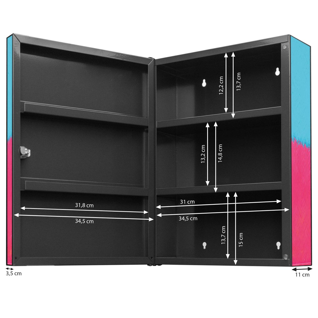 Der Medizinschrank ist gesamt 35x46x15cm groß und wiegt ca. 3900g. Der Türanschlag ist links und kann nicht verändert werden, die Fronttür öffnet ca. 115°. Die Folierung befindet sich auf der Front und den Seiten. Das Gehäuse ist zeitlos anthrazit und aus Stahl gefertigt. Die innenliegenden Fächer haben verschiedene Größen für unterschiedliche Aufbewahrungsmöglichkeiten, in der Innentür können ebenfalls Dinge abgelegt werden. Befestigt wird der Medizinschrank an 4 Stellen auf der Rückseite, Sie erhalten 3 Schlüssel.