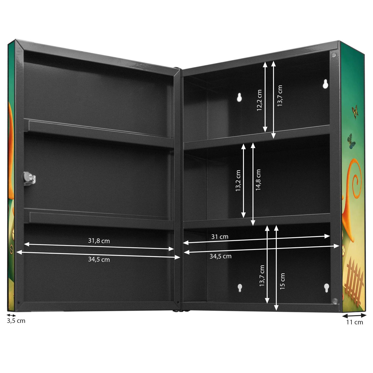 Der Medizinschrank ist gesamt 35x46x15cm groß und wiegt ca. 3900g. Der Türanschlag ist links und kann nicht verändert werden, die Fronttür öffnet ca. 115°. Die Folierung befindet sich auf der Front und den Seiten. Das Gehäuse ist zeitlos anthrazit und aus Stahl gefertigt. Die innenliegenden Fächer haben verschiedene Größen für unterschiedliche Aufbewahrungsmöglichkeiten, in der Innentür können ebenfalls Dinge abgelegt werden. Befestigt wird der Medizinschrank an 4 Stellen auf der Rückseite, Sie erhalten 3 Schlüssel.