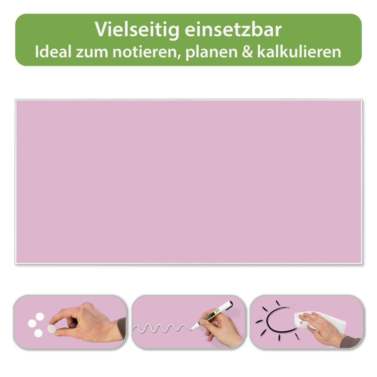 FUNKTION: Die banjado Magnettafel 78x37 cm im Design Farbe Flieder vereint Funktionalität und modernes Wohndesign auf stilvolle Weise. Diese hochwertige Magnetwand aus Metall hilft Ihnen dabei, Notizen, Fotos, Termine, Einkaufslisten oder Rezepte übersichtlich zu organisieren. Als praktisches Memoboard sorgt sie für Struktur im Alltag und setzt gleichzeitig einen dekorativen Akzent an Ihrer Wand. DESIGN: Die Metalltafel besteht aus robustem, lackiertem Stahl und ist mit allen handelsüblichen Magneten nutzbar. Besonders praktisch ist die beschreibbare Oberfläche. Sie können die Magnettafel ganz einfach mit Kreidestiften beschriften und die Inhalte bei Bedarf mit einem feuchten Tuch wieder entfernen. So eignet sich das Memoboard ideal für Wochenpläne, Menüpläne, To Do Listen oder kreative Botschaften. DETAILS: Mit ihrem großzügigen Querformat von 78x37 cm bietet die Magnettafel ausreichend Platz für Ihre Organisation. Das Motiv Farbe Flieder bringt eine warme, natürliche Optik in Küche, Flur, Büro oder Homeoffice und wirkt auch ohne Magnete oder Beschriftung wie ein modernes Wandbild. NUTZEN: Auf der Rückseite befinden sich vorgefertigte Löcher für eine schnelle und unkomplizierte Wandmontage. Jede banjado Magnettafel wird in Deutschland gefertigt und steht für Qualität, Langlebigkeit und liebevolle Verarbeitung. Dieses beschreibbare Memoboard ist die perfekte Kombination aus Metalltafel, Designobjekt und praktischer Magnetwand für Ihren Alltag. BANJADO: Wir sind ein kleines Team aus dem Herzen von Sachsen. Wir fertigen alle Artikel von Hand für Sie an, Sie erhalten keine preiswerte Importware. Auf Wunsch können Sie auch Ihr eigenes Foto auf die Magnettafel aufbringen, schreiben Sie uns an. Herzlichst, Ihr banjado-Team