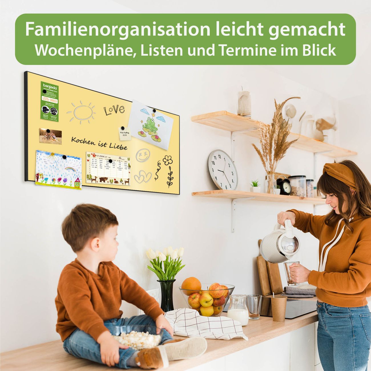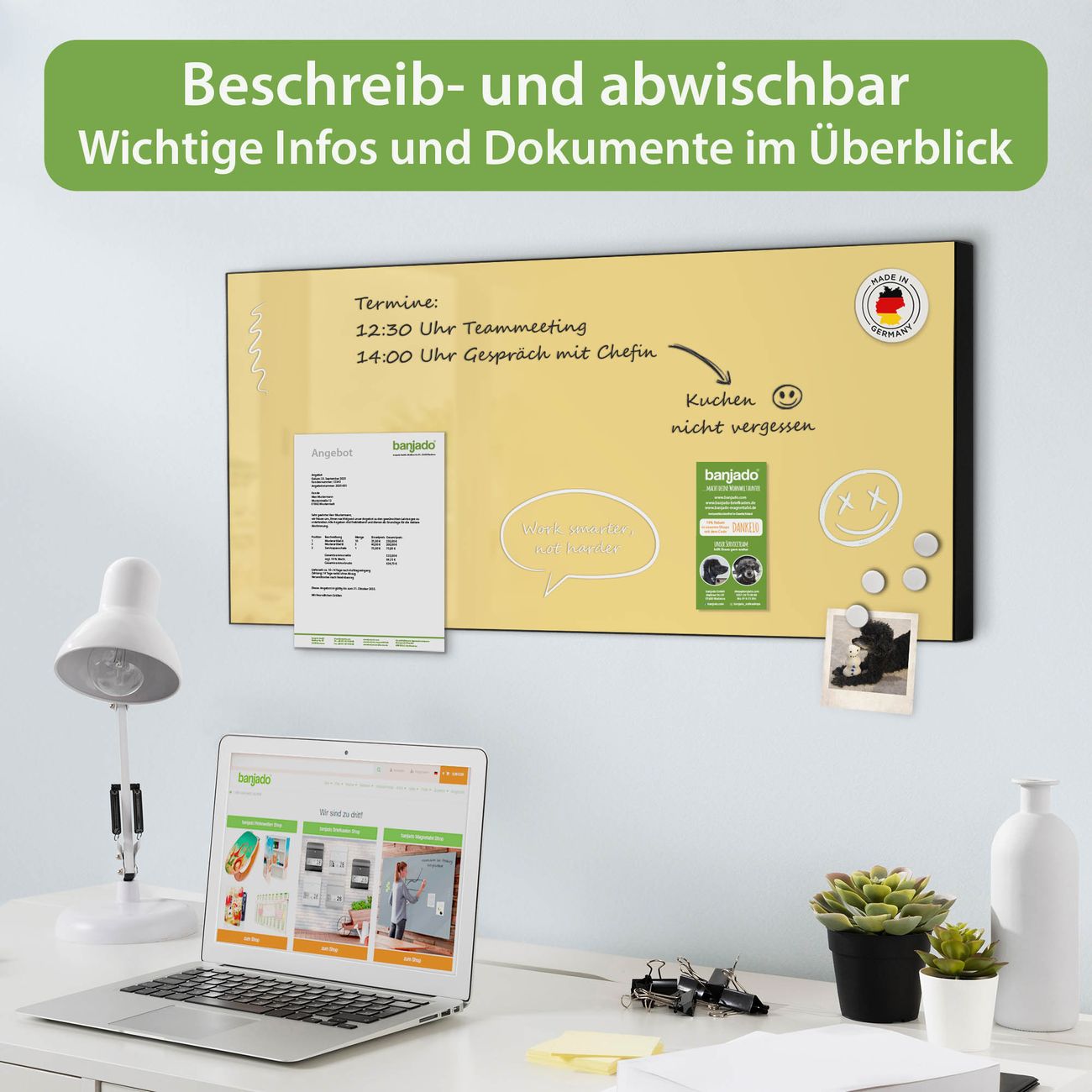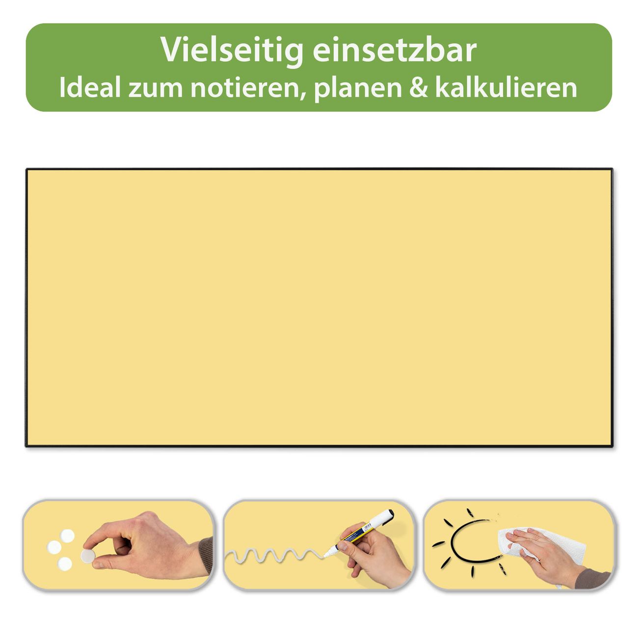 FUNKTION: Die banjado Magnettafel 78x37 cm im Design Farbe Honig vereint Funktionalität und modernes Wohndesign auf stilvolle Weise. Diese hochwertige Magnetwand aus Metall hilft Ihnen dabei, Notizen, Fotos, Termine, Einkaufslisten oder Rezepte übersichtlich zu organisieren. Als praktisches Memoboard sorgt sie für Struktur im Alltag und setzt gleichzeitig einen dekorativen Akzent an Ihrer Wand. DESIGN: Die Metalltafel besteht aus robustem, lackiertem Stahl und ist mit allen handelsüblichen Magneten nutzbar. Besonders praktisch ist die beschreibbare Oberfläche. Sie können die Magnettafel ganz einfach mit Kreidestiften beschriften und die Inhalte bei Bedarf mit einem feuchten Tuch wieder entfernen. So eignet sich das Memoboard ideal für Wochenpläne, Menüpläne, To Do Listen oder kreative Botschaften. DETAILS: Mit ihrem großzügigen Querformat von 78x37 cm bietet die Magnettafel ausreichend Platz für Ihre Organisation. Das Motiv Farbe Honig bringt eine warme, natürliche Optik in Küche, Flur, Büro oder Homeoffice und wirkt auch ohne Magnete oder Beschriftung wie ein modernes Wandbild. NUTZEN: Auf der Rückseite befinden sich vorgefertigte Löcher für eine schnelle und unkomplizierte Wandmontage. Jede banjado Magnettafel wird in Deutschland gefertigt und steht für Qualität, Langlebigkeit und liebevolle Verarbeitung. Dieses beschreibbare Memoboard ist die perfekte Kombination aus Metalltafel, Designobjekt und praktischer Magnetwand für Ihren Alltag. BANJADO: Wir sind ein kleines Team aus dem Herzen von Sachsen. Wir fertigen alle Artikel von Hand für Sie an, Sie erhalten keine preiswerte Importware. Auf Wunsch können Sie auch Ihr eigenes Foto auf die Magnettafel aufbringen, schreiben Sie uns an. Herzlichst, Ihr banjado-Team