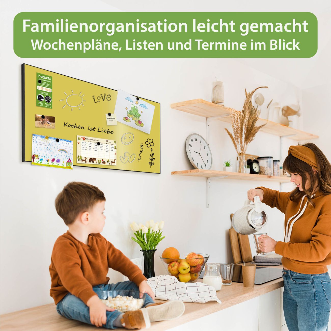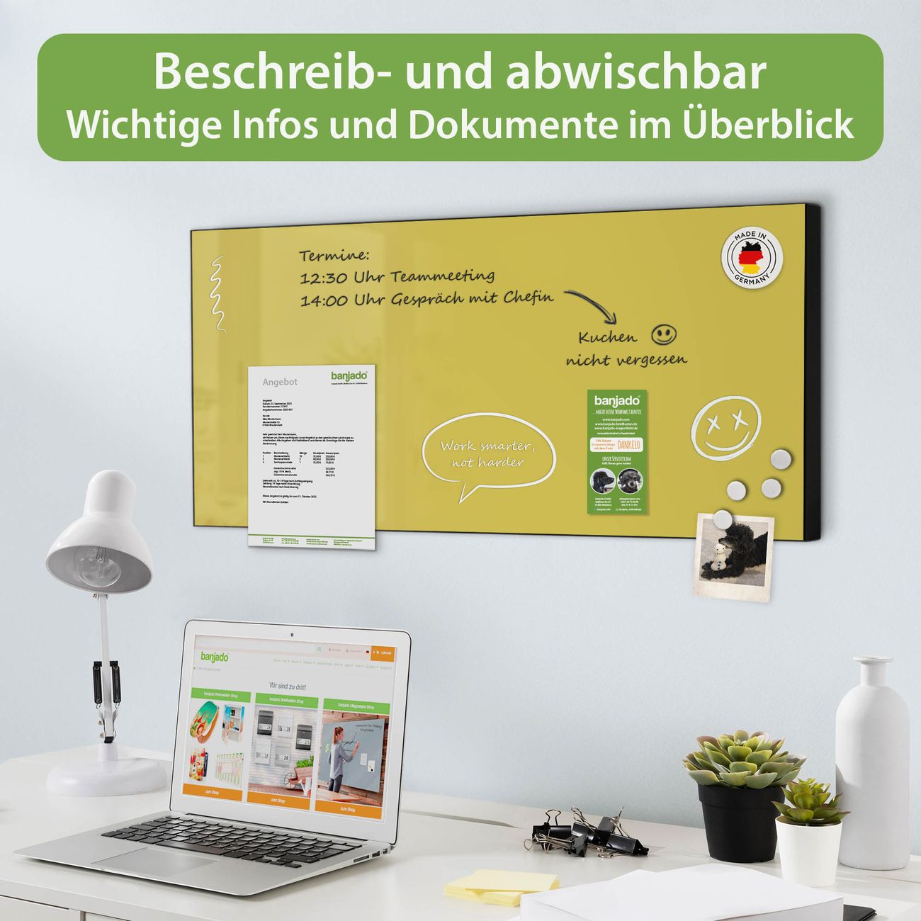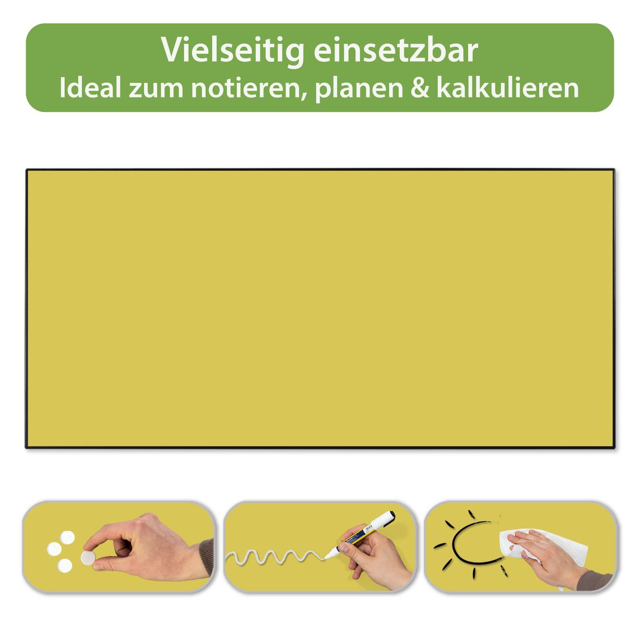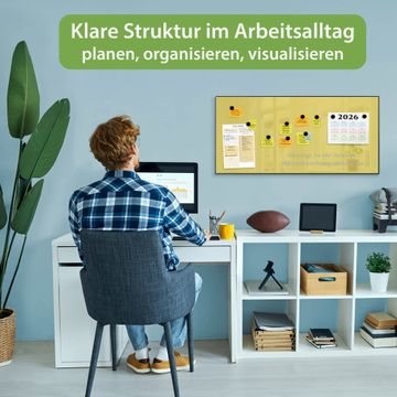 FUNKTION: Die banjado Magnettafel 78x37 cm im Design Farbe Lemon vereint Funktionalität und modernes Wohndesign auf stilvolle Weise. Diese hochwertige Magnetwand aus Metall hilft Ihnen dabei, Notizen, Fotos, Termine, Einkaufslisten oder Rezepte übersichtlich zu organisieren. Als praktisches Memoboard sorgt sie für Struktur im Alltag und setzt gleichzeitig einen dekorativen Akzent an Ihrer Wand. DESIGN: Die Metalltafel besteht aus robustem, lackiertem Stahl und ist mit allen handelsüblichen Magneten nutzbar. Besonders praktisch ist die beschreibbare Oberfläche. Sie können die Magnettafel ganz einfach mit Kreidestiften beschriften und die Inhalte bei Bedarf mit einem feuchten Tuch wieder entfernen. So eignet sich das Memoboard ideal für Wochenpläne, Menüpläne, To Do Listen oder kreative Botschaften. DETAILS: Mit ihrem großzügigen Querformat von 78x37 cm bietet die Magnettafel ausreichend Platz für Ihre Organisation. Das Motiv Farbe Lemon bringt eine warme, natürliche Optik in Küche, Flur, Büro oder Homeoffice und wirkt auch ohne Magnete oder Beschriftung wie ein modernes Wandbild. NUTZEN: Auf der Rückseite befinden sich vorgefertigte Löcher für eine schnelle und unkomplizierte Wandmontage. Jede banjado Magnettafel wird in Deutschland gefertigt und steht für Qualität, Langlebigkeit und liebevolle Verarbeitung. Dieses beschreibbare Memoboard ist die perfekte Kombination aus Metalltafel, Designobjekt und praktischer Magnetwand für Ihren Alltag. BANJADO: Wir sind ein kleines Team aus dem Herzen von Sachsen. Wir fertigen alle Artikel von Hand für Sie an, Sie erhalten keine preiswerte Importware. Auf Wunsch können Sie auch Ihr eigenes Foto auf die Magnettafel aufbringen, schreiben Sie uns an. Herzlichst, Ihr banjado-Team