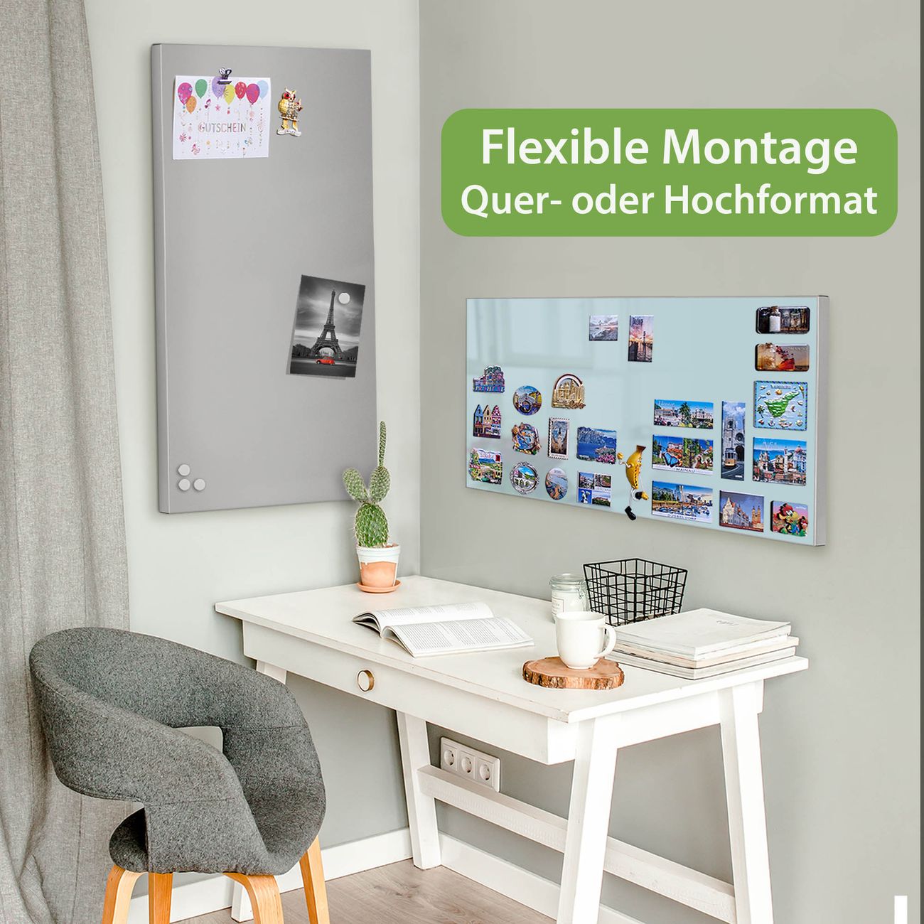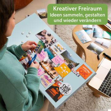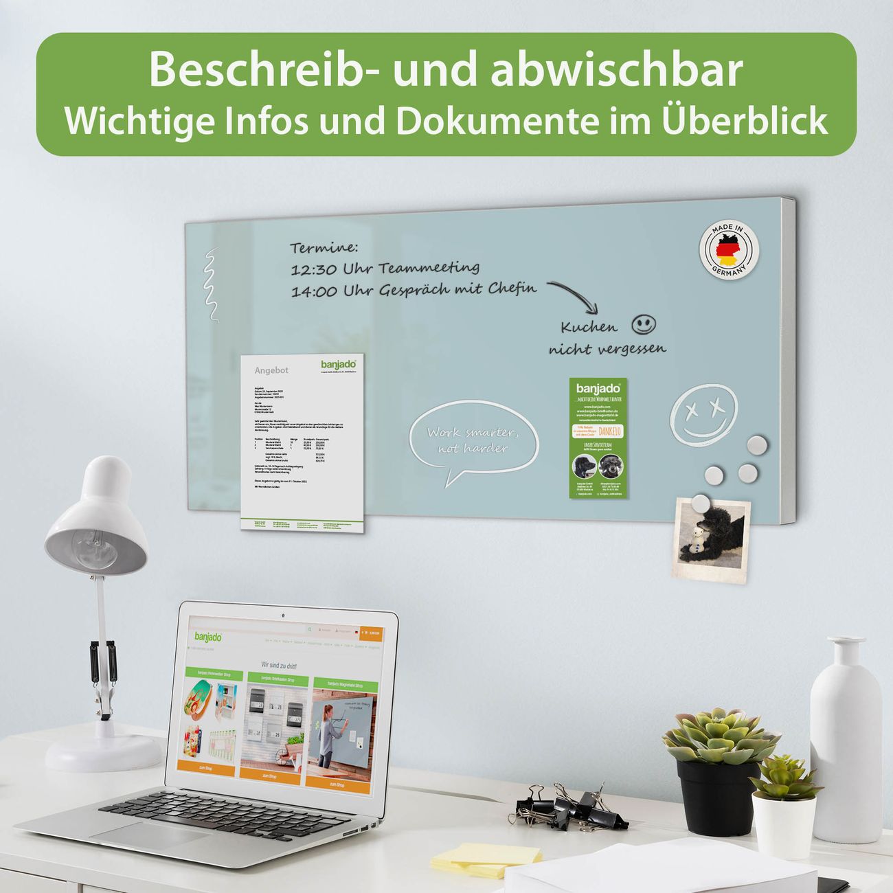 FUNKTION: Die banjado Magnettafel 78x37 cm im Design Farbe Meeresgrün vereint Funktionalität und modernes Wohndesign auf stilvolle Weise. Diese hochwertige Magnetwand aus Metall hilft Ihnen dabei, Notizen, Fotos, Termine, Einkaufslisten oder Rezepte übersichtlich zu organisieren. Als praktisches Memoboard sorgt sie für Struktur im Alltag und setzt gleichzeitig einen dekorativen Akzent an Ihrer Wand. DESIGN: Die Metalltafel besteht aus robustem, lackiertem Stahl und ist mit allen handelsüblichen Magneten nutzbar. Besonders praktisch ist die beschreibbare Oberfläche. Sie können die Magnettafel ganz einfach mit Kreidestiften beschriften und die Inhalte bei Bedarf mit einem feuchten Tuch wieder entfernen. So eignet sich das Memoboard ideal für Wochenpläne, Menüpläne, To Do Listen oder kreative Botschaften. DETAILS: Mit ihrem großzügigen Querformat von 78x37 cm bietet die Magnettafel ausreichend Platz für Ihre Organisation. Das Motiv Farbe Meeresgrün bringt eine warme, natürliche Optik in Küche, Flur, Büro oder Homeoffice und wirkt auch ohne Magnete oder Beschriftung wie ein modernes Wandbild. NUTZEN: Auf der Rückseite befinden sich vorgefertigte Löcher für eine schnelle und unkomplizierte Wandmontage. Jede banjado Magnettafel wird in Deutschland gefertigt und steht für Qualität, Langlebigkeit und liebevolle Verarbeitung. Dieses beschreibbare Memoboard ist die perfekte Kombination aus Metalltafel, Designobjekt und praktischer Magnetwand für Ihren Alltag. BANJADO: Wir sind ein kleines Team aus dem Herzen von Sachsen. Wir fertigen alle Artikel von Hand für Sie an, Sie erhalten keine preiswerte Importware. Auf Wunsch können Sie auch Ihr eigenes Foto auf die Magnettafel aufbringen, schreiben Sie uns an. Herzlichst, Ihr banjado-Team