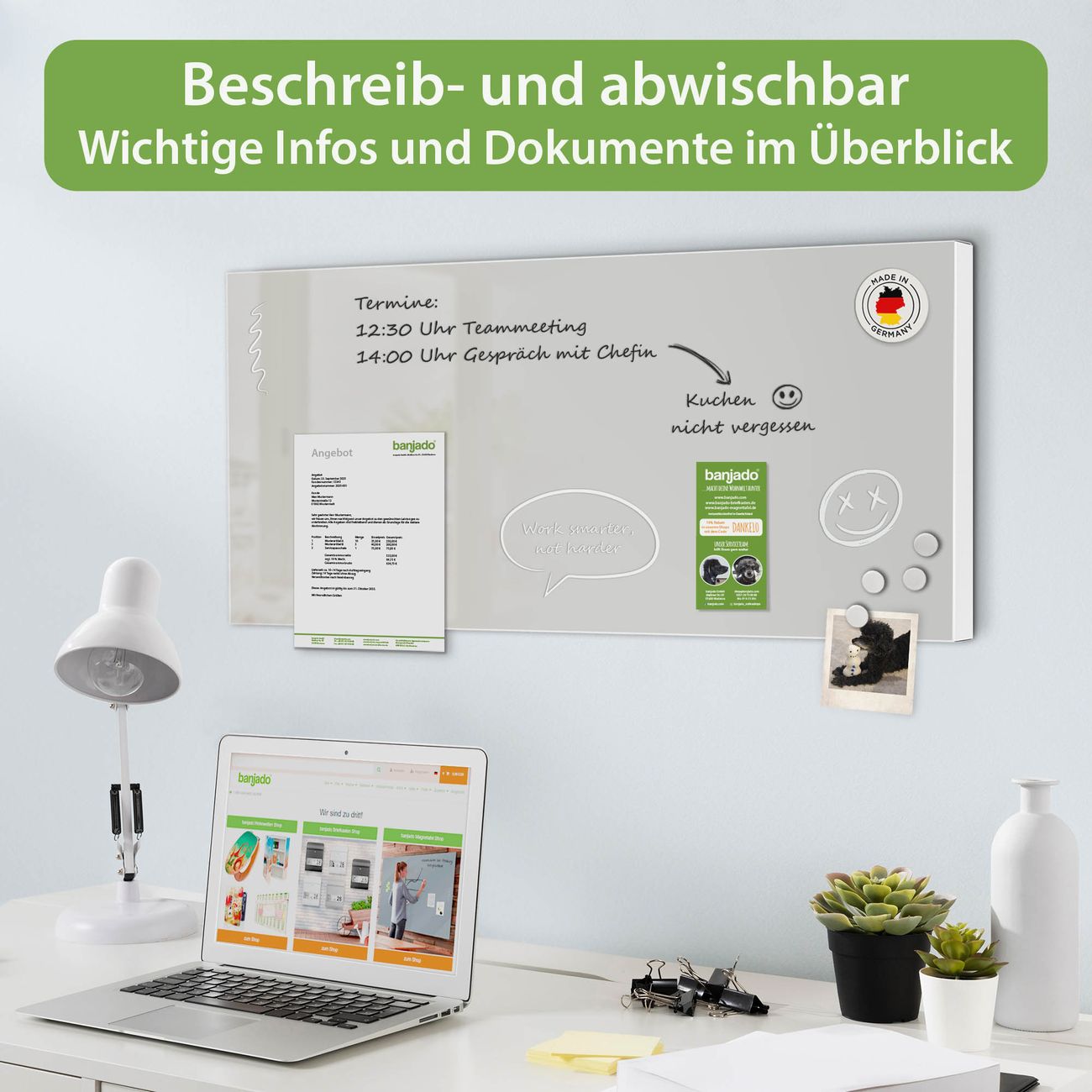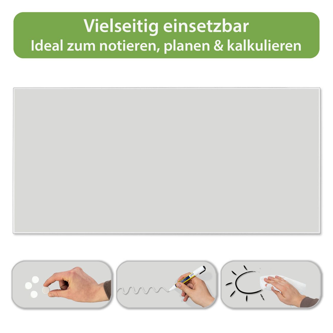 FUNKTION: Die banjado Magnettafel 78x37 cm im Design Farbe Nebelgrau vereint Funktionalität und modernes Wohndesign auf stilvolle Weise. Diese hochwertige Magnetwand aus Metall hilft Ihnen dabei, Notizen, Fotos, Termine, Einkaufslisten oder Rezepte übersichtlich zu organisieren. Als praktisches Memoboard sorgt sie für Struktur im Alltag und setzt gleichzeitig einen dekorativen Akzent an Ihrer Wand. DESIGN: Die Metalltafel besteht aus robustem, lackiertem Stahl und ist mit allen handelsüblichen Magneten nutzbar. Besonders praktisch ist die beschreibbare Oberfläche. Sie können die Magnettafel ganz einfach mit Kreidestiften beschriften und die Inhalte bei Bedarf mit einem feuchten Tuch wieder entfernen. So eignet sich das Memoboard ideal für Wochenpläne, Menüpläne, To Do Listen oder kreative Botschaften. DETAILS: Mit ihrem großzügigen Querformat von 78x37 cm bietet die Magnettafel ausreichend Platz für Ihre Organisation. Das Motiv Farbe Nebelgrau bringt eine warme, natürliche Optik in Küche, Flur, Büro oder Homeoffice und wirkt auch ohne Magnete oder Beschriftung wie ein modernes Wandbild. NUTZEN: Auf der Rückseite befinden sich vorgefertigte Löcher für eine schnelle und unkomplizierte Wandmontage. Jede banjado Magnettafel wird in Deutschland gefertigt und steht für Qualität, Langlebigkeit und liebevolle Verarbeitung. Dieses beschreibbare Memoboard ist die perfekte Kombination aus Metalltafel, Designobjekt und praktischer Magnetwand für Ihren Alltag. BANJADO: Wir sind ein kleines Team aus dem Herzen von Sachsen. Wir fertigen alle Artikel von Hand für Sie an, Sie erhalten keine preiswerte Importware. Auf Wunsch können Sie auch Ihr eigenes Foto auf die Magnettafel aufbringen, schreiben Sie uns an. Herzlichst, Ihr banjado-Team