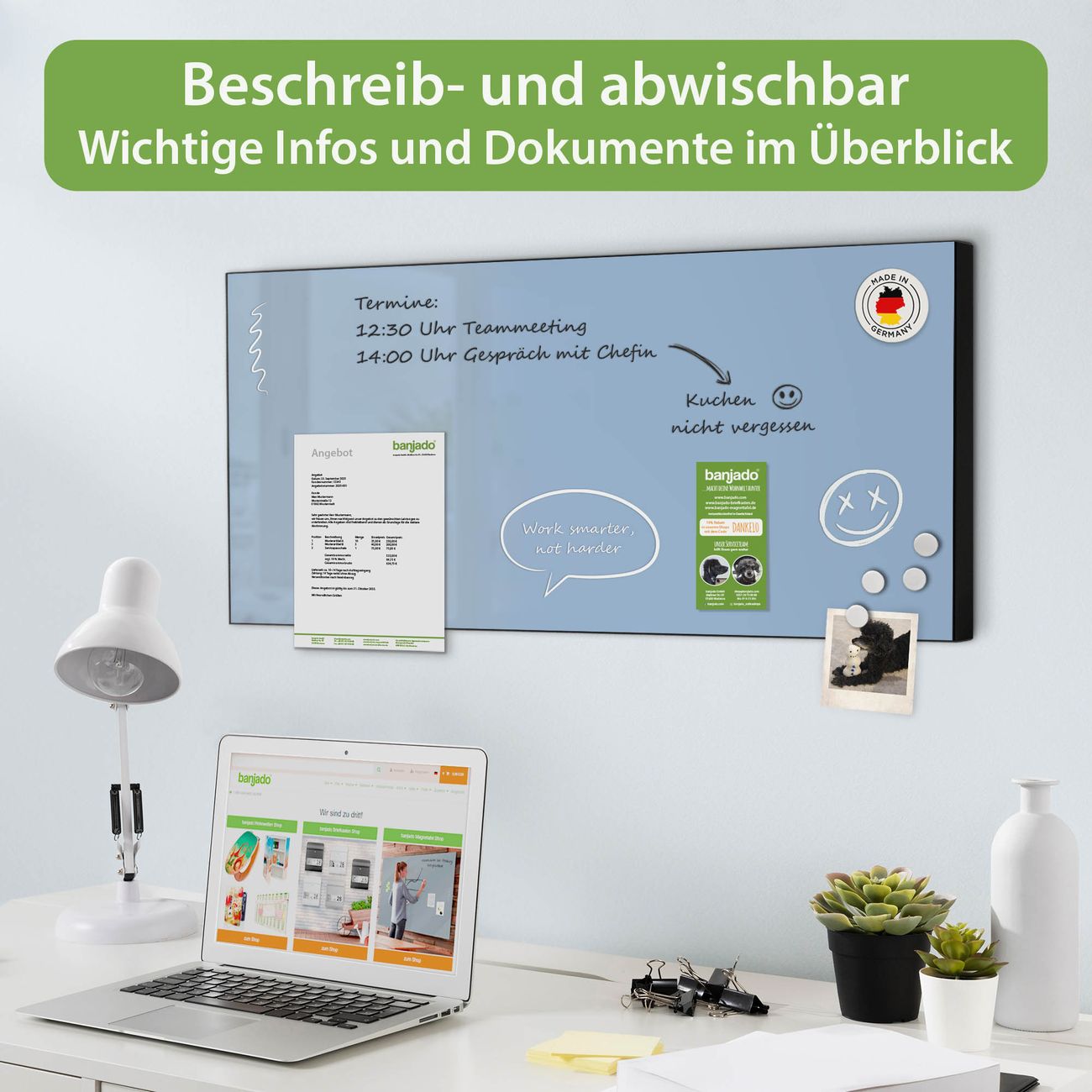 FUNKTION: Die banjado Magnettafel 78x37 cm im Design Farbe Pastellblau vereint Funktionalität und modernes Wohndesign auf stilvolle Weise. Diese hochwertige Magnetwand aus Metall hilft Ihnen dabei, Notizen, Fotos, Termine, Einkaufslisten oder Rezepte übersichtlich zu organisieren. Als praktisches Memoboard sorgt sie für Struktur im Alltag und setzt gleichzeitig einen dekorativen Akzent an Ihrer Wand. DESIGN: Die Metalltafel besteht aus robustem, lackiertem Stahl und ist mit allen handelsüblichen Magneten nutzbar. Besonders praktisch ist die beschreibbare Oberfläche. Sie können die Magnettafel ganz einfach mit Kreidestiften beschriften und die Inhalte bei Bedarf mit einem feuchten Tuch wieder entfernen. So eignet sich das Memoboard ideal für Wochenpläne, Menüpläne, To Do Listen oder kreative Botschaften. DETAILS: Mit ihrem großzügigen Querformat von 78x37 cm bietet die Magnettafel ausreichend Platz für Ihre Organisation. Das Motiv Farbe Pastellblau bringt eine warme, natürliche Optik in Küche, Flur, Büro oder Homeoffice und wirkt auch ohne Magnete oder Beschriftung wie ein modernes Wandbild. NUTZEN: Auf der Rückseite befinden sich vorgefertigte Löcher für eine schnelle und unkomplizierte Wandmontage. Jede banjado Magnettafel wird in Deutschland gefertigt und steht für Qualität, Langlebigkeit und liebevolle Verarbeitung. Dieses beschreibbare Memoboard ist die perfekte Kombination aus Metalltafel, Designobjekt und praktischer Magnetwand für Ihren Alltag. BANJADO: Wir sind ein kleines Team aus dem Herzen von Sachsen. Wir fertigen alle Artikel von Hand für Sie an, Sie erhalten keine preiswerte Importware. Auf Wunsch können Sie auch Ihr eigenes Foto auf die Magnettafel aufbringen, schreiben Sie uns an. Herzlichst, Ihr banjado-Team