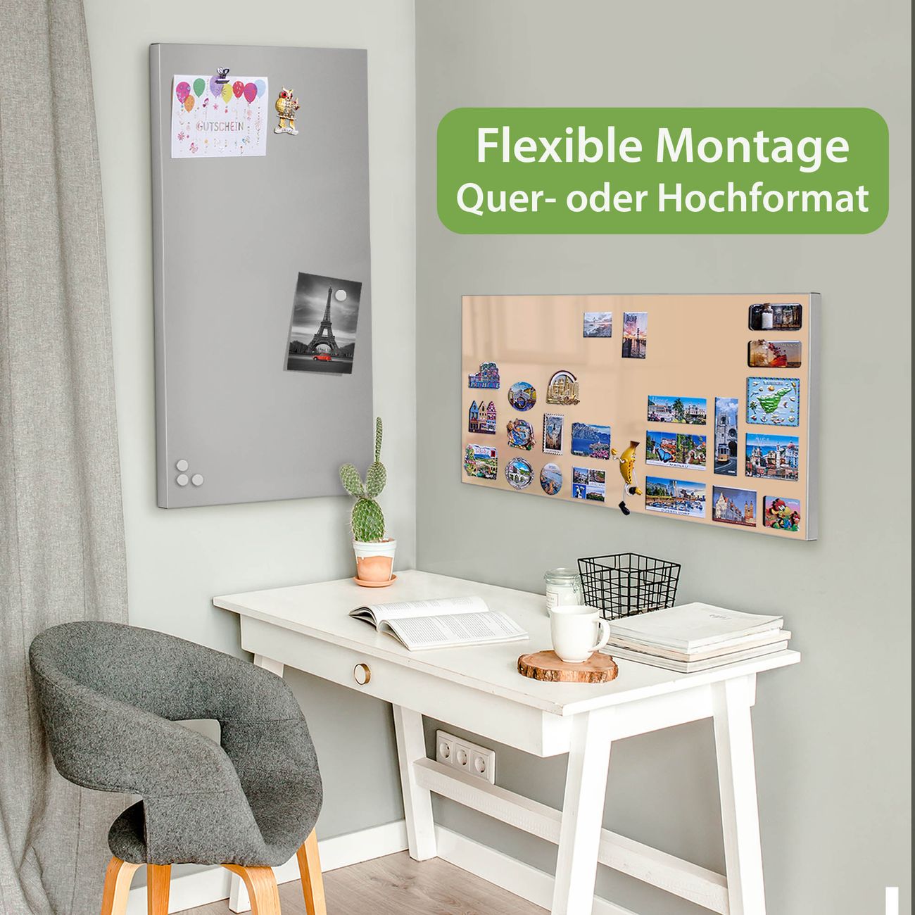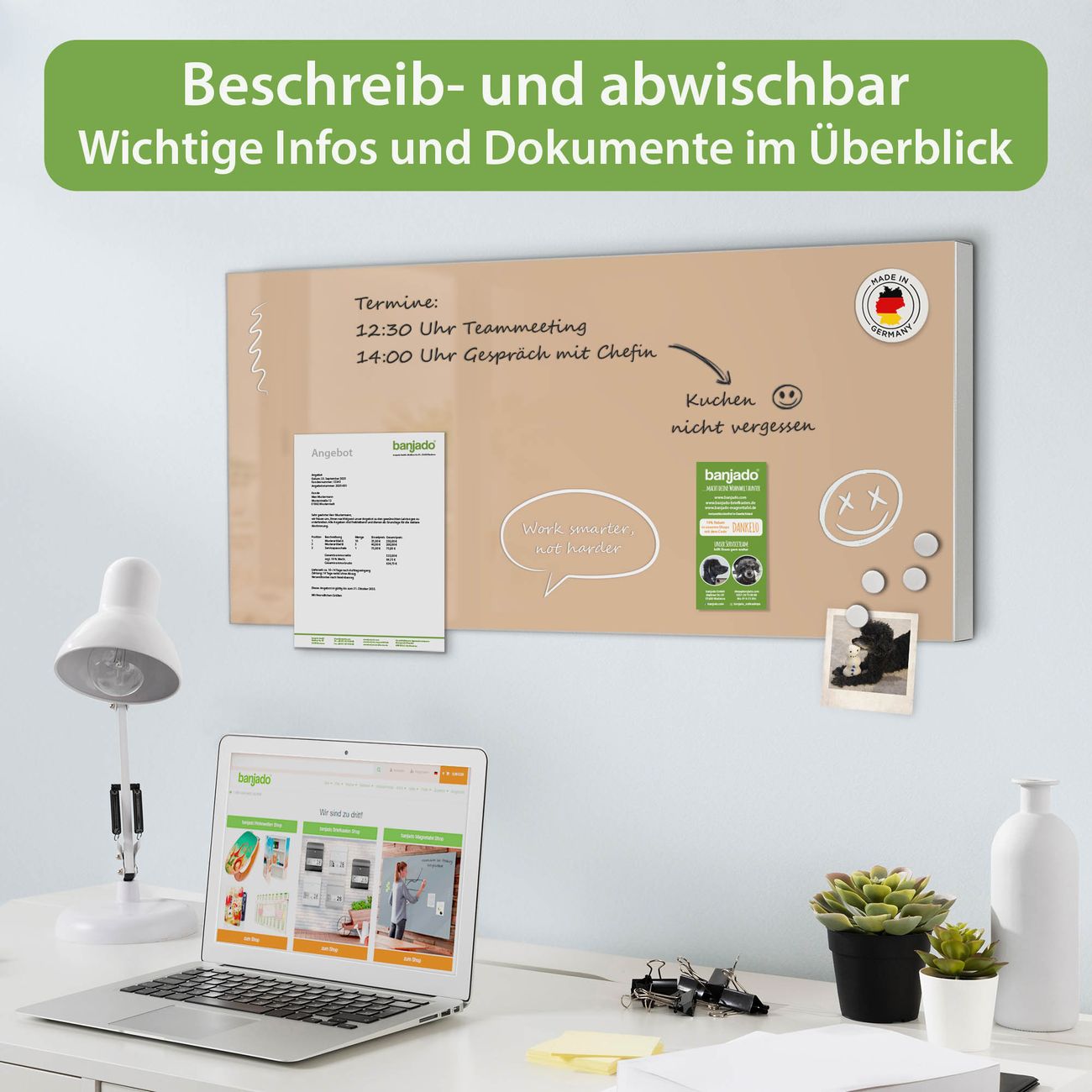FUNKTION: Die banjado Magnettafel 78x37 cm im Design Farbe Sandstein vereint Funktionalität und modernes Wohndesign auf stilvolle Weise. Diese hochwertige Magnetwand aus Metall hilft Ihnen dabei, Notizen, Fotos, Termine, Einkaufslisten oder Rezepte übersichtlich zu organisieren. Als praktisches Memoboard sorgt sie für Struktur im Alltag und setzt gleichzeitig einen dekorativen Akzent an Ihrer Wand. DESIGN: Die Metalltafel besteht aus robustem, lackiertem Stahl und ist mit allen handelsüblichen Magneten nutzbar. Besonders praktisch ist die beschreibbare Oberfläche. Sie können die Magnettafel ganz einfach mit Kreidestiften beschriften und die Inhalte bei Bedarf mit einem feuchten Tuch wieder entfernen. So eignet sich das Memoboard ideal für Wochenpläne, Menüpläne, To Do Listen oder kreative Botschaften. DETAILS: Mit ihrem großzügigen Querformat von 78x37 cm bietet die Magnettafel ausreichend Platz für Ihre Organisation. Das Motiv Farbe Sandstein bringt eine warme, natürliche Optik in Küche, Flur, Büro oder Homeoffice und wirkt auch ohne Magnete oder Beschriftung wie ein modernes Wandbild. NUTZEN: Auf der Rückseite befinden sich vorgefertigte Löcher für eine schnelle und unkomplizierte Wandmontage. Jede banjado Magnettafel wird in Deutschland gefertigt und steht für Qualität, Langlebigkeit und liebevolle Verarbeitung. Dieses beschreibbare Memoboard ist die perfekte Kombination aus Metalltafel, Designobjekt und praktischer Magnetwand für Ihren Alltag. BANJADO: Wir sind ein kleines Team aus dem Herzen von Sachsen. Wir fertigen alle Artikel von Hand für Sie an, Sie erhalten keine preiswerte Importware. Auf Wunsch können Sie auch Ihr eigenes Foto auf die Magnettafel aufbringen, schreiben Sie uns an. Herzlichst, Ihr banjado-Team