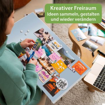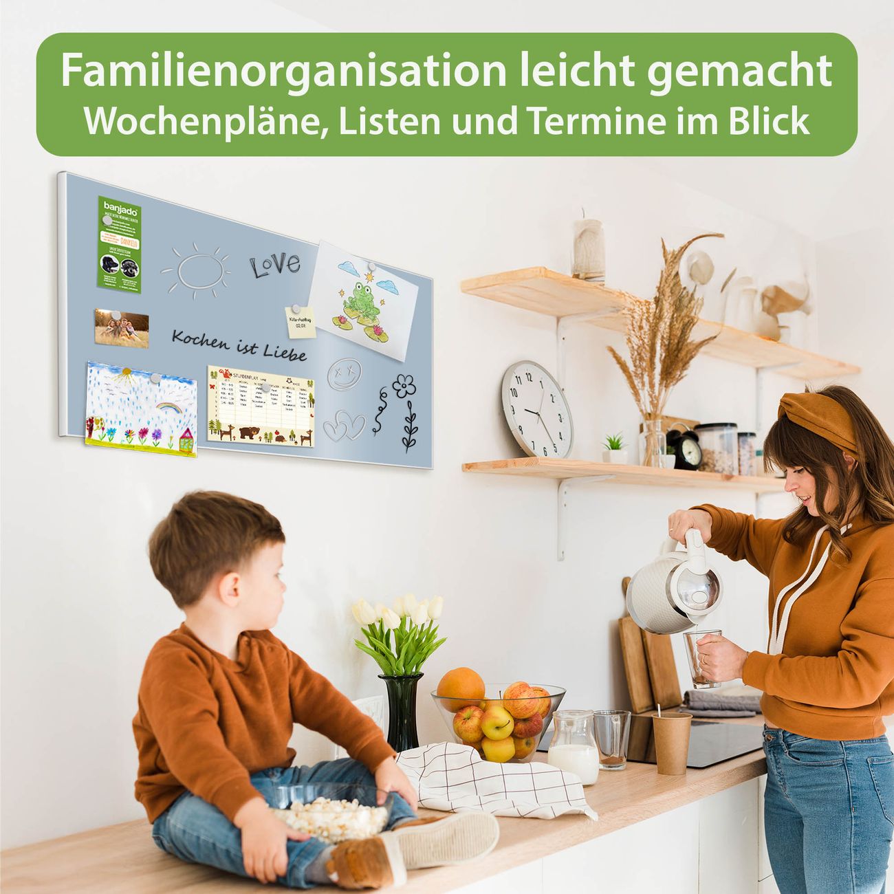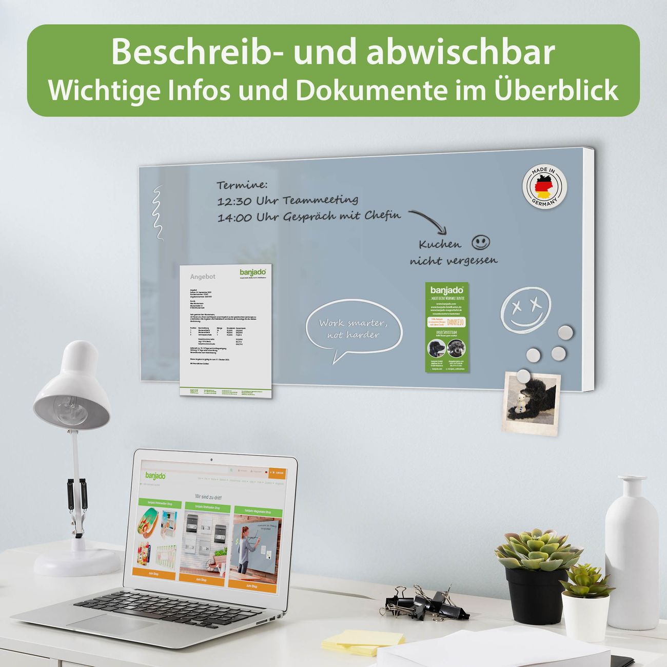 FUNKTION: Die banjado Magnettafel 78x37 cm im Design Farbe Schieferblau vereint Funktionalität und modernes Wohndesign auf stilvolle Weise. Diese hochwertige Magnetwand aus Metall hilft Ihnen dabei, Notizen, Fotos, Termine, Einkaufslisten oder Rezepte übersichtlich zu organisieren. Als praktisches Memoboard sorgt sie für Struktur im Alltag und setzt gleichzeitig einen dekorativen Akzent an Ihrer Wand. DESIGN: Die Metalltafel besteht aus robustem, lackiertem Stahl und ist mit allen handelsüblichen Magneten nutzbar. Besonders praktisch ist die beschreibbare Oberfläche. Sie können die Magnettafel ganz einfach mit Kreidestiften beschriften und die Inhalte bei Bedarf mit einem feuchten Tuch wieder entfernen. So eignet sich das Memoboard ideal für Wochenpläne, Menüpläne, To Do Listen oder kreative Botschaften. DETAILS: Mit ihrem großzügigen Querformat von 78x37 cm bietet die Magnettafel ausreichend Platz für Ihre Organisation. Das Motiv Farbe Schieferblau bringt eine warme, natürliche Optik in Küche, Flur, Büro oder Homeoffice und wirkt auch ohne Magnete oder Beschriftung wie ein modernes Wandbild. NUTZEN: Auf der Rückseite befinden sich vorgefertigte Löcher für eine schnelle und unkomplizierte Wandmontage. Jede banjado Magnettafel wird in Deutschland gefertigt und steht für Qualität, Langlebigkeit und liebevolle Verarbeitung. Dieses beschreibbare Memoboard ist die perfekte Kombination aus Metalltafel, Designobjekt und praktischer Magnetwand für Ihren Alltag. BANJADO: Wir sind ein kleines Team aus dem Herzen von Sachsen. Wir fertigen alle Artikel von Hand für Sie an, Sie erhalten keine preiswerte Importware. Auf Wunsch können Sie auch Ihr eigenes Foto auf die Magnettafel aufbringen, schreiben Sie uns an. Herzlichst, Ihr banjado-Team