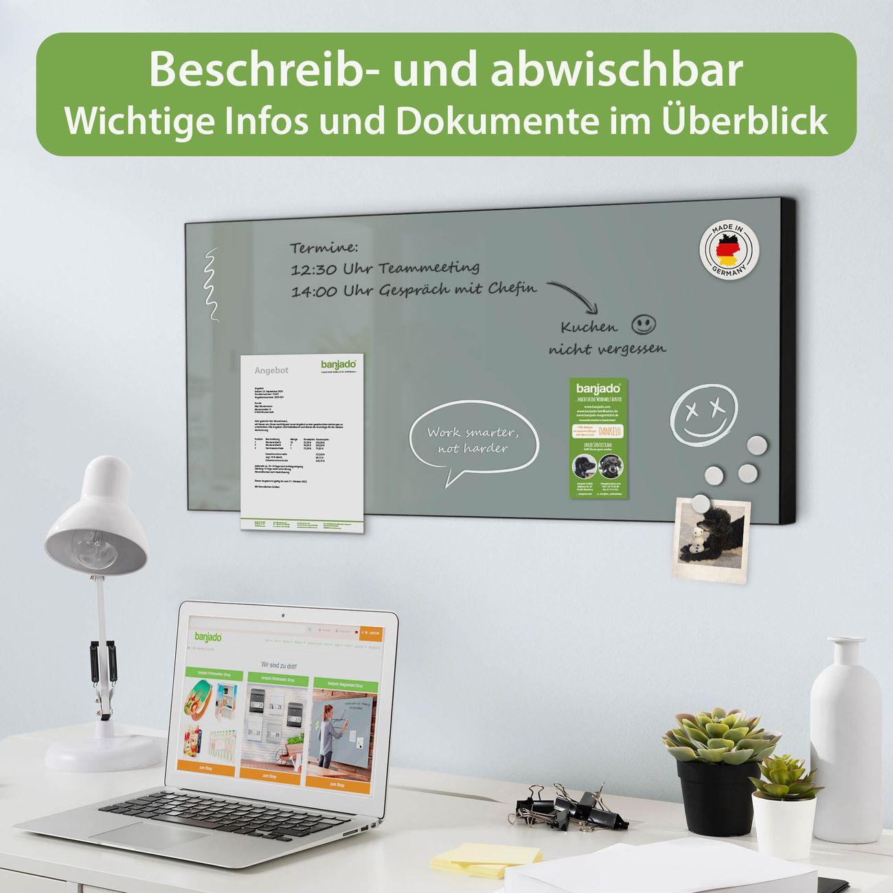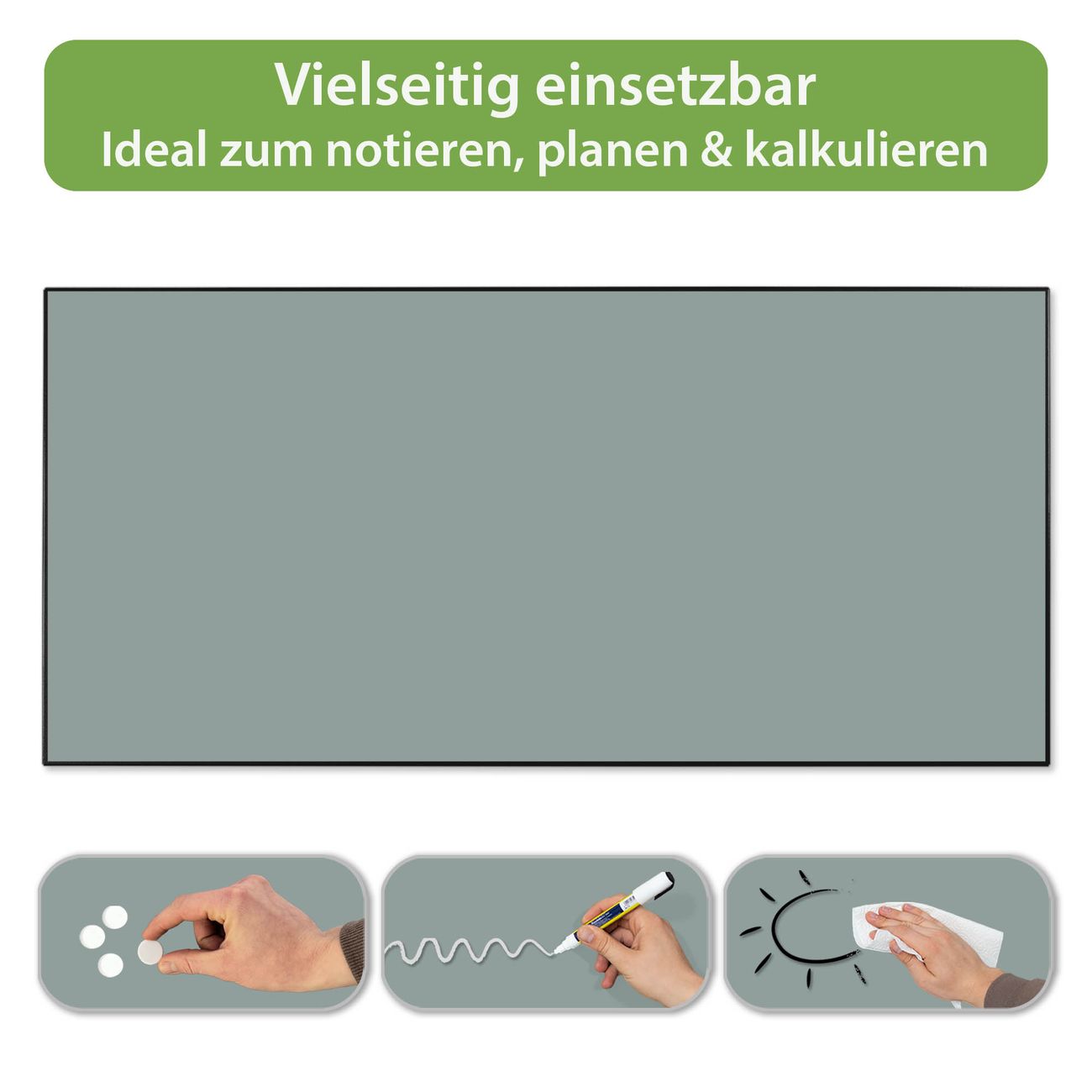 FUNKTION: Die banjado Magnettafel 78x37 cm im Design Farbe Steingrau vereint Funktionalität und modernes Wohndesign auf stilvolle Weise. Diese hochwertige Magnetwand aus Metall hilft Ihnen dabei, Notizen, Fotos, Termine, Einkaufslisten oder Rezepte übersichtlich zu organisieren. Als praktisches Memoboard sorgt sie für Struktur im Alltag und setzt gleichzeitig einen dekorativen Akzent an Ihrer Wand. DESIGN: Die Metalltafel besteht aus robustem, lackiertem Stahl und ist mit allen handelsüblichen Magneten nutzbar. Besonders praktisch ist die beschreibbare Oberfläche. Sie können die Magnettafel ganz einfach mit Kreidestiften beschriften und die Inhalte bei Bedarf mit einem feuchten Tuch wieder entfernen. So eignet sich das Memoboard ideal für Wochenpläne, Menüpläne, To Do Listen oder kreative Botschaften. DETAILS: Mit ihrem großzügigen Querformat von 78x37 cm bietet die Magnettafel ausreichend Platz für Ihre Organisation. Das Motiv Farbe Steingrau bringt eine warme, natürliche Optik in Küche, Flur, Büro oder Homeoffice und wirkt auch ohne Magnete oder Beschriftung wie ein modernes Wandbild. NUTZEN: Auf der Rückseite befinden sich vorgefertigte Löcher für eine schnelle und unkomplizierte Wandmontage. Jede banjado Magnettafel wird in Deutschland gefertigt und steht für Qualität, Langlebigkeit und liebevolle Verarbeitung. Dieses beschreibbare Memoboard ist die perfekte Kombination aus Metalltafel, Designobjekt und praktischer Magnetwand für Ihren Alltag. BANJADO: Wir sind ein kleines Team aus dem Herzen von Sachsen. Wir fertigen alle Artikel von Hand für Sie an, Sie erhalten keine preiswerte Importware. Auf Wunsch können Sie auch Ihr eigenes Foto auf die Magnettafel aufbringen, schreiben Sie uns an. Herzlichst, Ihr banjado-Team