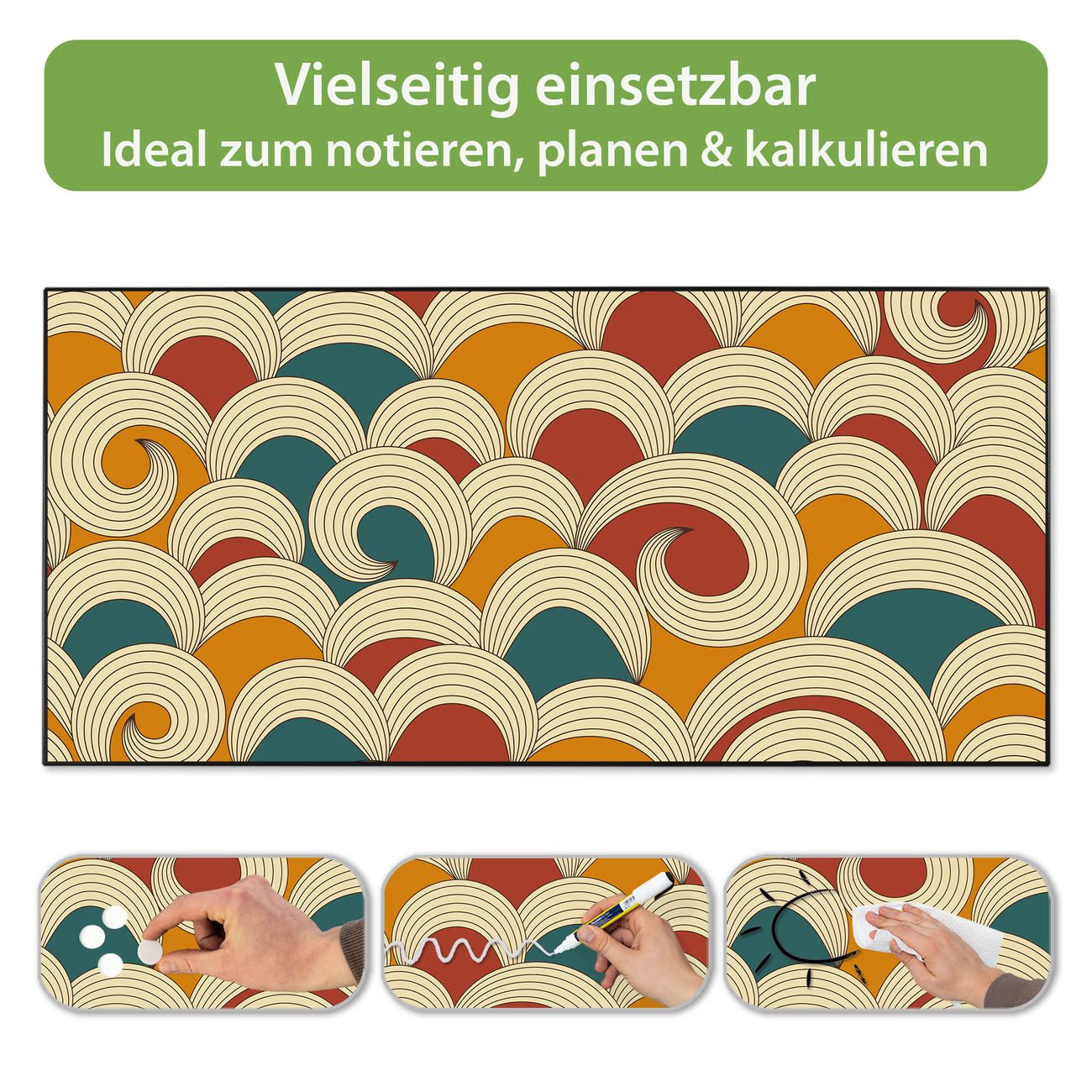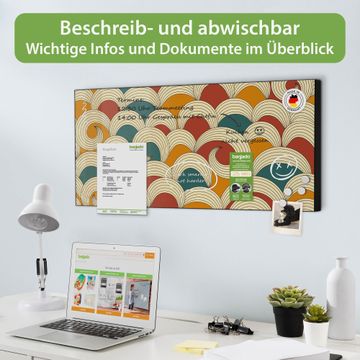 FUNKTION: Die banjado Magnettafel 78x37 cm im Design Motiv Abstract Waves vereint Funktionalität und modernes Wohndesign auf stilvolle Weise. Diese hochwertige Magnetwand aus Metall hilft Ihnen dabei, Notizen, Fotos, Termine, Einkaufslisten oder Rezepte übersichtlich zu organisieren. Als praktisches Memoboard sorgt sie für Struktur im Alltag und setzt gleichzeitig einen dekorativen Akzent an Ihrer Wand. DESIGN: Die Metalltafel besteht aus robustem, lackiertem Stahl und ist mit allen handelsüblichen Magneten nutzbar. Besonders praktisch ist die beschreibbare Oberfläche. Sie können die Magnettafel ganz einfach mit Kreidestiften beschriften und die Inhalte bei Bedarf mit einem feuchten Tuch wieder entfernen. So eignet sich das Memoboard ideal für Wochenpläne, Menüpläne, To Do Listen oder kreative Botschaften. DETAILS: Mit ihrem großzügigen Querformat von 78x37 cm bietet die Magnettafel ausreichend Platz für Ihre Organisation. Das Motiv Motiv Abstract Waves bringt eine warme, natürliche Optik in Küche, Flur, Büro oder Homeoffice und wirkt auch ohne Magnete oder Beschriftung wie ein modernes Wandbild. NUTZEN: Auf der Rückseite befinden sich vorgefertigte Löcher für eine schnelle und unkomplizierte Wandmontage. Jede banjado Magnettafel wird in Deutschland gefertigt und steht für Qualität, Langlebigkeit und liebevolle Verarbeitung. Dieses beschreibbare Memoboard ist die perfekte Kombination aus Metalltafel, Designobjekt und praktischer Magnetwand für Ihren Alltag. BANJADO: Wir sind ein kleines Team aus dem Herzen von Sachsen. Wir fertigen alle Artikel von Hand für Sie an, Sie erhalten keine preiswerte Importware. Auf Wunsch können Sie auch Ihr eigenes Foto auf die Magnettafel aufbringen, schreiben Sie uns an. Herzlichst, Ihr banjado-Team