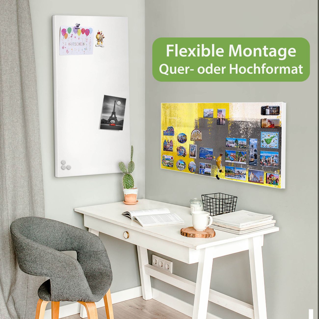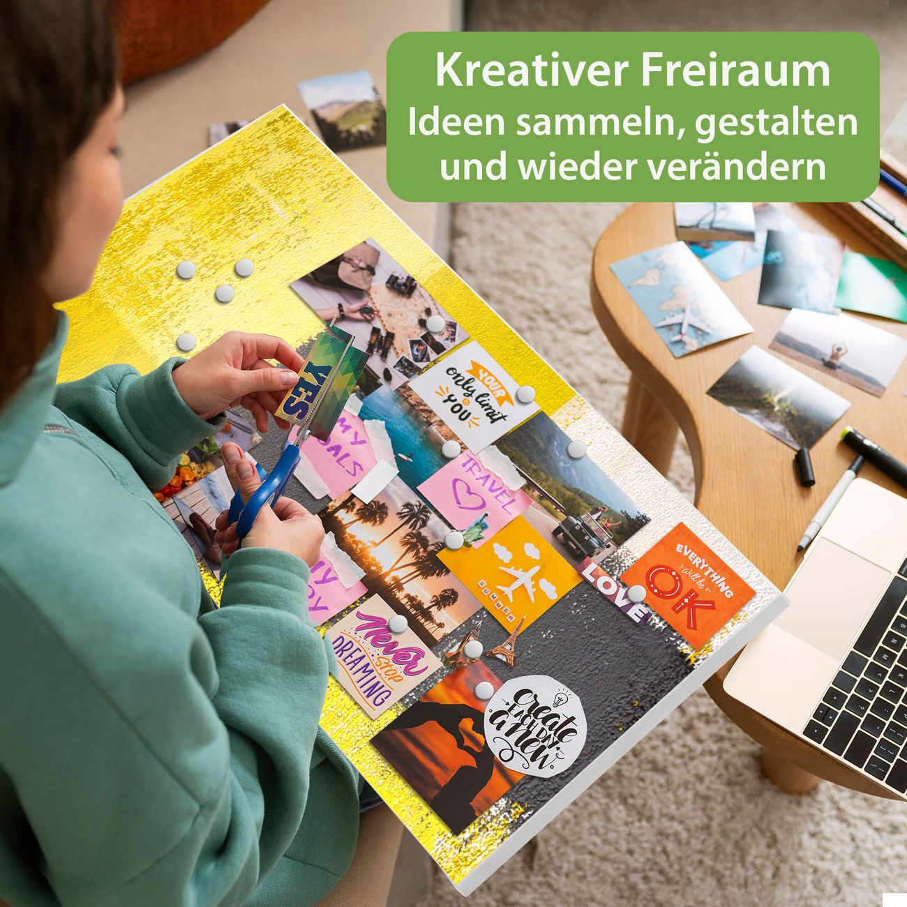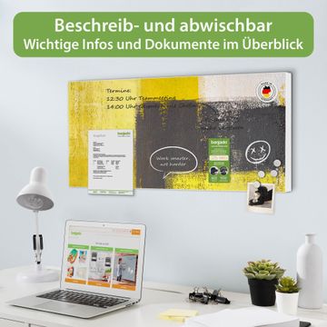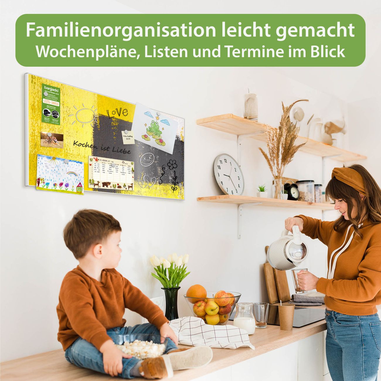 FUNKTION: Die banjado Magnettafel 78x37 cm im Design Motiv Abstrakt Gelb vereint Funktionalität und modernes Wohndesign auf stilvolle Weise. Diese hochwertige Magnetwand aus Metall hilft Ihnen dabei, Notizen, Fotos, Termine, Einkaufslisten oder Rezepte übersichtlich zu organisieren. Als praktisches Memoboard sorgt sie für Struktur im Alltag und setzt gleichzeitig einen dekorativen Akzent an Ihrer Wand. DESIGN: Die Metalltafel besteht aus robustem, lackiertem Stahl und ist mit allen handelsüblichen Magneten nutzbar. Besonders praktisch ist die beschreibbare Oberfläche. Sie können die Magnettafel ganz einfach mit Kreidestiften beschriften und die Inhalte bei Bedarf mit einem feuchten Tuch wieder entfernen. So eignet sich das Memoboard ideal für Wochenpläne, Menüpläne, To Do Listen oder kreative Botschaften. DETAILS: Mit ihrem großzügigen Querformat von 78x37 cm bietet die Magnettafel ausreichend Platz für Ihre Organisation. Das Motiv Motiv Abstrakt Gelb bringt eine warme, natürliche Optik in Küche, Flur, Büro oder Homeoffice und wirkt auch ohne Magnete oder Beschriftung wie ein modernes Wandbild. NUTZEN: Auf der Rückseite befinden sich vorgefertigte Löcher für eine schnelle und unkomplizierte Wandmontage. Jede banjado Magnettafel wird in Deutschland gefertigt und steht für Qualität, Langlebigkeit und liebevolle Verarbeitung. Dieses beschreibbare Memoboard ist die perfekte Kombination aus Metalltafel, Designobjekt und praktischer Magnetwand für Ihren Alltag. BANJADO: Wir sind ein kleines Team aus dem Herzen von Sachsen. Wir fertigen alle Artikel von Hand für Sie an, Sie erhalten keine preiswerte Importware. Auf Wunsch können Sie auch Ihr eigenes Foto auf die Magnettafel aufbringen, schreiben Sie uns an. Herzlichst, Ihr banjado-Team