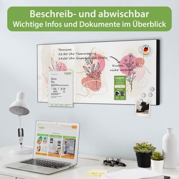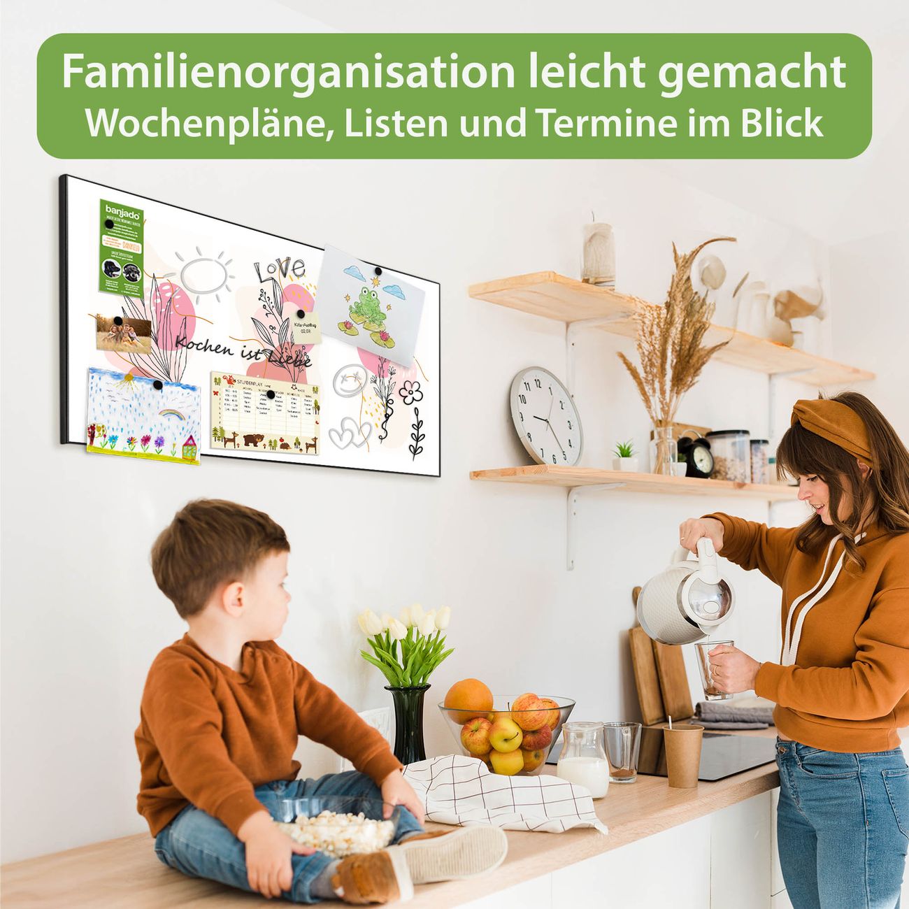 FUNKTION: Die banjado Magnettafel 78x37 cm im Design Motiv Abstrakte Blumenkomposition vereint Funktionalität und modernes Wohndesign auf stilvolle Weise. Diese hochwertige Magnetwand aus Metall hilft Ihnen dabei, Notizen, Fotos, Termine, Einkaufslisten oder Rezepte übersichtlich zu organisieren. Als praktisches Memoboard sorgt sie für Struktur im Alltag und setzt gleichzeitig einen dekorativen Akzent an Ihrer Wand. DESIGN: Die Metalltafel besteht aus robustem, lackiertem Stahl und ist mit allen handelsüblichen Magneten nutzbar. Besonders praktisch ist die beschreibbare Oberfläche. Sie können die Magnettafel ganz einfach mit Kreidestiften beschriften und die Inhalte bei Bedarf mit einem feuchten Tuch wieder entfernen. So eignet sich das Memoboard ideal für Wochenpläne, Menüpläne, To Do Listen oder kreative Botschaften. DETAILS: Mit ihrem großzügigen Querformat von 78x37 cm bietet die Magnettafel ausreichend Platz für Ihre Organisation. Das Motiv Motiv Abstrakte Blumenkomposition bringt eine warme, natürliche Optik in Küche, Flur, Büro oder Homeoffice und wirkt auch ohne Magnete oder Beschriftung wie ein modernes Wandbild. NUTZEN: Auf der Rückseite befinden sich vorgefertigte Löcher für eine schnelle und unkomplizierte Wandmontage. Jede banjado Magnettafel wird in Deutschland gefertigt und steht für Qualität, Langlebigkeit und liebevolle Verarbeitung. Dieses beschreibbare Memoboard ist die perfekte Kombination aus Metalltafel, Designobjekt und praktischer Magnetwand für Ihren Alltag. BANJADO: Wir sind ein kleines Team aus dem Herzen von Sachsen. Wir fertigen alle Artikel von Hand für Sie an, Sie erhalten keine preiswerte Importware. Auf Wunsch können Sie auch Ihr eigenes Foto auf die Magnettafel aufbringen, schreiben Sie uns an. Herzlichst, Ihr banjado-Team