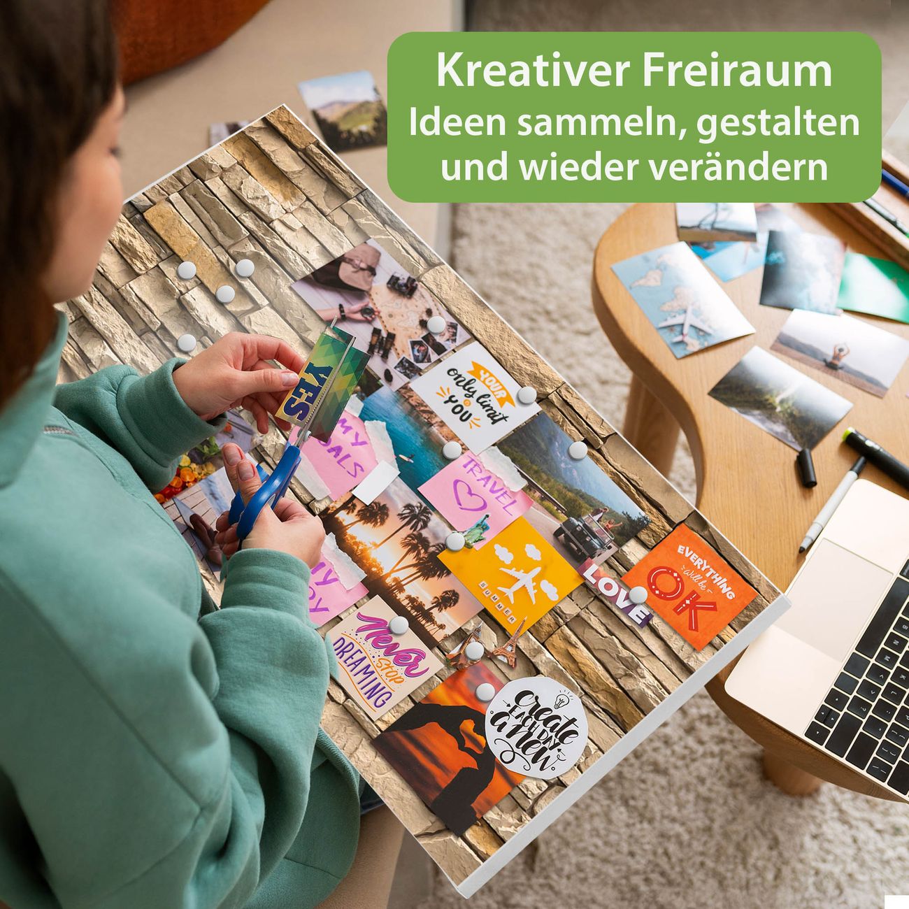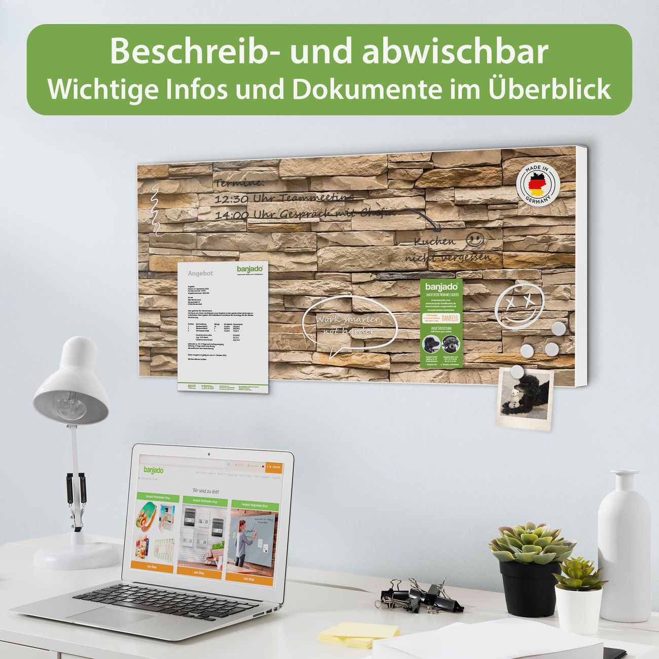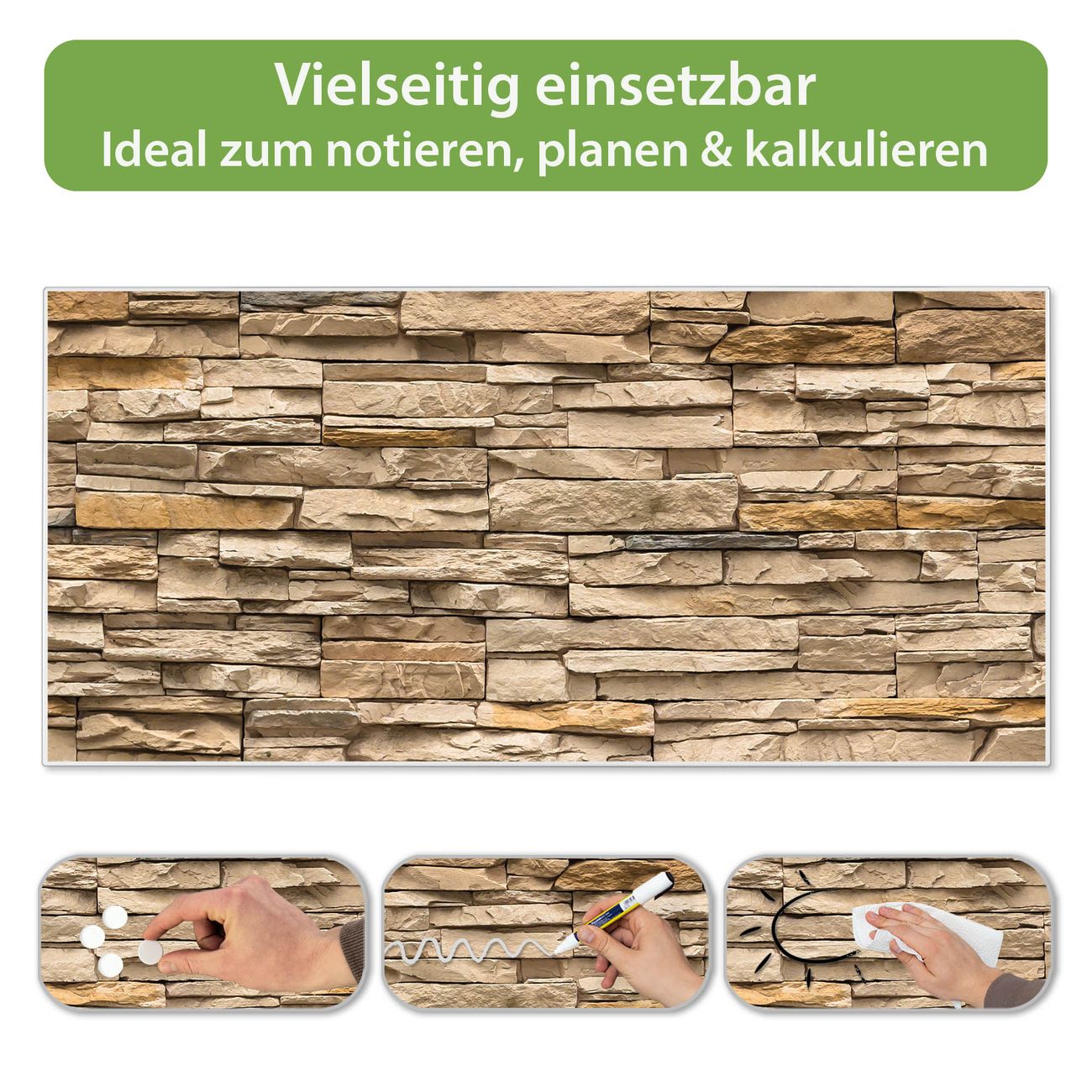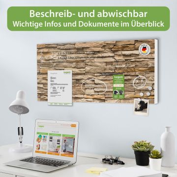 FUNKTION: Die banjado Magnettafel 78x37 cm im Design Motiv Alte Mauer vereint Funktionalität und modernes Wohndesign auf stilvolle Weise. Diese hochwertige Magnetwand aus Metall hilft Ihnen dabei, Notizen, Fotos, Termine, Einkaufslisten oder Rezepte übersichtlich zu organisieren. Als praktisches Memoboard sorgt sie für Struktur im Alltag und setzt gleichzeitig einen dekorativen Akzent an Ihrer Wand. DESIGN: Die Metalltafel besteht aus robustem, lackiertem Stahl und ist mit allen handelsüblichen Magneten nutzbar. Besonders praktisch ist die beschreibbare Oberfläche. Sie können die Magnettafel ganz einfach mit Kreidestiften beschriften und die Inhalte bei Bedarf mit einem feuchten Tuch wieder entfernen. So eignet sich das Memoboard ideal für Wochenpläne, Menüpläne, To Do Listen oder kreative Botschaften. DETAILS: Mit ihrem großzügigen Querformat von 78x37 cm bietet die Magnettafel ausreichend Platz für Ihre Organisation. Das Motiv Motiv Alte Mauer bringt eine warme, natürliche Optik in Küche, Flur, Büro oder Homeoffice und wirkt auch ohne Magnete oder Beschriftung wie ein modernes Wandbild. NUTZEN: Auf der Rückseite befinden sich vorgefertigte Löcher für eine schnelle und unkomplizierte Wandmontage. Jede banjado Magnettafel wird in Deutschland gefertigt und steht für Qualität, Langlebigkeit und liebevolle Verarbeitung. Dieses beschreibbare Memoboard ist die perfekte Kombination aus Metalltafel, Designobjekt und praktischer Magnetwand für Ihren Alltag. BANJADO: Wir sind ein kleines Team aus dem Herzen von Sachsen. Wir fertigen alle Artikel von Hand für Sie an, Sie erhalten keine preiswerte Importware. Auf Wunsch können Sie auch Ihr eigenes Foto auf die Magnettafel aufbringen, schreiben Sie uns an. Herzlichst, Ihr banjado-Team
