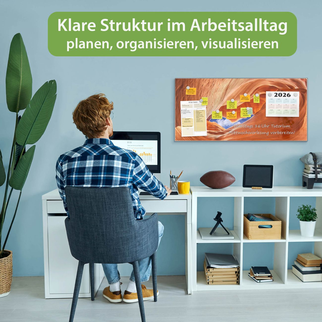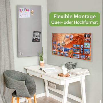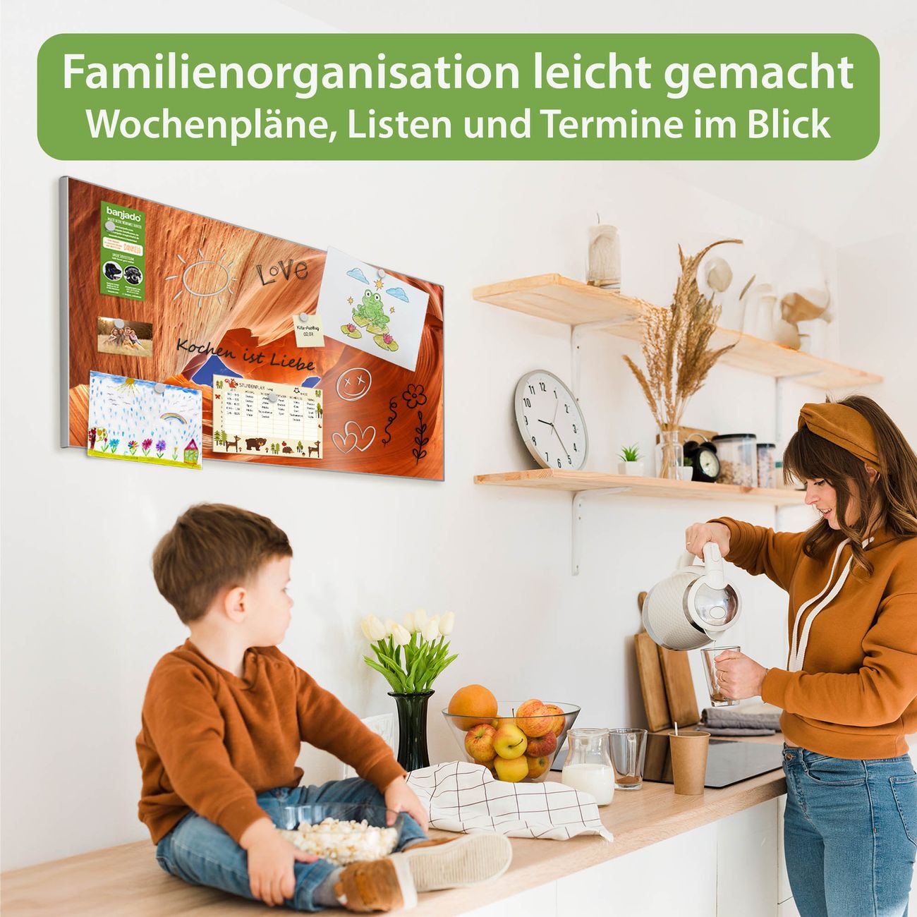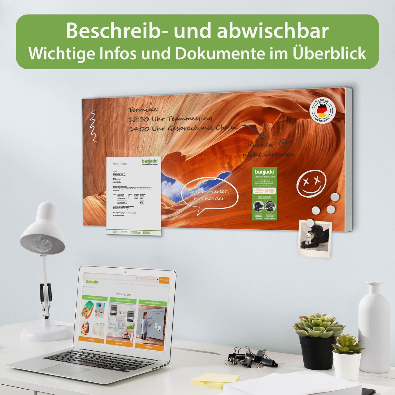 FUNKTION: Die banjado Magnettafel 78x37 cm im Design Motiv Antelope Canyon 3 vereint Funktionalität und modernes Wohndesign auf stilvolle Weise. Diese hochwertige Magnetwand aus Metall hilft Ihnen dabei, Notizen, Fotos, Termine, Einkaufslisten oder Rezepte übersichtlich zu organisieren. Als praktisches Memoboard sorgt sie für Struktur im Alltag und setzt gleichzeitig einen dekorativen Akzent an Ihrer Wand. DESIGN: Die Metalltafel besteht aus robustem, lackiertem Stahl und ist mit allen handelsüblichen Magneten nutzbar. Besonders praktisch ist die beschreibbare Oberfläche. Sie können die Magnettafel ganz einfach mit Kreidestiften beschriften und die Inhalte bei Bedarf mit einem feuchten Tuch wieder entfernen. So eignet sich das Memoboard ideal für Wochenpläne, Menüpläne, To Do Listen oder kreative Botschaften. DETAILS: Mit ihrem großzügigen Querformat von 78x37 cm bietet die Magnettafel ausreichend Platz für Ihre Organisation. Das Motiv Motiv Antelope Canyon 3 bringt eine warme, natürliche Optik in Küche, Flur, Büro oder Homeoffice und wirkt auch ohne Magnete oder Beschriftung wie ein modernes Wandbild. NUTZEN: Auf der Rückseite befinden sich vorgefertigte Löcher für eine schnelle und unkomplizierte Wandmontage. Jede banjado Magnettafel wird in Deutschland gefertigt und steht für Qualität, Langlebigkeit und liebevolle Verarbeitung. Dieses beschreibbare Memoboard ist die perfekte Kombination aus Metalltafel, Designobjekt und praktischer Magnetwand für Ihren Alltag. BANJADO: Wir sind ein kleines Team aus dem Herzen von Sachsen. Wir fertigen alle Artikel von Hand für Sie an, Sie erhalten keine preiswerte Importware. Auf Wunsch können Sie auch Ihr eigenes Foto auf die Magnettafel aufbringen, schreiben Sie uns an. Herzlichst, Ihr banjado-Team