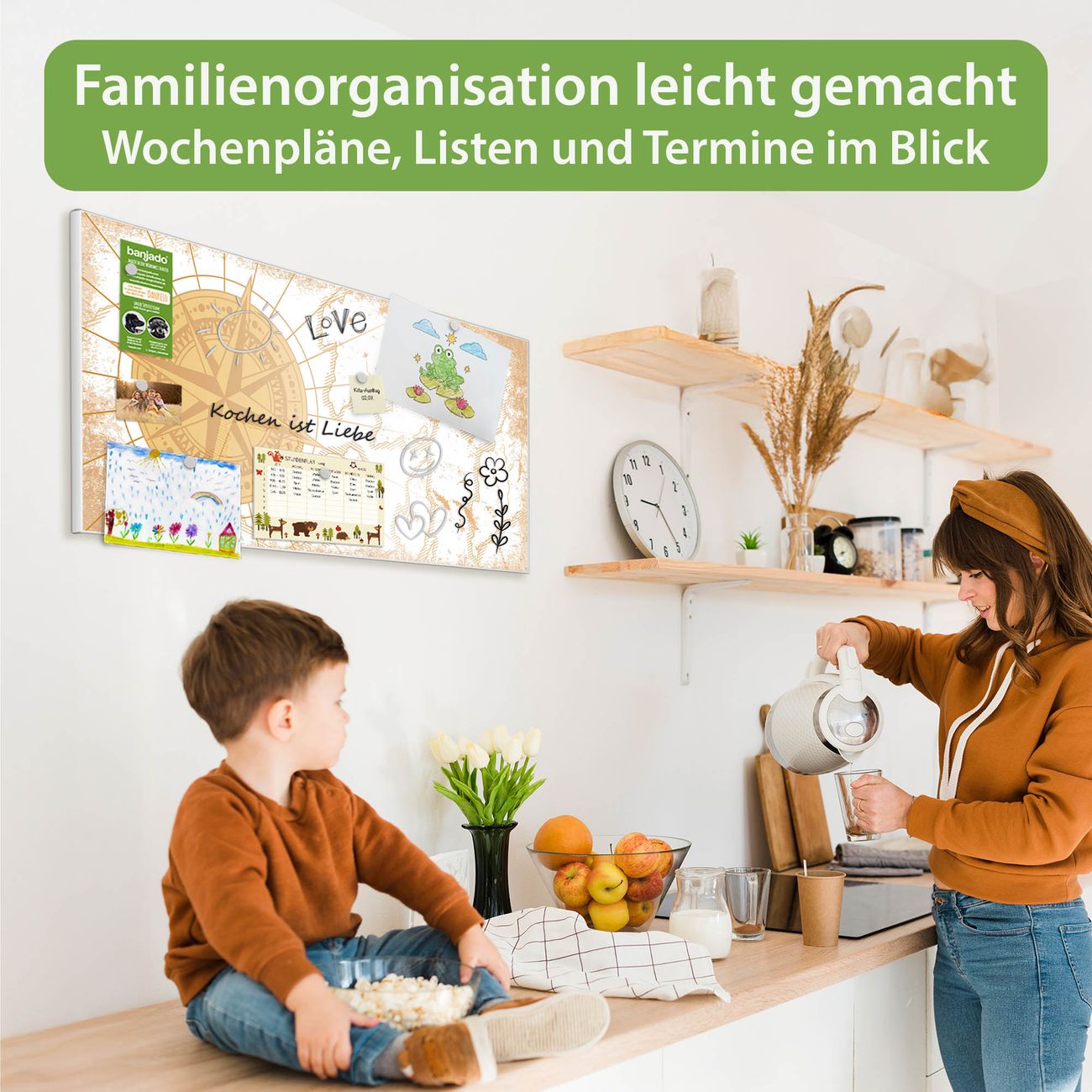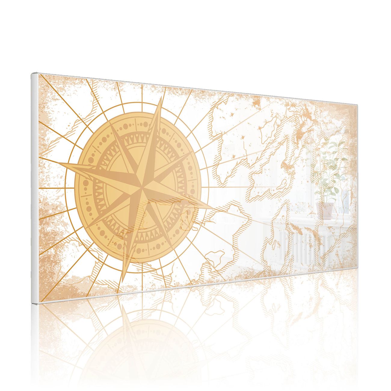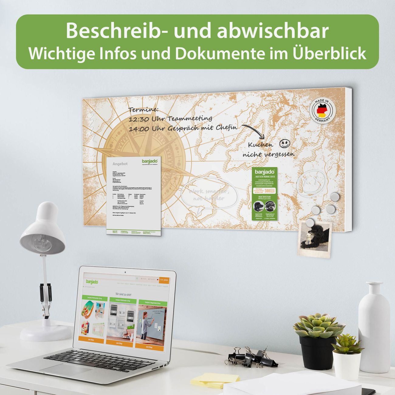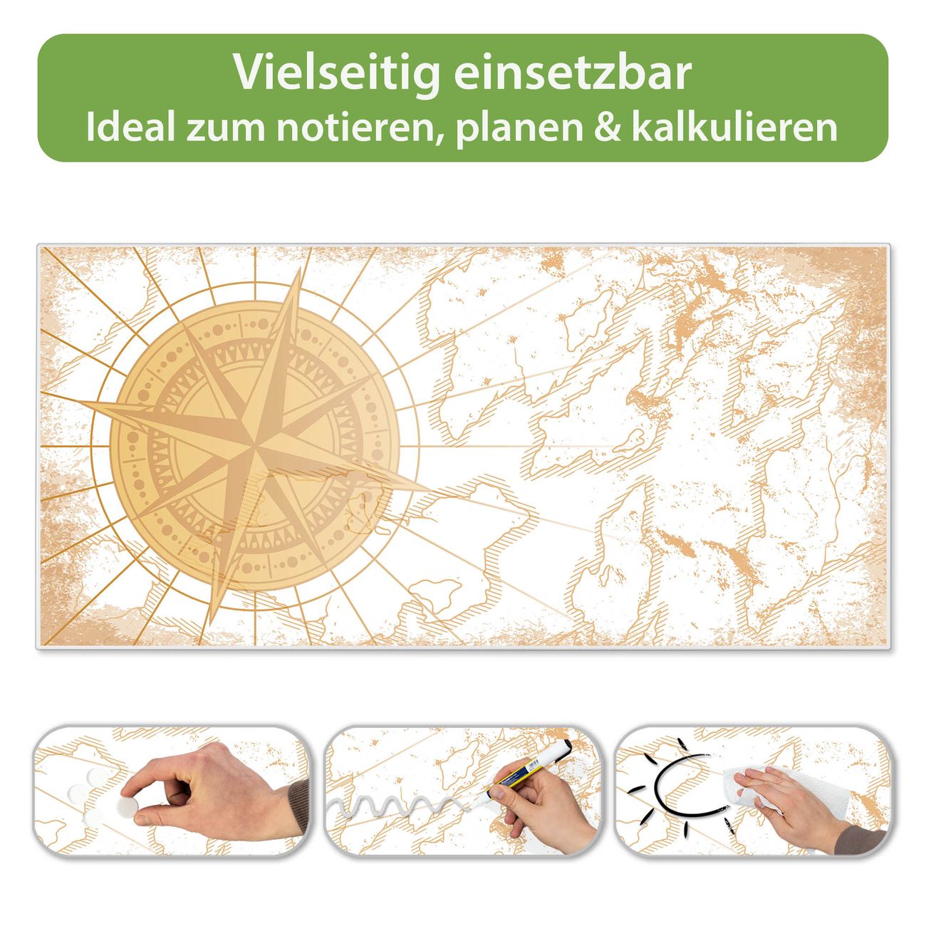 FUNKTION: Die banjado Magnettafel 78x37 cm im Design Motiv Antike Kompassrose vereint Funktionalität und modernes Wohndesign auf stilvolle Weise. Diese hochwertige Magnetwand aus Metall hilft Ihnen dabei, Notizen, Fotos, Termine, Einkaufslisten oder Rezepte übersichtlich zu organisieren. Als praktisches Memoboard sorgt sie für Struktur im Alltag und setzt gleichzeitig einen dekorativen Akzent an Ihrer Wand. DESIGN: Die Metalltafel besteht aus robustem, lackiertem Stahl und ist mit allen handelsüblichen Magneten nutzbar. Besonders praktisch ist die beschreibbare Oberfläche. Sie können die Magnettafel ganz einfach mit Kreidestiften beschriften und die Inhalte bei Bedarf mit einem feuchten Tuch wieder entfernen. So eignet sich das Memoboard ideal für Wochenpläne, Menüpläne, To Do Listen oder kreative Botschaften. DETAILS: Mit ihrem großzügigen Querformat von 78x37 cm bietet die Magnettafel ausreichend Platz für Ihre Organisation. Das Motiv Motiv Antike Kompassrose bringt eine warme, natürliche Optik in Küche, Flur, Büro oder Homeoffice und wirkt auch ohne Magnete oder Beschriftung wie ein modernes Wandbild. NUTZEN: Auf der Rückseite befinden sich vorgefertigte Löcher für eine schnelle und unkomplizierte Wandmontage. Jede banjado Magnettafel wird in Deutschland gefertigt und steht für Qualität, Langlebigkeit und liebevolle Verarbeitung. Dieses beschreibbare Memoboard ist die perfekte Kombination aus Metalltafel, Designobjekt und praktischer Magnetwand für Ihren Alltag. BANJADO: Wir sind ein kleines Team aus dem Herzen von Sachsen. Wir fertigen alle Artikel von Hand für Sie an, Sie erhalten keine preiswerte Importware. Auf Wunsch können Sie auch Ihr eigenes Foto auf die Magnettafel aufbringen, schreiben Sie uns an. Herzlichst, Ihr banjado-Team