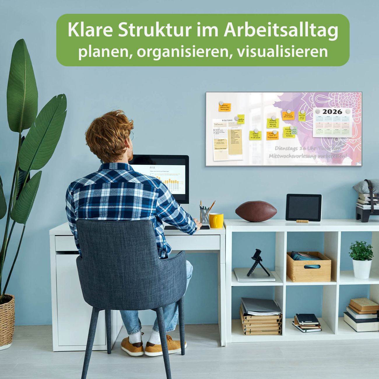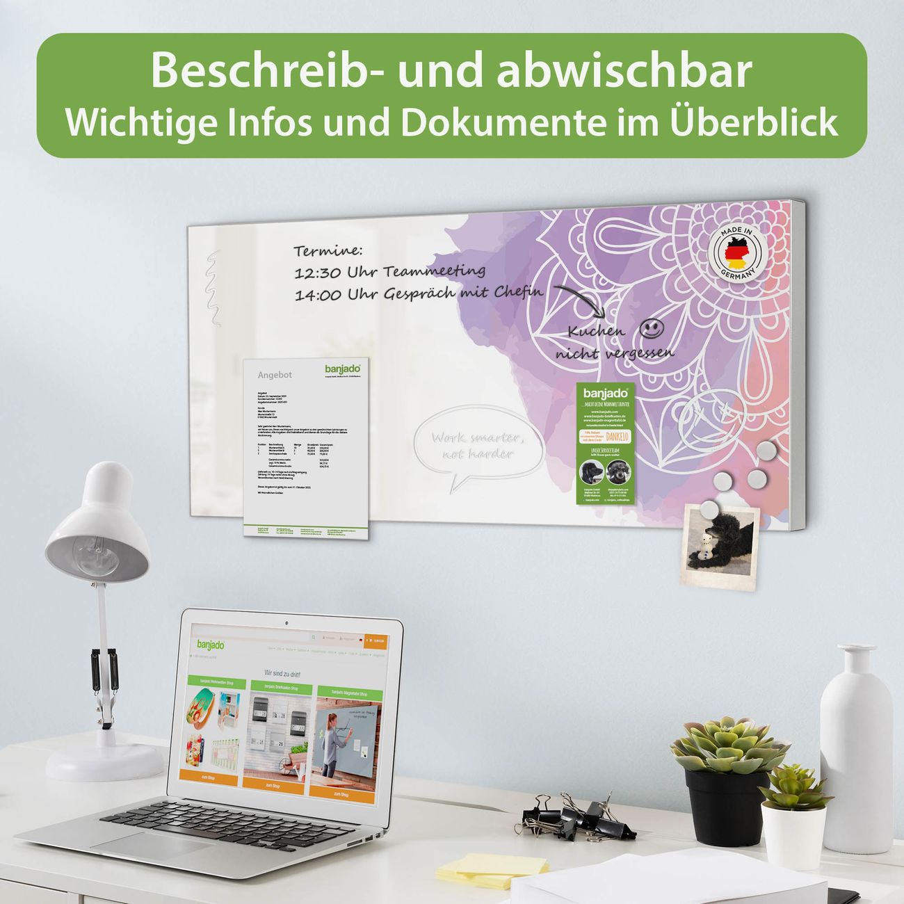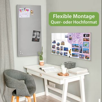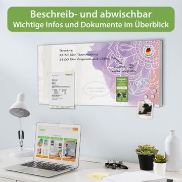 FUNKTION: Die banjado Magnettafel 78x37 cm im Design Motiv Aquarell Mandala vereint Funktionalität und modernes Wohndesign auf stilvolle Weise. Diese hochwertige Magnetwand aus Metall hilft Ihnen dabei, Notizen, Fotos, Termine, Einkaufslisten oder Rezepte übersichtlich zu organisieren. Als praktisches Memoboard sorgt sie für Struktur im Alltag und setzt gleichzeitig einen dekorativen Akzent an Ihrer Wand. DESIGN: Die Metalltafel besteht aus robustem, lackiertem Stahl und ist mit allen handelsüblichen Magneten nutzbar. Besonders praktisch ist die beschreibbare Oberfläche. Sie können die Magnettafel ganz einfach mit Kreidestiften beschriften und die Inhalte bei Bedarf mit einem feuchten Tuch wieder entfernen. So eignet sich das Memoboard ideal für Wochenpläne, Menüpläne, To Do Listen oder kreative Botschaften. DETAILS: Mit ihrem großzügigen Querformat von 78x37 cm bietet die Magnettafel ausreichend Platz für Ihre Organisation. Das Motiv Motiv Aquarell Mandala bringt eine warme, natürliche Optik in Küche, Flur, Büro oder Homeoffice und wirkt auch ohne Magnete oder Beschriftung wie ein modernes Wandbild. NUTZEN: Auf der Rückseite befinden sich vorgefertigte Löcher für eine schnelle und unkomplizierte Wandmontage. Jede banjado Magnettafel wird in Deutschland gefertigt und steht für Qualität, Langlebigkeit und liebevolle Verarbeitung. Dieses beschreibbare Memoboard ist die perfekte Kombination aus Metalltafel, Designobjekt und praktischer Magnetwand für Ihren Alltag. BANJADO: Wir sind ein kleines Team aus dem Herzen von Sachsen. Wir fertigen alle Artikel von Hand für Sie an, Sie erhalten keine preiswerte Importware. Auf Wunsch können Sie auch Ihr eigenes Foto auf die Magnettafel aufbringen, schreiben Sie uns an. Herzlichst, Ihr banjado-Team