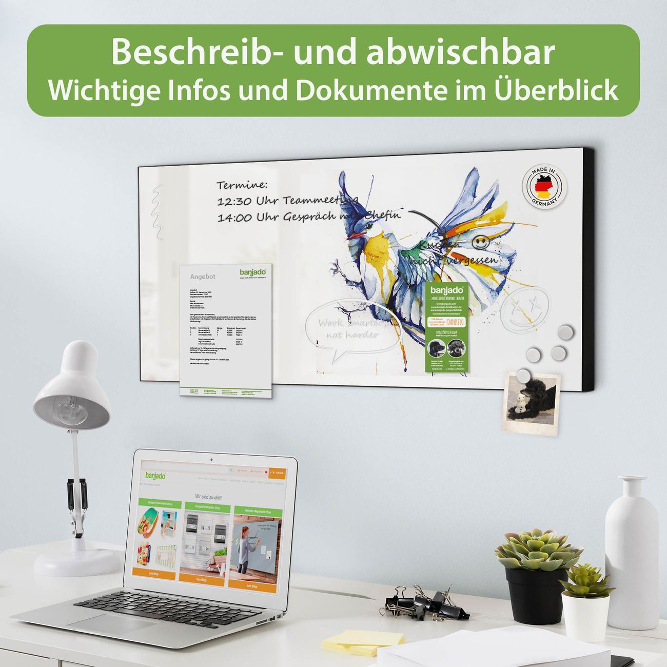 FUNKTION: Die banjado Magnettafel 78x37 cm im Design Motiv Aquarell Vogel vereint Funktionalität und modernes Wohndesign auf stilvolle Weise. Diese hochwertige Magnetwand aus Metall hilft Ihnen dabei, Notizen, Fotos, Termine, Einkaufslisten oder Rezepte übersichtlich zu organisieren. Als praktisches Memoboard sorgt sie für Struktur im Alltag und setzt gleichzeitig einen dekorativen Akzent an Ihrer Wand. DESIGN: Die Metalltafel besteht aus robustem, lackiertem Stahl und ist mit allen handelsüblichen Magneten nutzbar. Besonders praktisch ist die beschreibbare Oberfläche. Sie können die Magnettafel ganz einfach mit Kreidestiften beschriften und die Inhalte bei Bedarf mit einem feuchten Tuch wieder entfernen. So eignet sich das Memoboard ideal für Wochenpläne, Menüpläne, To Do Listen oder kreative Botschaften. DETAILS: Mit ihrem großzügigen Querformat von 78x37 cm bietet die Magnettafel ausreichend Platz für Ihre Organisation. Das Motiv Motiv Aquarell Vogel bringt eine warme, natürliche Optik in Küche, Flur, Büro oder Homeoffice und wirkt auch ohne Magnete oder Beschriftung wie ein modernes Wandbild. NUTZEN: Auf der Rückseite befinden sich vorgefertigte Löcher für eine schnelle und unkomplizierte Wandmontage. Jede banjado Magnettafel wird in Deutschland gefertigt und steht für Qualität, Langlebigkeit und liebevolle Verarbeitung. Dieses beschreibbare Memoboard ist die perfekte Kombination aus Metalltafel, Designobjekt und praktischer Magnetwand für Ihren Alltag. BANJADO: Wir sind ein kleines Team aus dem Herzen von Sachsen. Wir fertigen alle Artikel von Hand für Sie an, Sie erhalten keine preiswerte Importware. Auf Wunsch können Sie auch Ihr eigenes Foto auf die Magnettafel aufbringen, schreiben Sie uns an. Herzlichst, Ihr banjado-Team