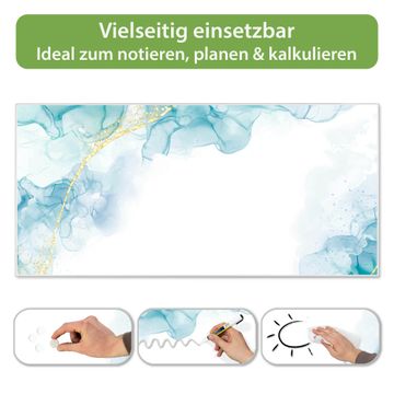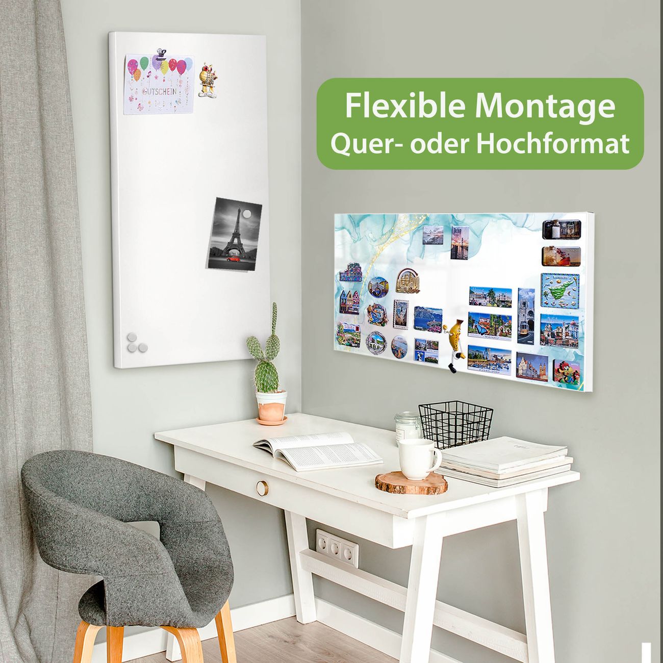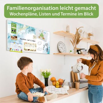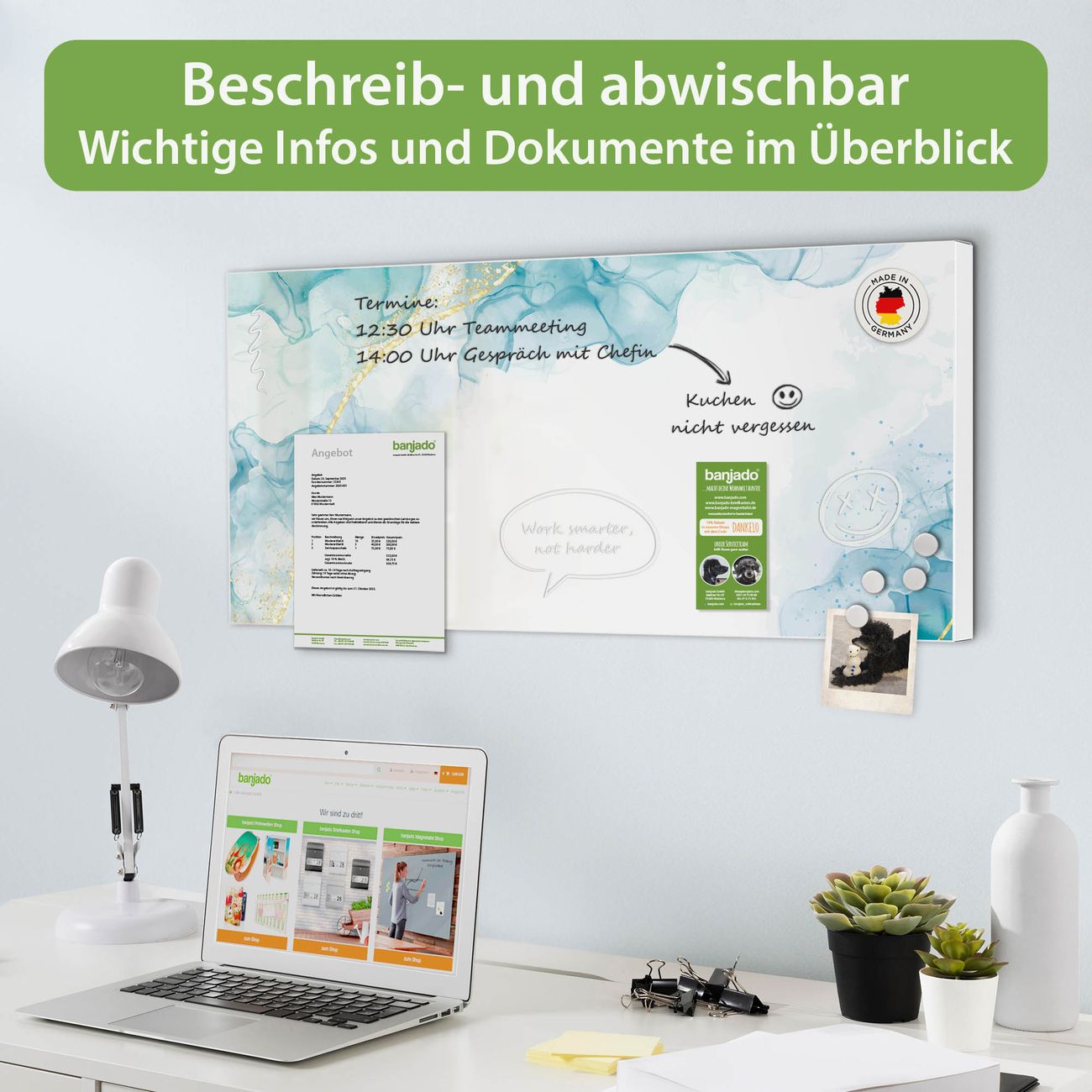FUNKTION: Die banjado Magnettafel 78x37 cm im Design Motiv Aquarellfluss vereint Funktionalität und modernes Wohndesign auf stilvolle Weise. Diese hochwertige Magnetwand aus Metall hilft Ihnen dabei, Notizen, Fotos, Termine, Einkaufslisten oder Rezepte übersichtlich zu organisieren. Als praktisches Memoboard sorgt sie für Struktur im Alltag und setzt gleichzeitig einen dekorativen Akzent an Ihrer Wand. DESIGN: Die Metalltafel besteht aus robustem, lackiertem Stahl und ist mit allen handelsüblichen Magneten nutzbar. Besonders praktisch ist die beschreibbare Oberfläche. Sie können die Magnettafel ganz einfach mit Kreidestiften beschriften und die Inhalte bei Bedarf mit einem feuchten Tuch wieder entfernen. So eignet sich das Memoboard ideal für Wochenpläne, Menüpläne, To Do Listen oder kreative Botschaften. DETAILS: Mit ihrem großzügigen Querformat von 78x37 cm bietet die Magnettafel ausreichend Platz für Ihre Organisation. Das Motiv Motiv Aquarellfluss bringt eine warme, natürliche Optik in Küche, Flur, Büro oder Homeoffice und wirkt auch ohne Magnete oder Beschriftung wie ein modernes Wandbild. NUTZEN: Auf der Rückseite befinden sich vorgefertigte Löcher für eine schnelle und unkomplizierte Wandmontage. Jede banjado Magnettafel wird in Deutschland gefertigt und steht für Qualität, Langlebigkeit und liebevolle Verarbeitung. Dieses beschreibbare Memoboard ist die perfekte Kombination aus Metalltafel, Designobjekt und praktischer Magnetwand für Ihren Alltag. BANJADO: Wir sind ein kleines Team aus dem Herzen von Sachsen. Wir fertigen alle Artikel von Hand für Sie an, Sie erhalten keine preiswerte Importware. Auf Wunsch können Sie auch Ihr eigenes Foto auf die Magnettafel aufbringen, schreiben Sie uns an. Herzlichst, Ihr banjado-Team