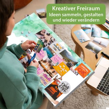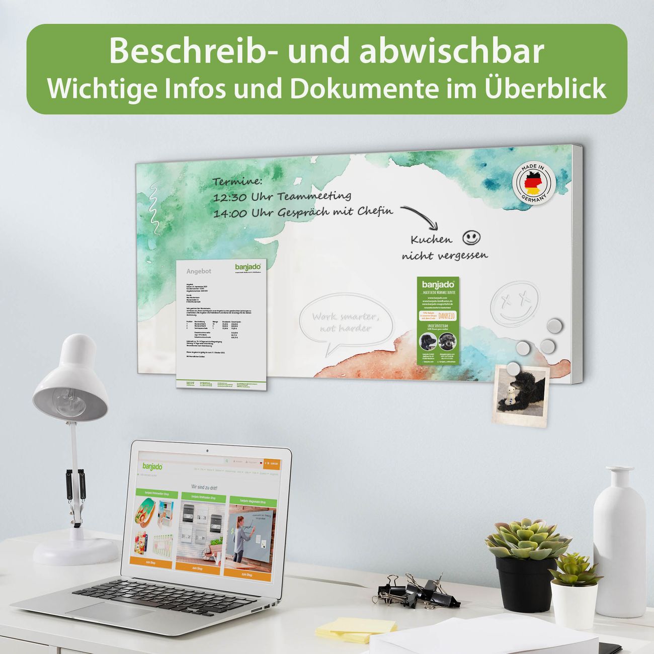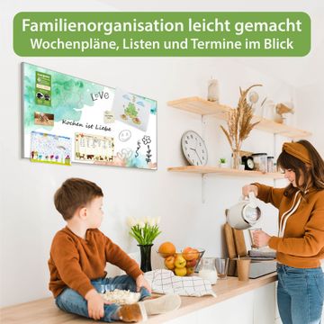FUNKTION: Die banjado Magnettafel 78x37 cm im Design Motiv Aquarellzauber vereint Funktionalität und modernes Wohndesign auf stilvolle Weise. Diese hochwertige Magnetwand aus Metall hilft Ihnen dabei, Notizen, Fotos, Termine, Einkaufslisten oder Rezepte übersichtlich zu organisieren. Als praktisches Memoboard sorgt sie für Struktur im Alltag und setzt gleichzeitig einen dekorativen Akzent an Ihrer Wand. DESIGN: Die Metalltafel besteht aus robustem, lackiertem Stahl und ist mit allen handelsüblichen Magneten nutzbar. Besonders praktisch ist die beschreibbare Oberfläche. Sie können die Magnettafel ganz einfach mit Kreidestiften beschriften und die Inhalte bei Bedarf mit einem feuchten Tuch wieder entfernen. So eignet sich das Memoboard ideal für Wochenpläne, Menüpläne, To Do Listen oder kreative Botschaften. DETAILS: Mit ihrem großzügigen Querformat von 78x37 cm bietet die Magnettafel ausreichend Platz für Ihre Organisation. Das Motiv Motiv Aquarellzauber bringt eine warme, natürliche Optik in Küche, Flur, Büro oder Homeoffice und wirkt auch ohne Magnete oder Beschriftung wie ein modernes Wandbild. NUTZEN: Auf der Rückseite befinden sich vorgefertigte Löcher für eine schnelle und unkomplizierte Wandmontage. Jede banjado Magnettafel wird in Deutschland gefertigt und steht für Qualität, Langlebigkeit und liebevolle Verarbeitung. Dieses beschreibbare Memoboard ist die perfekte Kombination aus Metalltafel, Designobjekt und praktischer Magnetwand für Ihren Alltag. BANJADO: Wir sind ein kleines Team aus dem Herzen von Sachsen. Wir fertigen alle Artikel von Hand für Sie an, Sie erhalten keine preiswerte Importware. Auf Wunsch können Sie auch Ihr eigenes Foto auf die Magnettafel aufbringen, schreiben Sie uns an. Herzlichst, Ihr banjado-Team