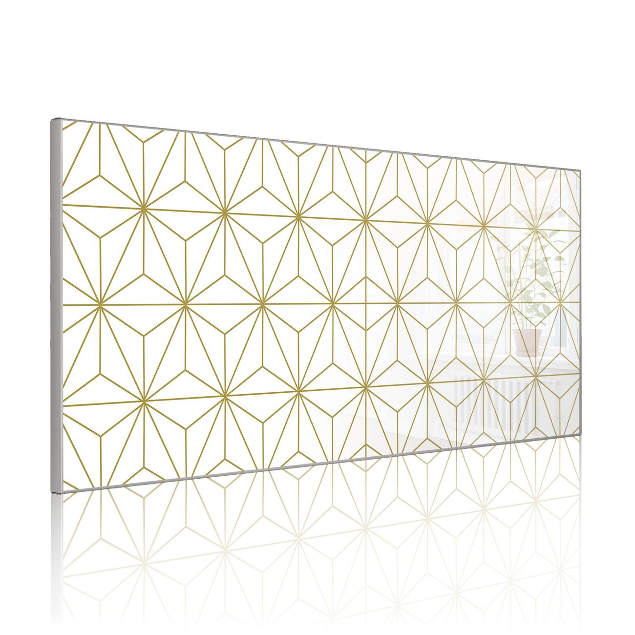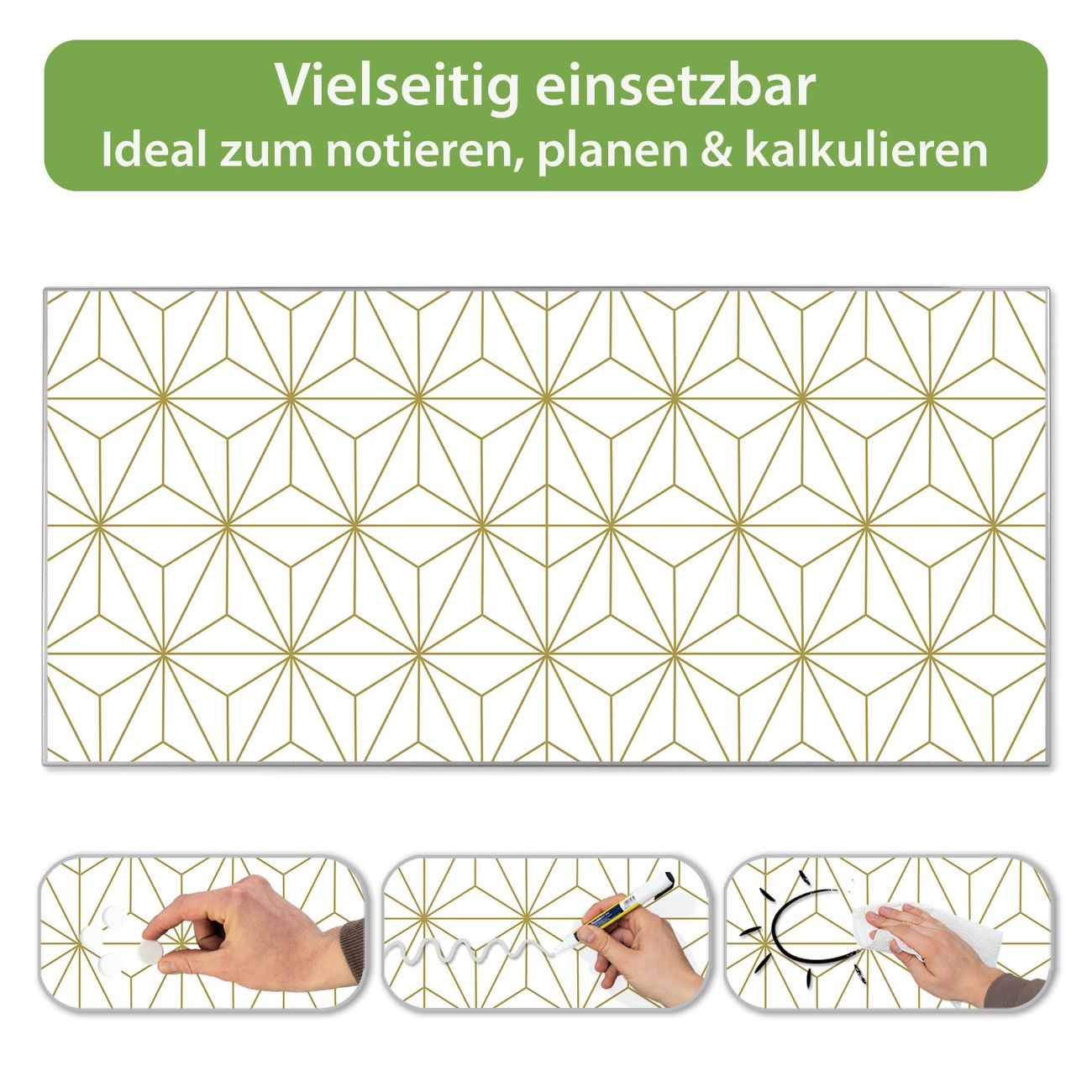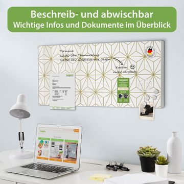 FUNKTION: Die banjado Magnettafel 78x37 cm im Design Motiv Asanoha Muster vereint Funktionalität und modernes Wohndesign auf stilvolle Weise. Diese hochwertige Magnetwand aus Metall hilft Ihnen dabei, Notizen, Fotos, Termine, Einkaufslisten oder Rezepte übersichtlich zu organisieren. Als praktisches Memoboard sorgt sie für Struktur im Alltag und setzt gleichzeitig einen dekorativen Akzent an Ihrer Wand. DESIGN: Die Metalltafel besteht aus robustem, lackiertem Stahl und ist mit allen handelsüblichen Magneten nutzbar. Besonders praktisch ist die beschreibbare Oberfläche. Sie können die Magnettafel ganz einfach mit Kreidestiften beschriften und die Inhalte bei Bedarf mit einem feuchten Tuch wieder entfernen. So eignet sich das Memoboard ideal für Wochenpläne, Menüpläne, To Do Listen oder kreative Botschaften. DETAILS: Mit ihrem großzügigen Querformat von 78x37 cm bietet die Magnettafel ausreichend Platz für Ihre Organisation. Das Motiv Motiv Asanoha Muster bringt eine warme, natürliche Optik in Küche, Flur, Büro oder Homeoffice und wirkt auch ohne Magnete oder Beschriftung wie ein modernes Wandbild. NUTZEN: Auf der Rückseite befinden sich vorgefertigte Löcher für eine schnelle und unkomplizierte Wandmontage. Jede banjado Magnettafel wird in Deutschland gefertigt und steht für Qualität, Langlebigkeit und liebevolle Verarbeitung. Dieses beschreibbare Memoboard ist die perfekte Kombination aus Metalltafel, Designobjekt und praktischer Magnetwand für Ihren Alltag. BANJADO: Wir sind ein kleines Team aus dem Herzen von Sachsen. Wir fertigen alle Artikel von Hand für Sie an, Sie erhalten keine preiswerte Importware. Auf Wunsch können Sie auch Ihr eigenes Foto auf die Magnettafel aufbringen, schreiben Sie uns an. Herzlichst, Ihr banjado-Team