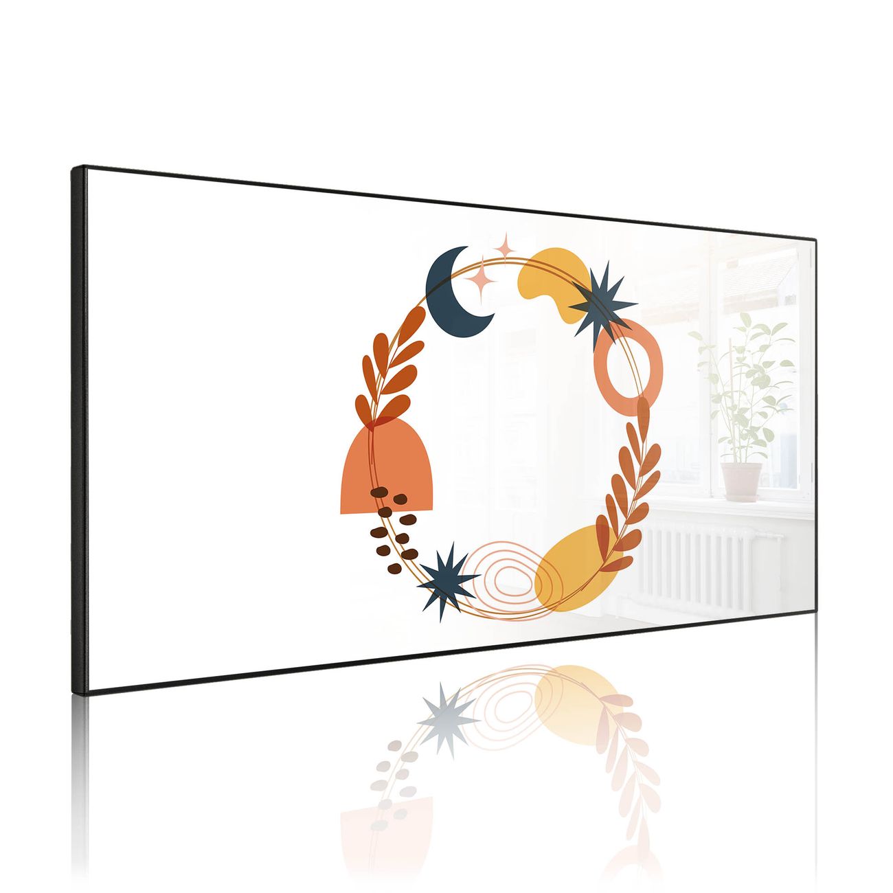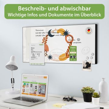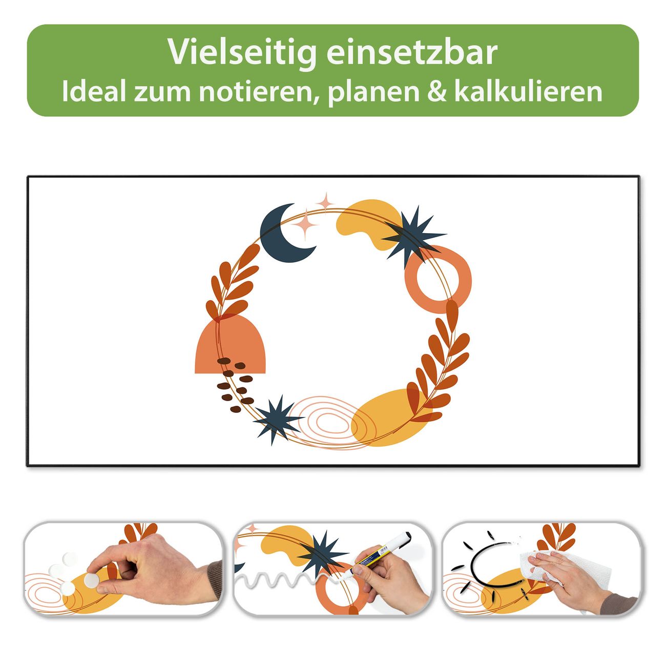 FUNKTION: Die banjado Magnettafel 78x37 cm im Design Motiv Astro-Herbstkranz vereint Funktionalität und modernes Wohndesign auf stilvolle Weise. Diese hochwertige Magnetwand aus Metall hilft Ihnen dabei, Notizen, Fotos, Termine, Einkaufslisten oder Rezepte übersichtlich zu organisieren. Als praktisches Memoboard sorgt sie für Struktur im Alltag und setzt gleichzeitig einen dekorativen Akzent an Ihrer Wand. DESIGN: Die Metalltafel besteht aus robustem, lackiertem Stahl und ist mit allen handelsüblichen Magneten nutzbar. Besonders praktisch ist die beschreibbare Oberfläche. Sie können die Magnettafel ganz einfach mit Kreidestiften beschriften und die Inhalte bei Bedarf mit einem feuchten Tuch wieder entfernen. So eignet sich das Memoboard ideal für Wochenpläne, Menüpläne, To Do Listen oder kreative Botschaften. DETAILS: Mit ihrem großzügigen Querformat von 78x37 cm bietet die Magnettafel ausreichend Platz für Ihre Organisation. Das Motiv Motiv Astro-Herbstkranz bringt eine warme, natürliche Optik in Küche, Flur, Büro oder Homeoffice und wirkt auch ohne Magnete oder Beschriftung wie ein modernes Wandbild. NUTZEN: Auf der Rückseite befinden sich vorgefertigte Löcher für eine schnelle und unkomplizierte Wandmontage. Jede banjado Magnettafel wird in Deutschland gefertigt und steht für Qualität, Langlebigkeit und liebevolle Verarbeitung. Dieses beschreibbare Memoboard ist die perfekte Kombination aus Metalltafel, Designobjekt und praktischer Magnetwand für Ihren Alltag. BANJADO: Wir sind ein kleines Team aus dem Herzen von Sachsen. Wir fertigen alle Artikel von Hand für Sie an, Sie erhalten keine preiswerte Importware. Auf Wunsch können Sie auch Ihr eigenes Foto auf die Magnettafel aufbringen, schreiben Sie uns an. Herzlichst, Ihr banjado-Team