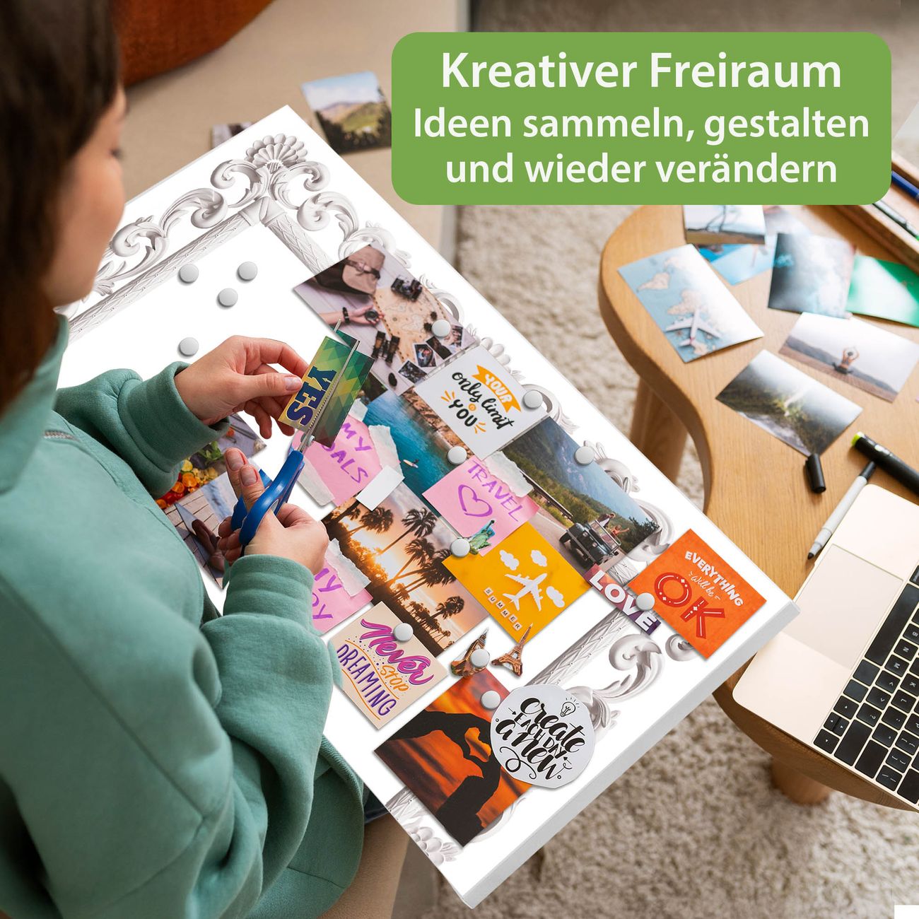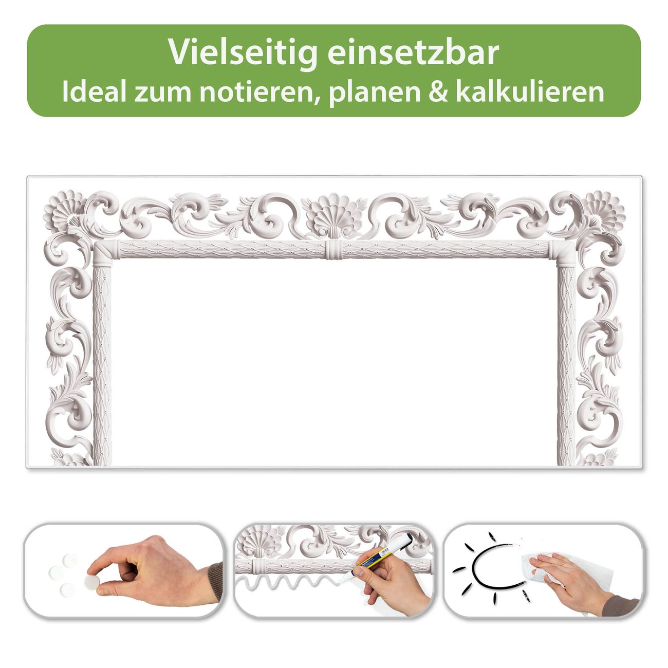 FUNKTION: Die banjado Magnettafel 78x37 cm im Design Motiv Barocker Bilderrahmen vereint Funktionalität und modernes Wohndesign auf stilvolle Weise. Diese hochwertige Magnetwand aus Metall hilft Ihnen dabei, Notizen, Fotos, Termine, Einkaufslisten oder Rezepte übersichtlich zu organisieren. Als praktisches Memoboard sorgt sie für Struktur im Alltag und setzt gleichzeitig einen dekorativen Akzent an Ihrer Wand. DESIGN: Die Metalltafel besteht aus robustem, lackiertem Stahl und ist mit allen handelsüblichen Magneten nutzbar. Besonders praktisch ist die beschreibbare Oberfläche. Sie können die Magnettafel ganz einfach mit Kreidestiften beschriften und die Inhalte bei Bedarf mit einem feuchten Tuch wieder entfernen. So eignet sich das Memoboard ideal für Wochenpläne, Menüpläne, To Do Listen oder kreative Botschaften. DETAILS: Mit ihrem großzügigen Querformat von 78x37 cm bietet die Magnettafel ausreichend Platz für Ihre Organisation. Das Motiv Motiv Barocker Bilderrahmen bringt eine warme, natürliche Optik in Küche, Flur, Büro oder Homeoffice und wirkt auch ohne Magnete oder Beschriftung wie ein modernes Wandbild. NUTZEN: Auf der Rückseite befinden sich vorgefertigte Löcher für eine schnelle und unkomplizierte Wandmontage. Jede banjado Magnettafel wird in Deutschland gefertigt und steht für Qualität, Langlebigkeit und liebevolle Verarbeitung. Dieses beschreibbare Memoboard ist die perfekte Kombination aus Metalltafel, Designobjekt und praktischer Magnetwand für Ihren Alltag. BANJADO: Wir sind ein kleines Team aus dem Herzen von Sachsen. Wir fertigen alle Artikel von Hand für Sie an, Sie erhalten keine preiswerte Importware. Auf Wunsch können Sie auch Ihr eigenes Foto auf die Magnettafel aufbringen, schreiben Sie uns an. Herzlichst, Ihr banjado-Team