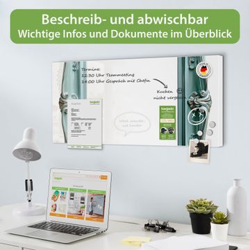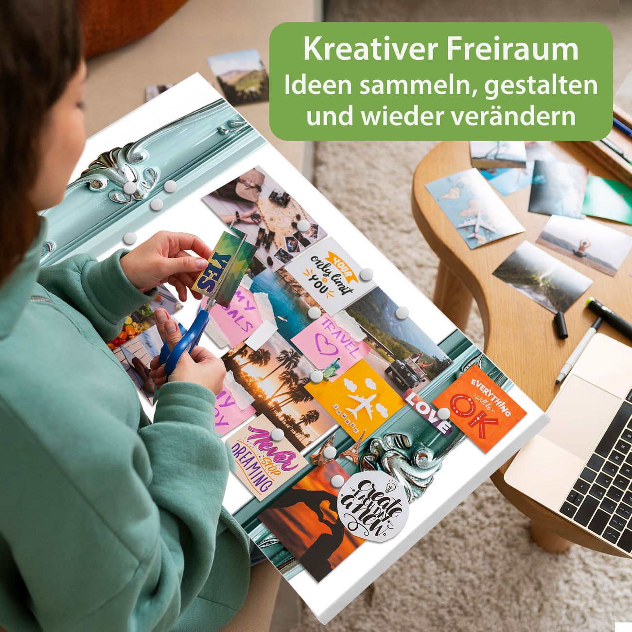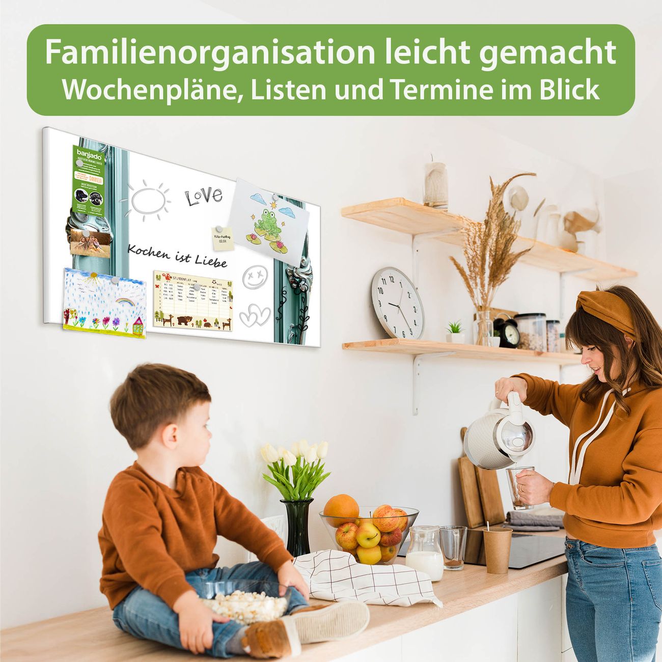 FUNKTION: Die banjado Magnettafel 78x37 cm im Design Motiv Barockrahmen in Türkis vereint Funktionalität und modernes Wohndesign auf stilvolle Weise. Diese hochwertige Magnetwand aus Metall hilft Ihnen dabei, Notizen, Fotos, Termine, Einkaufslisten oder Rezepte übersichtlich zu organisieren. Als praktisches Memoboard sorgt sie für Struktur im Alltag und setzt gleichzeitig einen dekorativen Akzent an Ihrer Wand. DESIGN: Die Metalltafel besteht aus robustem, lackiertem Stahl und ist mit allen handelsüblichen Magneten nutzbar. Besonders praktisch ist die beschreibbare Oberfläche. Sie können die Magnettafel ganz einfach mit Kreidestiften beschriften und die Inhalte bei Bedarf mit einem feuchten Tuch wieder entfernen. So eignet sich das Memoboard ideal für Wochenpläne, Menüpläne, To Do Listen oder kreative Botschaften. DETAILS: Mit ihrem großzügigen Querformat von 78x37 cm bietet die Magnettafel ausreichend Platz für Ihre Organisation. Das Motiv Motiv Barockrahmen in Türkis bringt eine warme, natürliche Optik in Küche, Flur, Büro oder Homeoffice und wirkt auch ohne Magnete oder Beschriftung wie ein modernes Wandbild. NUTZEN: Auf der Rückseite befinden sich vorgefertigte Löcher für eine schnelle und unkomplizierte Wandmontage. Jede banjado Magnettafel wird in Deutschland gefertigt und steht für Qualität, Langlebigkeit und liebevolle Verarbeitung. Dieses beschreibbare Memoboard ist die perfekte Kombination aus Metalltafel, Designobjekt und praktischer Magnetwand für Ihren Alltag. BANJADO: Wir sind ein kleines Team aus dem Herzen von Sachsen. Wir fertigen alle Artikel von Hand für Sie an, Sie erhalten keine preiswerte Importware. Auf Wunsch können Sie auch Ihr eigenes Foto auf die Magnettafel aufbringen, schreiben Sie uns an. Herzlichst, Ihr banjado-Team