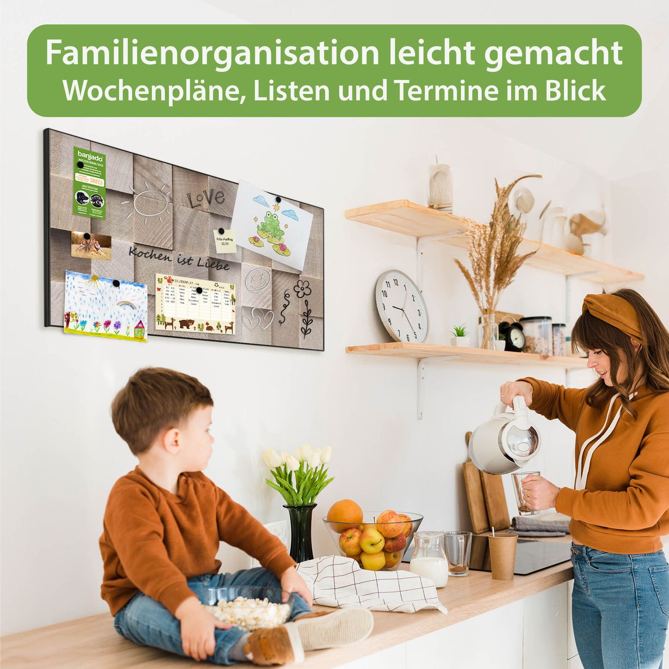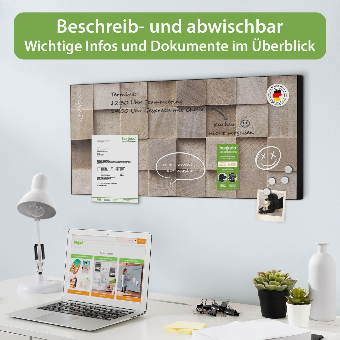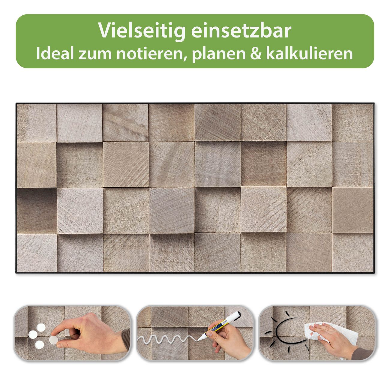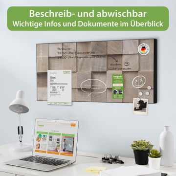 FUNKTION: Die banjado Magnettafel 78x37 cm im Design Motiv Bauklötze Relief vereint Funktionalität und modernes Wohndesign auf stilvolle Weise. Diese hochwertige Magnetwand aus Metall hilft Ihnen dabei, Notizen, Fotos, Termine, Einkaufslisten oder Rezepte übersichtlich zu organisieren. Als praktisches Memoboard sorgt sie für Struktur im Alltag und setzt gleichzeitig einen dekorativen Akzent an Ihrer Wand. DESIGN: Die Metalltafel besteht aus robustem, lackiertem Stahl und ist mit allen handelsüblichen Magneten nutzbar. Besonders praktisch ist die beschreibbare Oberfläche. Sie können die Magnettafel ganz einfach mit Kreidestiften beschriften und die Inhalte bei Bedarf mit einem feuchten Tuch wieder entfernen. So eignet sich das Memoboard ideal für Wochenpläne, Menüpläne, To Do Listen oder kreative Botschaften. DETAILS: Mit ihrem großzügigen Querformat von 78x37 cm bietet die Magnettafel ausreichend Platz für Ihre Organisation. Das Motiv Motiv Bauklötze Relief bringt eine warme, natürliche Optik in Küche, Flur, Büro oder Homeoffice und wirkt auch ohne Magnete oder Beschriftung wie ein modernes Wandbild. NUTZEN: Auf der Rückseite befinden sich vorgefertigte Löcher für eine schnelle und unkomplizierte Wandmontage. Jede banjado Magnettafel wird in Deutschland gefertigt und steht für Qualität, Langlebigkeit und liebevolle Verarbeitung. Dieses beschreibbare Memoboard ist die perfekte Kombination aus Metalltafel, Designobjekt und praktischer Magnetwand für Ihren Alltag. BANJADO: Wir sind ein kleines Team aus dem Herzen von Sachsen. Wir fertigen alle Artikel von Hand für Sie an, Sie erhalten keine preiswerte Importware. Auf Wunsch können Sie auch Ihr eigenes Foto auf die Magnettafel aufbringen, schreiben Sie uns an. Herzlichst, Ihr banjado-Team