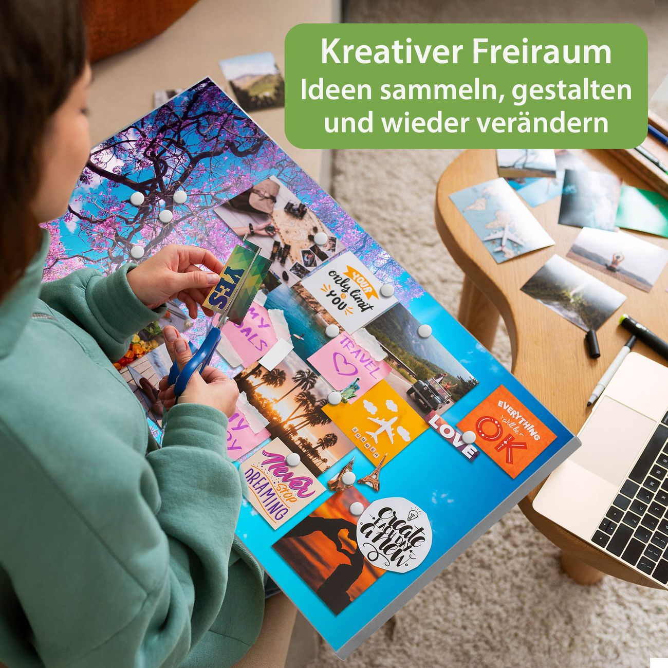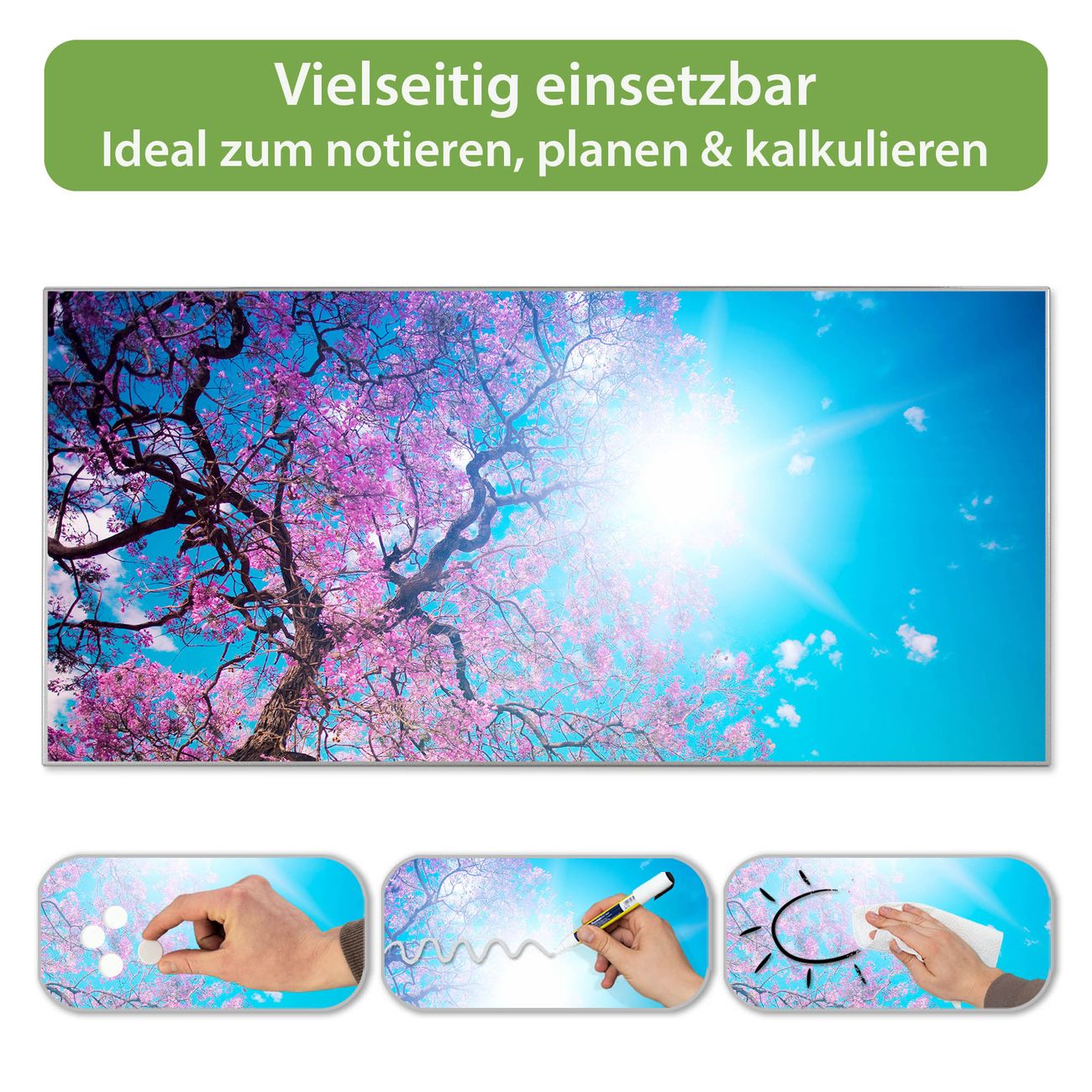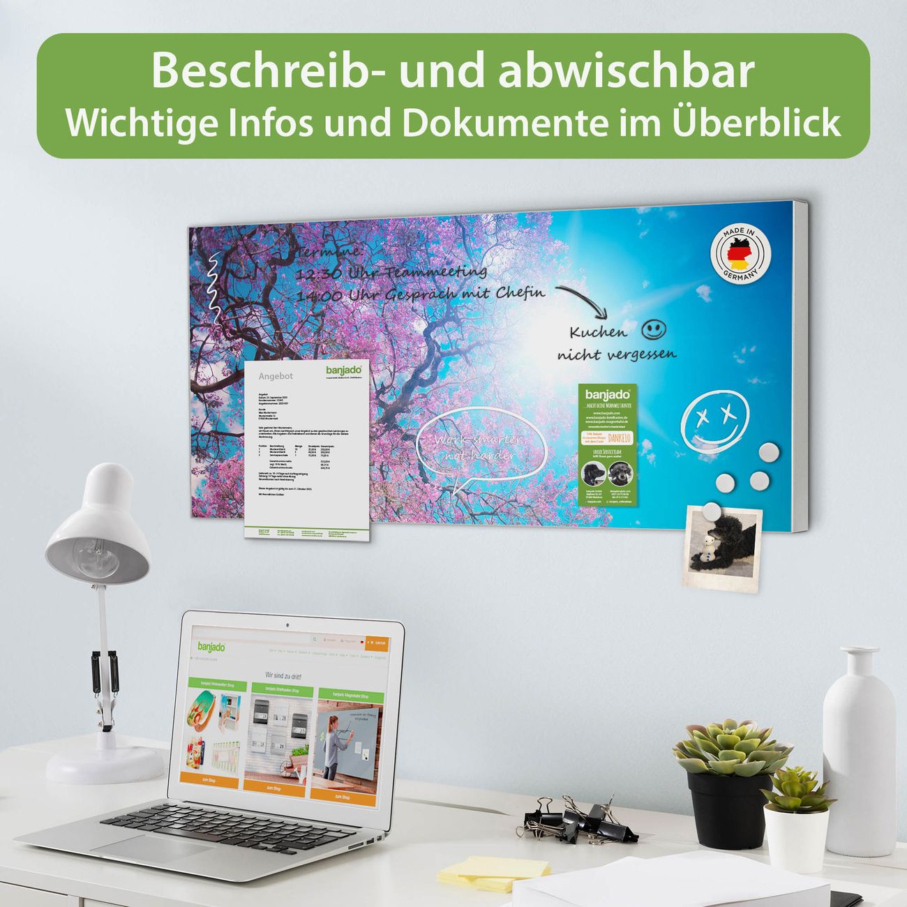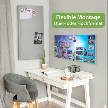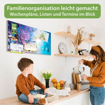 FUNKTION: Die banjado Magnettafel 78x37 cm im Design Motiv Baumkrone 2 vereint Funktionalität und modernes Wohndesign auf stilvolle Weise. Diese hochwertige Magnetwand aus Metall hilft Ihnen dabei, Notizen, Fotos, Termine, Einkaufslisten oder Rezepte übersichtlich zu organisieren. Als praktisches Memoboard sorgt sie für Struktur im Alltag und setzt gleichzeitig einen dekorativen Akzent an Ihrer Wand. DESIGN: Die Metalltafel besteht aus robustem, lackiertem Stahl und ist mit allen handelsüblichen Magneten nutzbar. Besonders praktisch ist die beschreibbare Oberfläche. Sie können die Magnettafel ganz einfach mit Kreidestiften beschriften und die Inhalte bei Bedarf mit einem feuchten Tuch wieder entfernen. So eignet sich das Memoboard ideal für Wochenpläne, Menüpläne, To Do Listen oder kreative Botschaften. DETAILS: Mit ihrem großzügigen Querformat von 78x37 cm bietet die Magnettafel ausreichend Platz für Ihre Organisation. Das Motiv Motiv Baumkrone 2 bringt eine warme, natürliche Optik in Küche, Flur, Büro oder Homeoffice und wirkt auch ohne Magnete oder Beschriftung wie ein modernes Wandbild. NUTZEN: Auf der Rückseite befinden sich vorgefertigte Löcher für eine schnelle und unkomplizierte Wandmontage. Jede banjado Magnettafel wird in Deutschland gefertigt und steht für Qualität, Langlebigkeit und liebevolle Verarbeitung. Dieses beschreibbare Memoboard ist die perfekte Kombination aus Metalltafel, Designobjekt und praktischer Magnetwand für Ihren Alltag. BANJADO: Wir sind ein kleines Team aus dem Herzen von Sachsen. Wir fertigen alle Artikel von Hand für Sie an, Sie erhalten keine preiswerte Importware. Auf Wunsch können Sie auch Ihr eigenes Foto auf die Magnettafel aufbringen, schreiben Sie uns an. Herzlichst, Ihr banjado-Team
