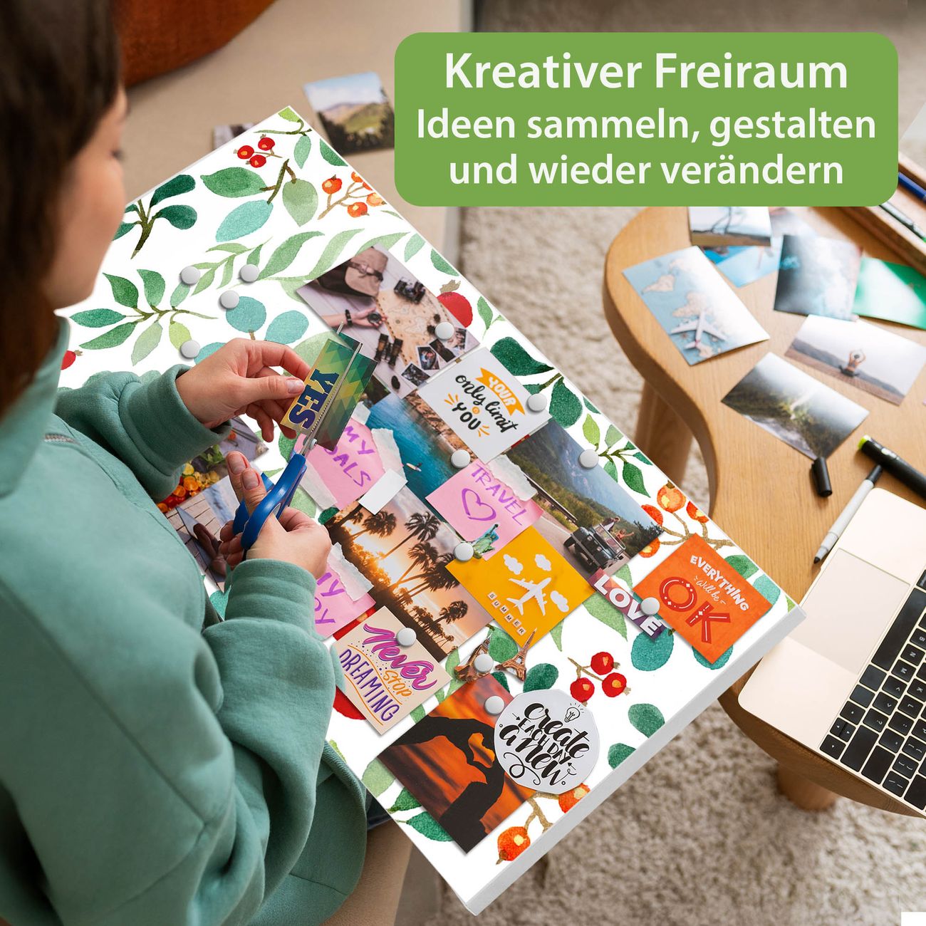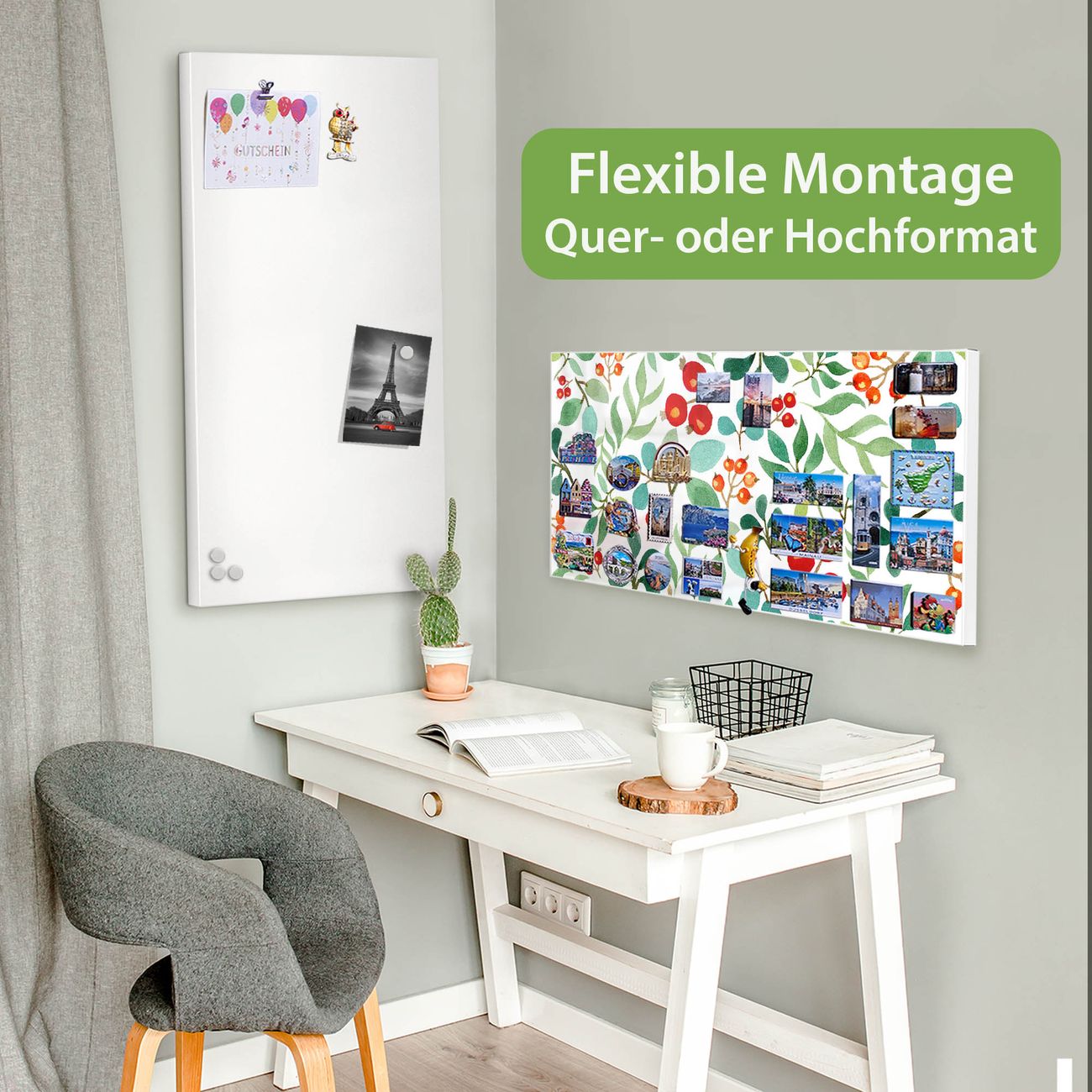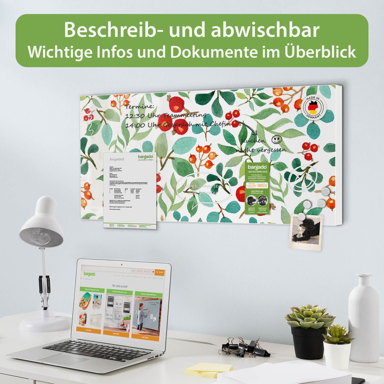 FUNKTION: Die banjado Magnettafel 78x37 cm im Design Motiv Beeren und Blätter vereint Funktionalität und modernes Wohndesign auf stilvolle Weise. Diese hochwertige Magnetwand aus Metall hilft Ihnen dabei, Notizen, Fotos, Termine, Einkaufslisten oder Rezepte übersichtlich zu organisieren. Als praktisches Memoboard sorgt sie für Struktur im Alltag und setzt gleichzeitig einen dekorativen Akzent an Ihrer Wand. DESIGN: Die Metalltafel besteht aus robustem, lackiertem Stahl und ist mit allen handelsüblichen Magneten nutzbar. Besonders praktisch ist die beschreibbare Oberfläche. Sie können die Magnettafel ganz einfach mit Kreidestiften beschriften und die Inhalte bei Bedarf mit einem feuchten Tuch wieder entfernen. So eignet sich das Memoboard ideal für Wochenpläne, Menüpläne, To Do Listen oder kreative Botschaften. DETAILS: Mit ihrem großzügigen Querformat von 78x37 cm bietet die Magnettafel ausreichend Platz für Ihre Organisation. Das Motiv Motiv Beeren und Blätter bringt eine warme, natürliche Optik in Küche, Flur, Büro oder Homeoffice und wirkt auch ohne Magnete oder Beschriftung wie ein modernes Wandbild. NUTZEN: Auf der Rückseite befinden sich vorgefertigte Löcher für eine schnelle und unkomplizierte Wandmontage. Jede banjado Magnettafel wird in Deutschland gefertigt und steht für Qualität, Langlebigkeit und liebevolle Verarbeitung. Dieses beschreibbare Memoboard ist die perfekte Kombination aus Metalltafel, Designobjekt und praktischer Magnetwand für Ihren Alltag. BANJADO: Wir sind ein kleines Team aus dem Herzen von Sachsen. Wir fertigen alle Artikel von Hand für Sie an, Sie erhalten keine preiswerte Importware. Auf Wunsch können Sie auch Ihr eigenes Foto auf die Magnettafel aufbringen, schreiben Sie uns an. Herzlichst, Ihr banjado-Team