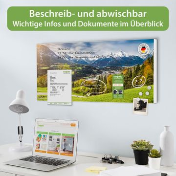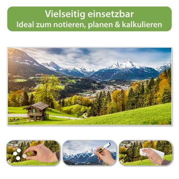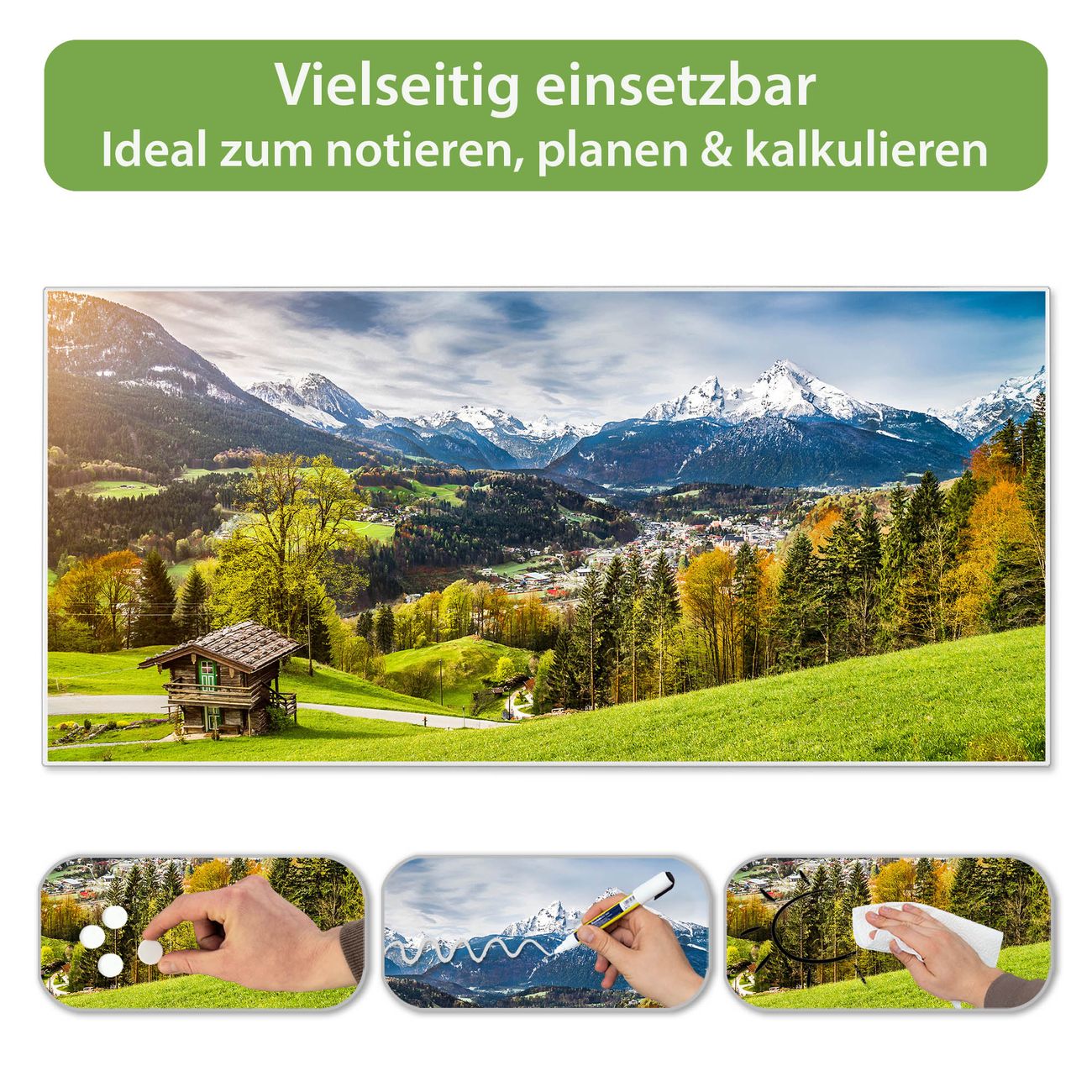 FUNKTION: Die banjado Magnettafel 78x37 cm im Design Motiv Berchtesgadener Land vereint Funktionalität und modernes Wohndesign auf stilvolle Weise. Diese hochwertige Magnetwand aus Metall hilft Ihnen dabei, Notizen, Fotos, Termine, Einkaufslisten oder Rezepte übersichtlich zu organisieren. Als praktisches Memoboard sorgt sie für Struktur im Alltag und setzt gleichzeitig einen dekorativen Akzent an Ihrer Wand. DESIGN: Die Metalltafel besteht aus robustem, lackiertem Stahl und ist mit allen handelsüblichen Magneten nutzbar. Besonders praktisch ist die beschreibbare Oberfläche. Sie können die Magnettafel ganz einfach mit Kreidestiften beschriften und die Inhalte bei Bedarf mit einem feuchten Tuch wieder entfernen. So eignet sich das Memoboard ideal für Wochenpläne, Menüpläne, To Do Listen oder kreative Botschaften. DETAILS: Mit ihrem großzügigen Querformat von 78x37 cm bietet die Magnettafel ausreichend Platz für Ihre Organisation. Das Motiv Motiv Berchtesgadener Land bringt eine warme, natürliche Optik in Küche, Flur, Büro oder Homeoffice und wirkt auch ohne Magnete oder Beschriftung wie ein modernes Wandbild. NUTZEN: Auf der Rückseite befinden sich vorgefertigte Löcher für eine schnelle und unkomplizierte Wandmontage. Jede banjado Magnettafel wird in Deutschland gefertigt und steht für Qualität, Langlebigkeit und liebevolle Verarbeitung. Dieses beschreibbare Memoboard ist die perfekte Kombination aus Metalltafel, Designobjekt und praktischer Magnetwand für Ihren Alltag. BANJADO: Wir sind ein kleines Team aus dem Herzen von Sachsen. Wir fertigen alle Artikel von Hand für Sie an, Sie erhalten keine preiswerte Importware. Auf Wunsch können Sie auch Ihr eigenes Foto auf die Magnettafel aufbringen, schreiben Sie uns an. Herzlichst, Ihr banjado-Team