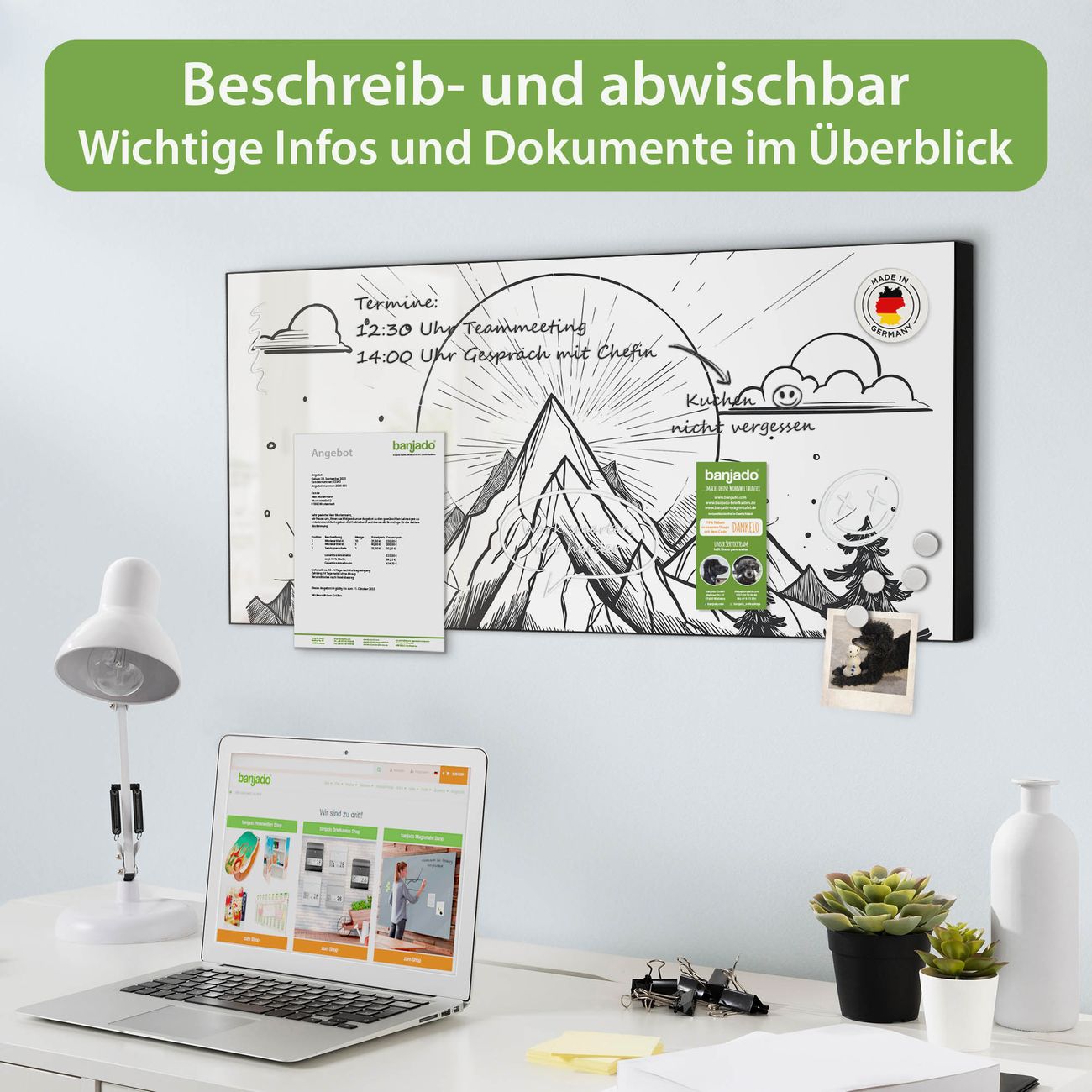 FUNKTION: Die banjado Magnettafel 78x37 cm im Design Motiv Bergcamping Abenteuer 2 vereint Funktionalität und modernes Wohndesign auf stilvolle Weise. Diese hochwertige Magnetwand aus Metall hilft Ihnen dabei, Notizen, Fotos, Termine, Einkaufslisten oder Rezepte übersichtlich zu organisieren. Als praktisches Memoboard sorgt sie für Struktur im Alltag und setzt gleichzeitig einen dekorativen Akzent an Ihrer Wand. DESIGN: Die Metalltafel besteht aus robustem, lackiertem Stahl und ist mit allen handelsüblichen Magneten nutzbar. Besonders praktisch ist die beschreibbare Oberfläche. Sie können die Magnettafel ganz einfach mit Kreidestiften beschriften und die Inhalte bei Bedarf mit einem feuchten Tuch wieder entfernen. So eignet sich das Memoboard ideal für Wochenpläne, Menüpläne, To Do Listen oder kreative Botschaften. DETAILS: Mit ihrem großzügigen Querformat von 78x37 cm bietet die Magnettafel ausreichend Platz für Ihre Organisation. Das Motiv Motiv Bergcamping Abenteuer 2 bringt eine warme, natürliche Optik in Küche, Flur, Büro oder Homeoffice und wirkt auch ohne Magnete oder Beschriftung wie ein modernes Wandbild. NUTZEN: Auf der Rückseite befinden sich vorgefertigte Löcher für eine schnelle und unkomplizierte Wandmontage. Jede banjado Magnettafel wird in Deutschland gefertigt und steht für Qualität, Langlebigkeit und liebevolle Verarbeitung. Dieses beschreibbare Memoboard ist die perfekte Kombination aus Metalltafel, Designobjekt und praktischer Magnetwand für Ihren Alltag. BANJADO: Wir sind ein kleines Team aus dem Herzen von Sachsen. Wir fertigen alle Artikel von Hand für Sie an, Sie erhalten keine preiswerte Importware. Auf Wunsch können Sie auch Ihr eigenes Foto auf die Magnettafel aufbringen, schreiben Sie uns an. Herzlichst, Ihr banjado-Team