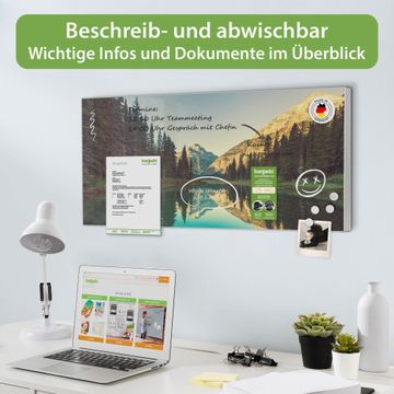 FUNKTION: Die banjado Magnettafel 78x37 cm im Design Motiv Bergsee vereint Funktionalität und modernes Wohndesign auf stilvolle Weise. Diese hochwertige Magnetwand aus Metall hilft Ihnen dabei, Notizen, Fotos, Termine, Einkaufslisten oder Rezepte übersichtlich zu organisieren. Als praktisches Memoboard sorgt sie für Struktur im Alltag und setzt gleichzeitig einen dekorativen Akzent an Ihrer Wand. DESIGN: Die Metalltafel besteht aus robustem, lackiertem Stahl und ist mit allen handelsüblichen Magneten nutzbar. Besonders praktisch ist die beschreibbare Oberfläche. Sie können die Magnettafel ganz einfach mit Kreidestiften beschriften und die Inhalte bei Bedarf mit einem feuchten Tuch wieder entfernen. So eignet sich das Memoboard ideal für Wochenpläne, Menüpläne, To Do Listen oder kreative Botschaften. DETAILS: Mit ihrem großzügigen Querformat von 78x37 cm bietet die Magnettafel ausreichend Platz für Ihre Organisation. Das Motiv Motiv Bergsee bringt eine warme, natürliche Optik in Küche, Flur, Büro oder Homeoffice und wirkt auch ohne Magnete oder Beschriftung wie ein modernes Wandbild. NUTZEN: Auf der Rückseite befinden sich vorgefertigte Löcher für eine schnelle und unkomplizierte Wandmontage. Jede banjado Magnettafel wird in Deutschland gefertigt und steht für Qualität, Langlebigkeit und liebevolle Verarbeitung. Dieses beschreibbare Memoboard ist die perfekte Kombination aus Metalltafel, Designobjekt und praktischer Magnetwand für Ihren Alltag. BANJADO: Wir sind ein kleines Team aus dem Herzen von Sachsen. Wir fertigen alle Artikel von Hand für Sie an, Sie erhalten keine preiswerte Importware. Auf Wunsch können Sie auch Ihr eigenes Foto auf die Magnettafel aufbringen, schreiben Sie uns an. Herzlichst, Ihr banjado-Team