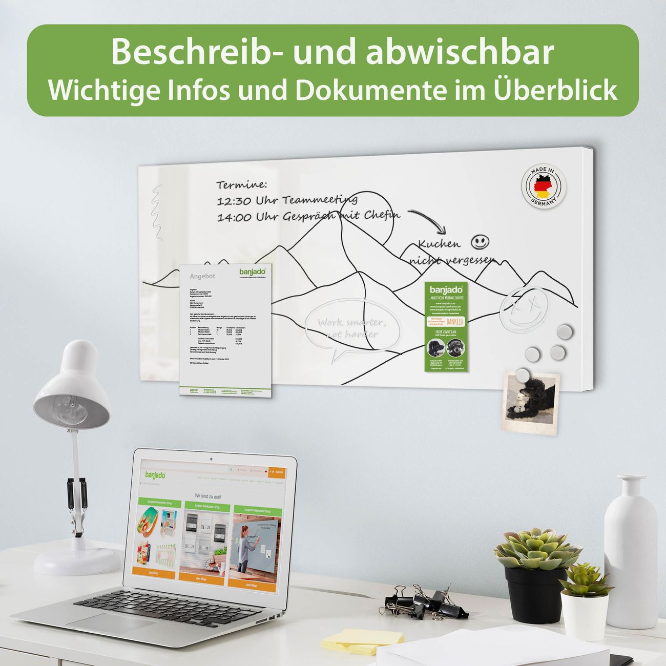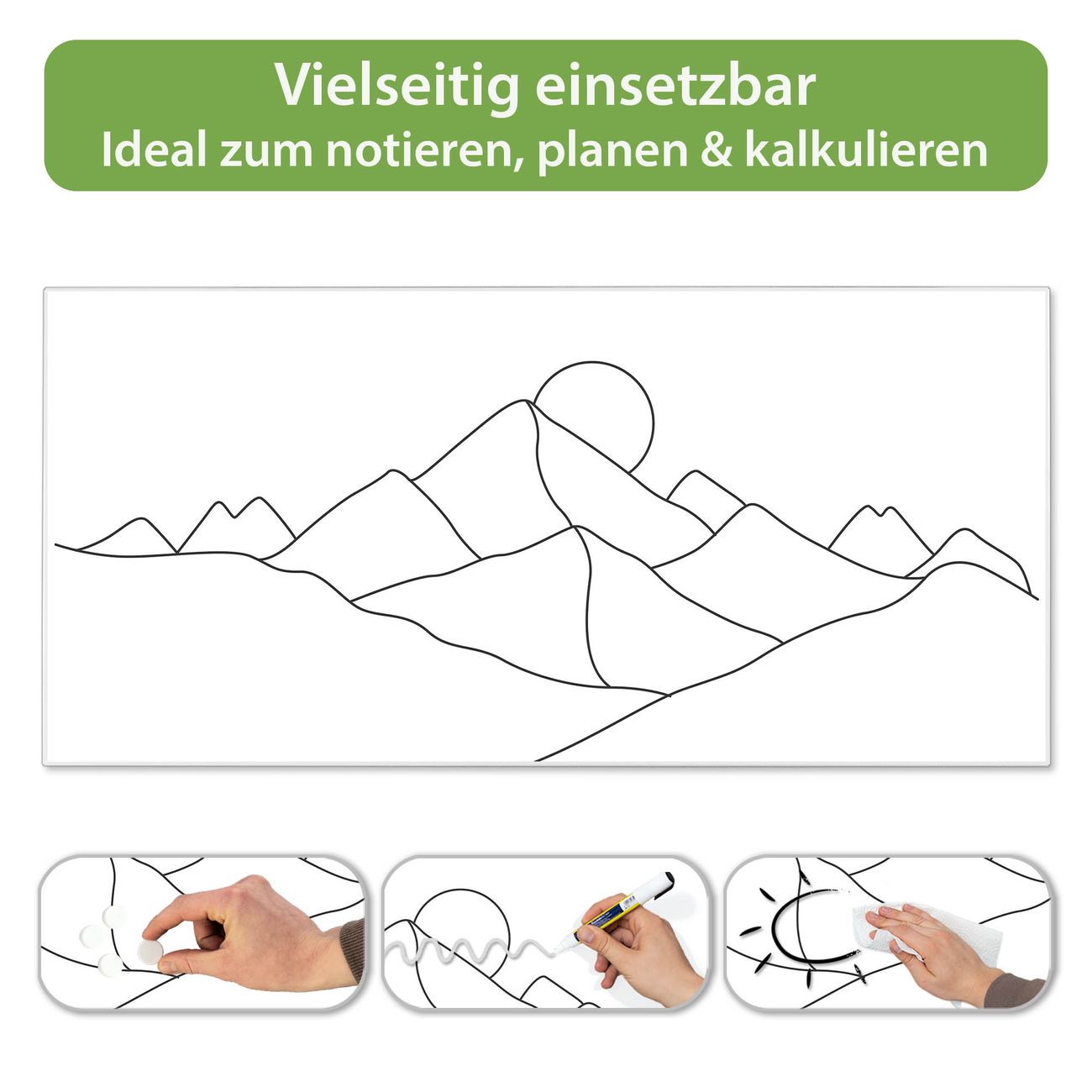 FUNKTION: Die banjado Magnettafel 78x37 cm im Design Motiv Bergsilhouette Lineart 2 vereint Funktionalität und modernes Wohndesign auf stilvolle Weise. Diese hochwertige Magnetwand aus Metall hilft Ihnen dabei, Notizen, Fotos, Termine, Einkaufslisten oder Rezepte übersichtlich zu organisieren. Als praktisches Memoboard sorgt sie für Struktur im Alltag und setzt gleichzeitig einen dekorativen Akzent an Ihrer Wand. DESIGN: Die Metalltafel besteht aus robustem, lackiertem Stahl und ist mit allen handelsüblichen Magneten nutzbar. Besonders praktisch ist die beschreibbare Oberfläche. Sie können die Magnettafel ganz einfach mit Kreidestiften beschriften und die Inhalte bei Bedarf mit einem feuchten Tuch wieder entfernen. So eignet sich das Memoboard ideal für Wochenpläne, Menüpläne, To Do Listen oder kreative Botschaften. DETAILS: Mit ihrem großzügigen Querformat von 78x37 cm bietet die Magnettafel ausreichend Platz für Ihre Organisation. Das Motiv Motiv Bergsilhouette Lineart 2 bringt eine warme, natürliche Optik in Küche, Flur, Büro oder Homeoffice und wirkt auch ohne Magnete oder Beschriftung wie ein modernes Wandbild. NUTZEN: Auf der Rückseite befinden sich vorgefertigte Löcher für eine schnelle und unkomplizierte Wandmontage. Jede banjado Magnettafel wird in Deutschland gefertigt und steht für Qualität, Langlebigkeit und liebevolle Verarbeitung. Dieses beschreibbare Memoboard ist die perfekte Kombination aus Metalltafel, Designobjekt und praktischer Magnetwand für Ihren Alltag. BANJADO: Wir sind ein kleines Team aus dem Herzen von Sachsen. Wir fertigen alle Artikel von Hand für Sie an, Sie erhalten keine preiswerte Importware. Auf Wunsch können Sie auch Ihr eigenes Foto auf die Magnettafel aufbringen, schreiben Sie uns an. Herzlichst, Ihr banjado-Team
