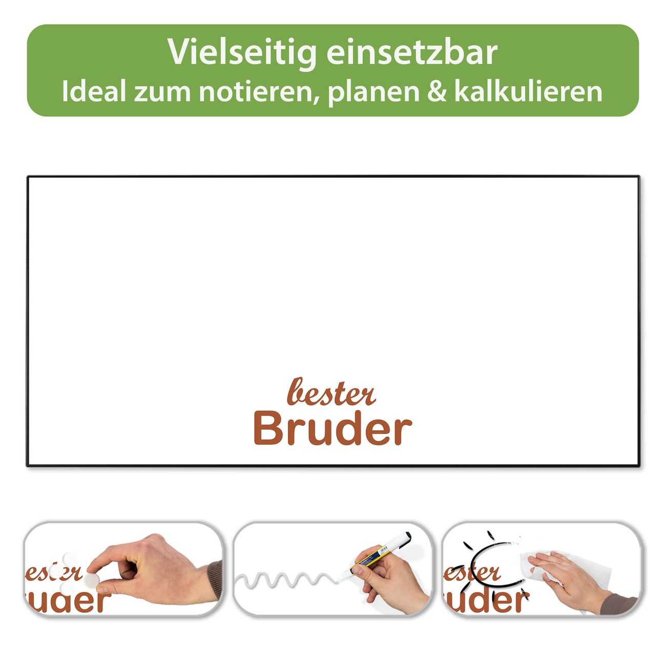 FUNKTION: Die banjado Magnettafel 78x37 cm im Design Motiv bester Bruder 2 vereint Funktionalität und modernes Wohndesign auf stilvolle Weise. Diese hochwertige Magnetwand aus Metall hilft Ihnen dabei, Notizen, Fotos, Termine, Einkaufslisten oder Rezepte übersichtlich zu organisieren. Als praktisches Memoboard sorgt sie für Struktur im Alltag und setzt gleichzeitig einen dekorativen Akzent an Ihrer Wand. DESIGN: Die Metalltafel besteht aus robustem, lackiertem Stahl und ist mit allen handelsüblichen Magneten nutzbar. Besonders praktisch ist die beschreibbare Oberfläche. Sie können die Magnettafel ganz einfach mit Kreidestiften beschriften und die Inhalte bei Bedarf mit einem feuchten Tuch wieder entfernen. So eignet sich das Memoboard ideal für Wochenpläne, Menüpläne, To Do Listen oder kreative Botschaften. DETAILS: Mit ihrem großzügigen Querformat von 78x37 cm bietet die Magnettafel ausreichend Platz für Ihre Organisation. Das Motiv Motiv bester Bruder 2 bringt eine warme, natürliche Optik in Küche, Flur, Büro oder Homeoffice und wirkt auch ohne Magnete oder Beschriftung wie ein modernes Wandbild. NUTZEN: Auf der Rückseite befinden sich vorgefertigte Löcher für eine schnelle und unkomplizierte Wandmontage. Jede banjado Magnettafel wird in Deutschland gefertigt und steht für Qualität, Langlebigkeit und liebevolle Verarbeitung. Dieses beschreibbare Memoboard ist die perfekte Kombination aus Metalltafel, Designobjekt und praktischer Magnetwand für Ihren Alltag. BANJADO: Wir sind ein kleines Team aus dem Herzen von Sachsen. Wir fertigen alle Artikel von Hand für Sie an, Sie erhalten keine preiswerte Importware. Auf Wunsch können Sie auch Ihr eigenes Foto auf die Magnettafel aufbringen, schreiben Sie uns an. Herzlichst, Ihr banjado-Team