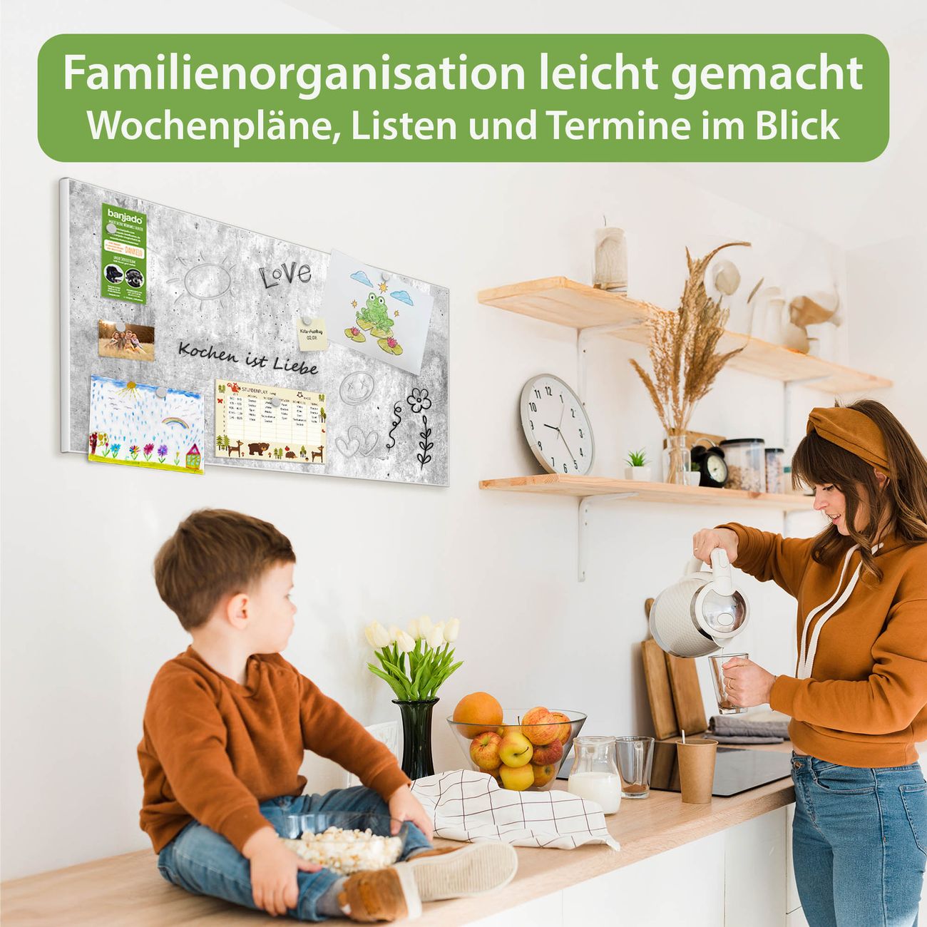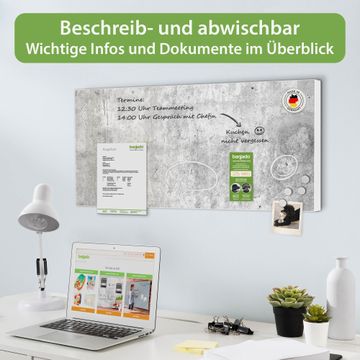 FUNKTION: Die banjado Magnettafel 78x37 cm im Design Motiv Betontextur Grau vereint Funktionalität und modernes Wohndesign auf stilvolle Weise. Diese hochwertige Magnetwand aus Metall hilft Ihnen dabei, Notizen, Fotos, Termine, Einkaufslisten oder Rezepte übersichtlich zu organisieren. Als praktisches Memoboard sorgt sie für Struktur im Alltag und setzt gleichzeitig einen dekorativen Akzent an Ihrer Wand. DESIGN: Die Metalltafel besteht aus robustem, lackiertem Stahl und ist mit allen handelsüblichen Magneten nutzbar. Besonders praktisch ist die beschreibbare Oberfläche. Sie können die Magnettafel ganz einfach mit Kreidestiften beschriften und die Inhalte bei Bedarf mit einem feuchten Tuch wieder entfernen. So eignet sich das Memoboard ideal für Wochenpläne, Menüpläne, To Do Listen oder kreative Botschaften. DETAILS: Mit ihrem großzügigen Querformat von 78x37 cm bietet die Magnettafel ausreichend Platz für Ihre Organisation. Das Motiv Motiv Betontextur Grau bringt eine warme, natürliche Optik in Küche, Flur, Büro oder Homeoffice und wirkt auch ohne Magnete oder Beschriftung wie ein modernes Wandbild. NUTZEN: Auf der Rückseite befinden sich vorgefertigte Löcher für eine schnelle und unkomplizierte Wandmontage. Jede banjado Magnettafel wird in Deutschland gefertigt und steht für Qualität, Langlebigkeit und liebevolle Verarbeitung. Dieses beschreibbare Memoboard ist die perfekte Kombination aus Metalltafel, Designobjekt und praktischer Magnetwand für Ihren Alltag. BANJADO: Wir sind ein kleines Team aus dem Herzen von Sachsen. Wir fertigen alle Artikel von Hand für Sie an, Sie erhalten keine preiswerte Importware. Auf Wunsch können Sie auch Ihr eigenes Foto auf die Magnettafel aufbringen, schreiben Sie uns an. Herzlichst, Ihr banjado-Team