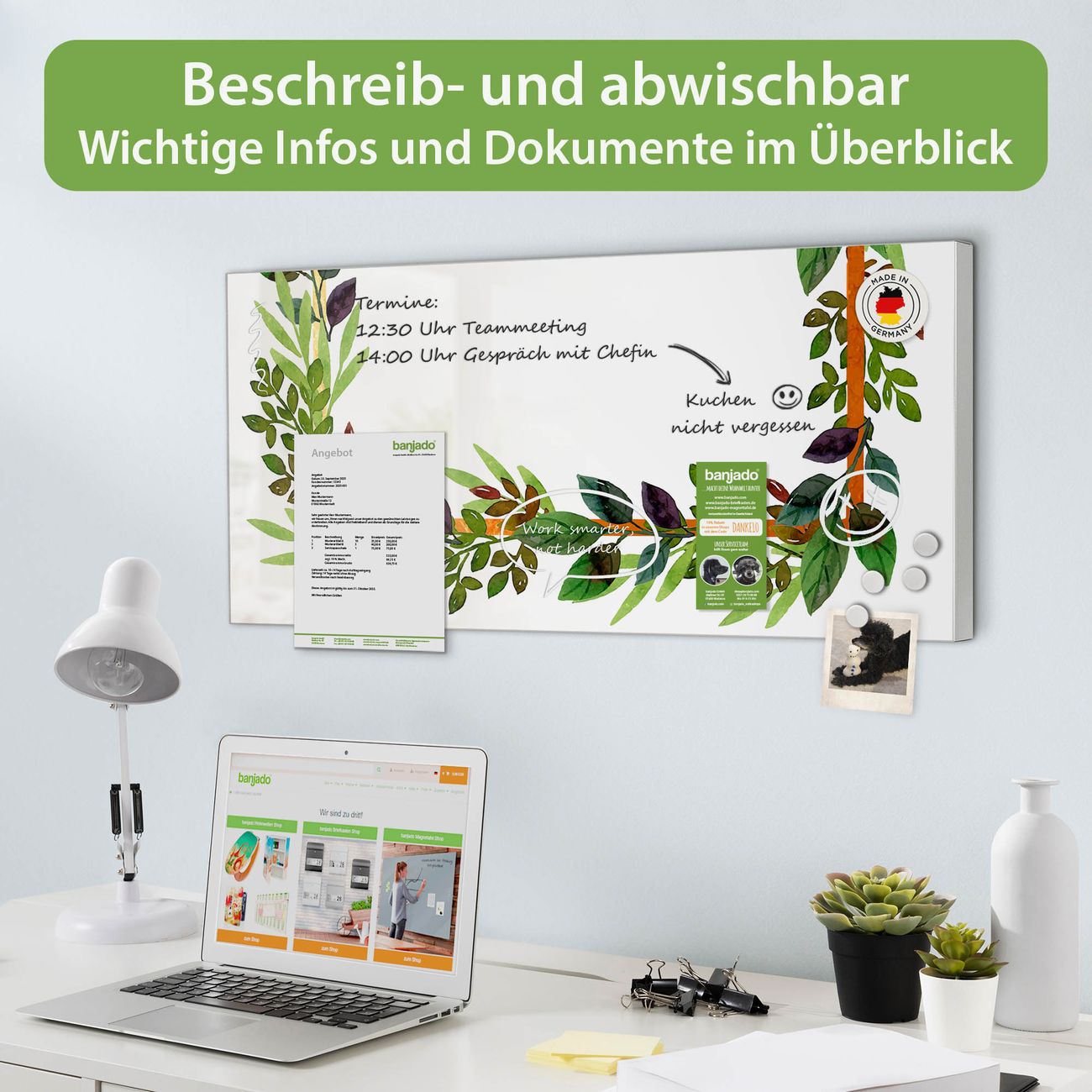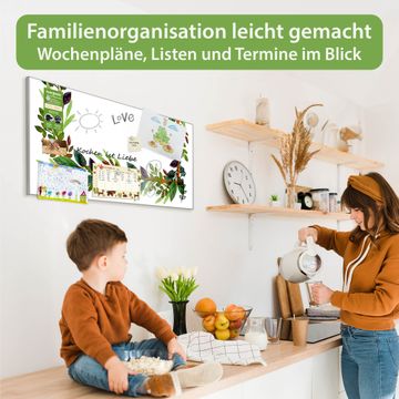 FUNKTION: Die banjado Magnettafel 78x37 cm im Design Motiv Blätterrahmen 2 vereint Funktionalität und modernes Wohndesign auf stilvolle Weise. Diese hochwertige Magnetwand aus Metall hilft Ihnen dabei, Notizen, Fotos, Termine, Einkaufslisten oder Rezepte übersichtlich zu organisieren. Als praktisches Memoboard sorgt sie für Struktur im Alltag und setzt gleichzeitig einen dekorativen Akzent an Ihrer Wand. DESIGN: Die Metalltafel besteht aus robustem, lackiertem Stahl und ist mit allen handelsüblichen Magneten nutzbar. Besonders praktisch ist die beschreibbare Oberfläche. Sie können die Magnettafel ganz einfach mit Kreidestiften beschriften und die Inhalte bei Bedarf mit einem feuchten Tuch wieder entfernen. So eignet sich das Memoboard ideal für Wochenpläne, Menüpläne, To Do Listen oder kreative Botschaften. DETAILS: Mit ihrem großzügigen Querformat von 78x37 cm bietet die Magnettafel ausreichend Platz für Ihre Organisation. Das Motiv Motiv Blätterrahmen 2 bringt eine warme, natürliche Optik in Küche, Flur, Büro oder Homeoffice und wirkt auch ohne Magnete oder Beschriftung wie ein modernes Wandbild. NUTZEN: Auf der Rückseite befinden sich vorgefertigte Löcher für eine schnelle und unkomplizierte Wandmontage. Jede banjado Magnettafel wird in Deutschland gefertigt und steht für Qualität, Langlebigkeit und liebevolle Verarbeitung. Dieses beschreibbare Memoboard ist die perfekte Kombination aus Metalltafel, Designobjekt und praktischer Magnetwand für Ihren Alltag. BANJADO: Wir sind ein kleines Team aus dem Herzen von Sachsen. Wir fertigen alle Artikel von Hand für Sie an, Sie erhalten keine preiswerte Importware. Auf Wunsch können Sie auch Ihr eigenes Foto auf die Magnettafel aufbringen, schreiben Sie uns an. Herzlichst, Ihr banjado-Team