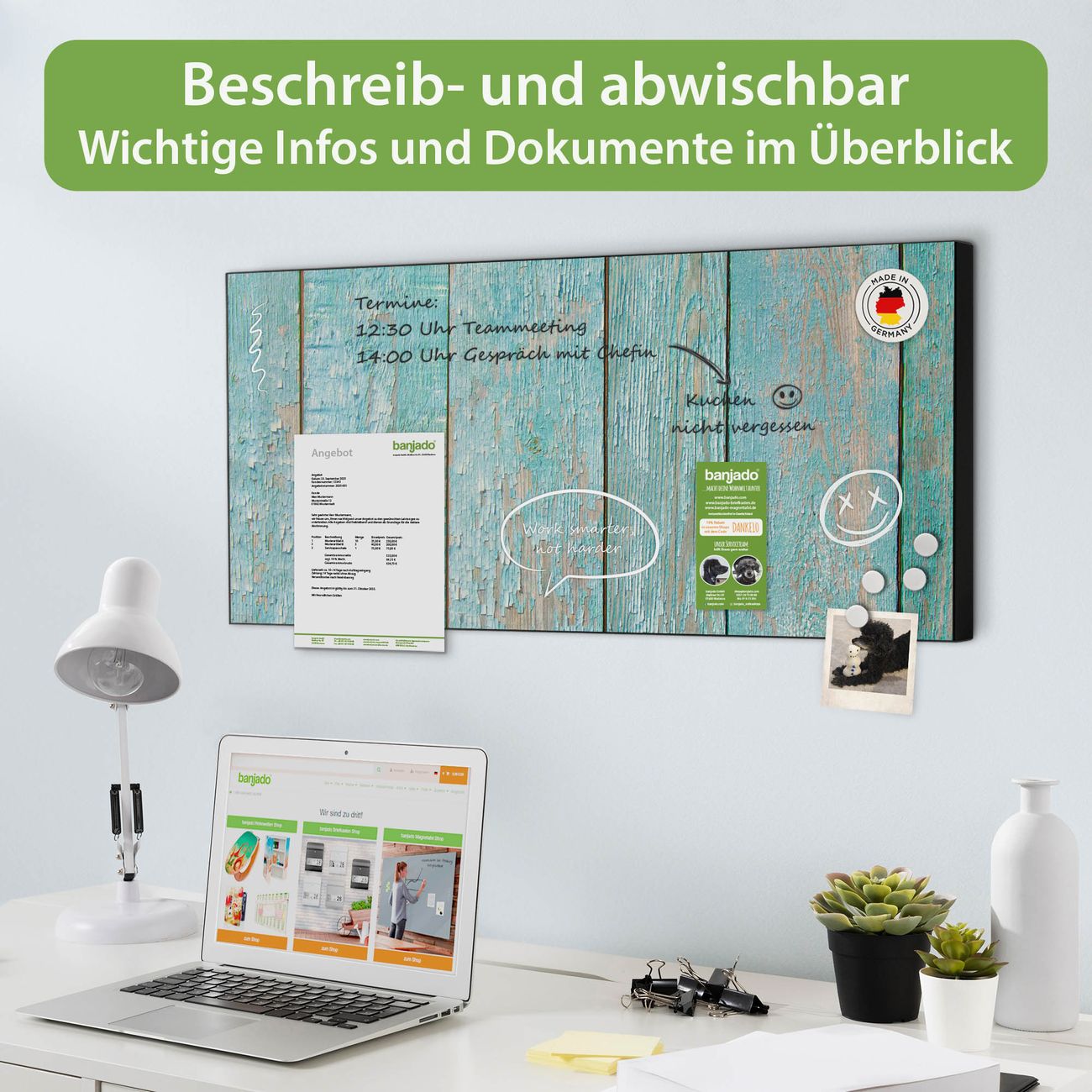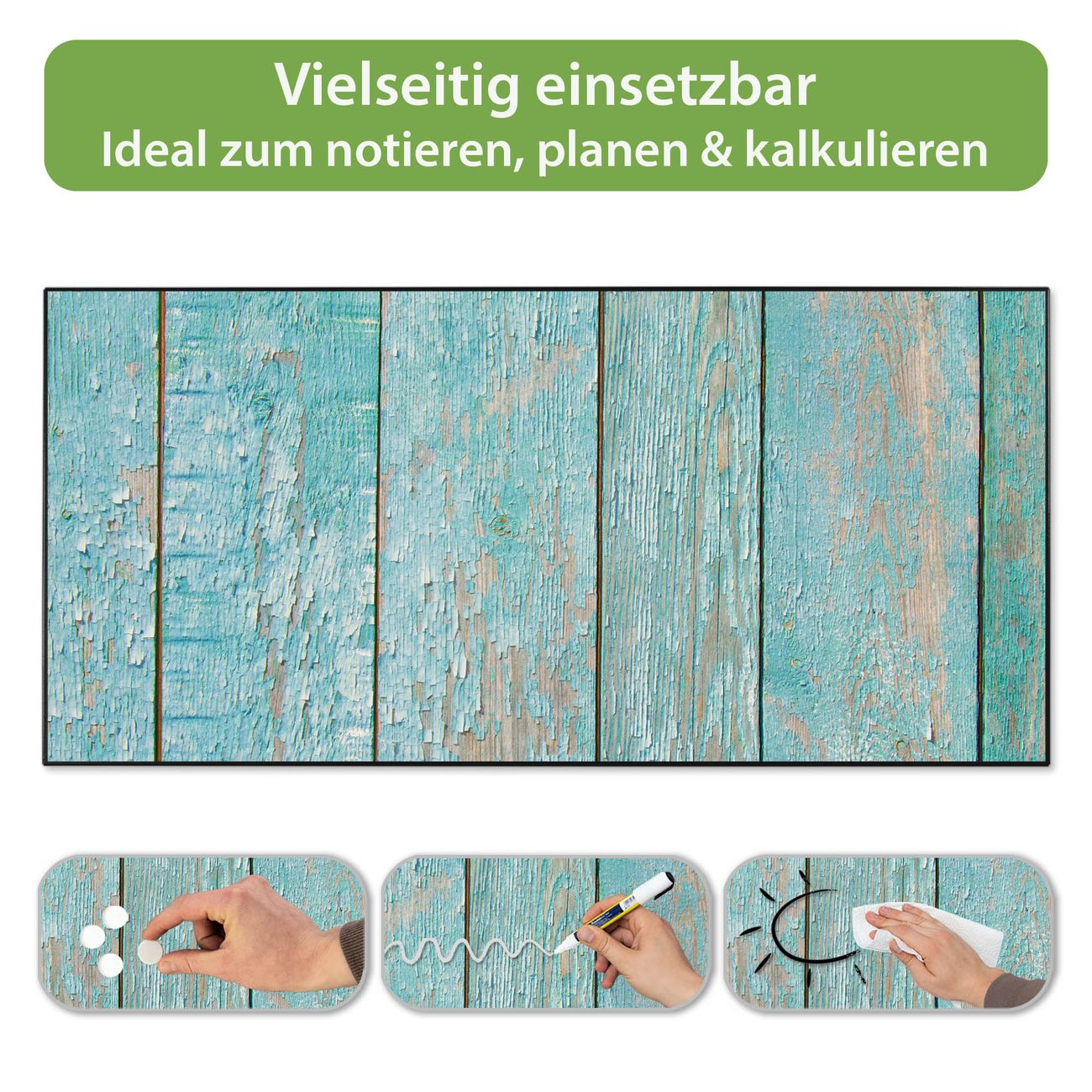 FUNKTION: Die banjado Magnettafel 78x37 cm im Design Motiv Blaue Planken vereint Funktionalität und modernes Wohndesign auf stilvolle Weise. Diese hochwertige Magnetwand aus Metall hilft Ihnen dabei, Notizen, Fotos, Termine, Einkaufslisten oder Rezepte übersichtlich zu organisieren. Als praktisches Memoboard sorgt sie für Struktur im Alltag und setzt gleichzeitig einen dekorativen Akzent an Ihrer Wand. DESIGN: Die Metalltafel besteht aus robustem, lackiertem Stahl und ist mit allen handelsüblichen Magneten nutzbar. Besonders praktisch ist die beschreibbare Oberfläche. Sie können die Magnettafel ganz einfach mit Kreidestiften beschriften und die Inhalte bei Bedarf mit einem feuchten Tuch wieder entfernen. So eignet sich das Memoboard ideal für Wochenpläne, Menüpläne, To Do Listen oder kreative Botschaften. DETAILS: Mit ihrem großzügigen Querformat von 78x37 cm bietet die Magnettafel ausreichend Platz für Ihre Organisation. Das Motiv Motiv Blaue Planken bringt eine warme, natürliche Optik in Küche, Flur, Büro oder Homeoffice und wirkt auch ohne Magnete oder Beschriftung wie ein modernes Wandbild. NUTZEN: Auf der Rückseite befinden sich vorgefertigte Löcher für eine schnelle und unkomplizierte Wandmontage. Jede banjado Magnettafel wird in Deutschland gefertigt und steht für Qualität, Langlebigkeit und liebevolle Verarbeitung. Dieses beschreibbare Memoboard ist die perfekte Kombination aus Metalltafel, Designobjekt und praktischer Magnetwand für Ihren Alltag. BANJADO: Wir sind ein kleines Team aus dem Herzen von Sachsen. Wir fertigen alle Artikel von Hand für Sie an, Sie erhalten keine preiswerte Importware. Auf Wunsch können Sie auch Ihr eigenes Foto auf die Magnettafel aufbringen, schreiben Sie uns an. Herzlichst, Ihr banjado-Team