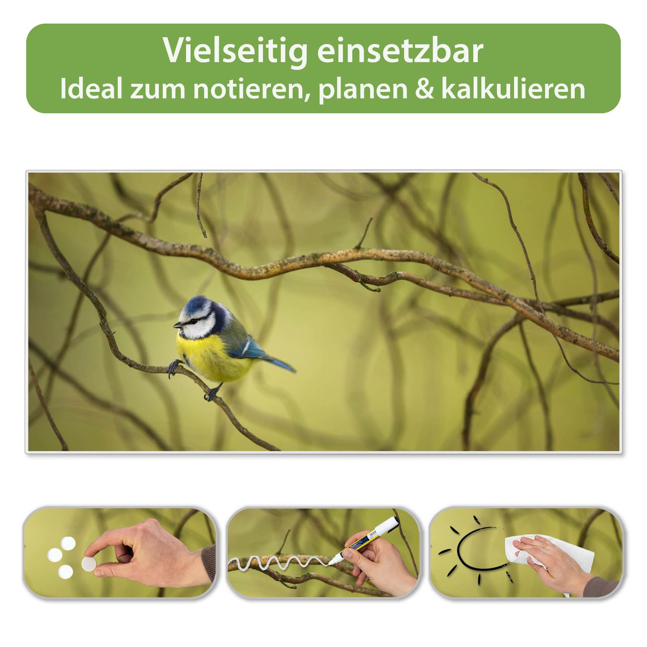 Metall Magnettafel beschreibbar 78x37cm Motiv Blaumeise im Baum