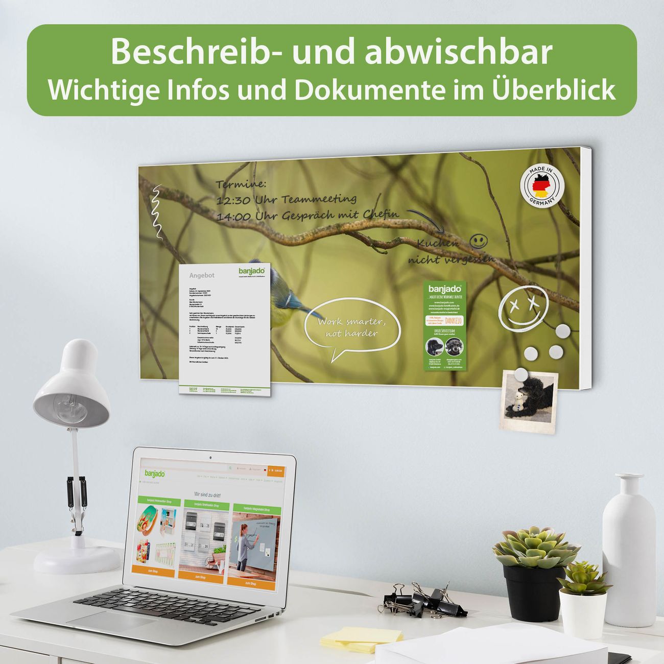 FUNKTION: Die banjado Magnettafel 78x37 cm im Design Motiv Blaumeise im Baum vereint Funktionalität und modernes Wohndesign auf stilvolle Weise. Diese hochwertige Magnetwand aus Metall hilft Ihnen dabei, Notizen, Fotos, Termine, Einkaufslisten oder Rezepte übersichtlich zu organisieren. Als praktisches Memoboard sorgt sie für Struktur im Alltag und setzt gleichzeitig einen dekorativen Akzent an Ihrer Wand. DESIGN: Die Metalltafel besteht aus robustem, lackiertem Stahl und ist mit allen handelsüblichen Magneten nutzbar. Besonders praktisch ist die beschreibbare Oberfläche. Sie können die Magnettafel ganz einfach mit Kreidestiften beschriften und die Inhalte bei Bedarf mit einem feuchten Tuch wieder entfernen. So eignet sich das Memoboard ideal für Wochenpläne, Menüpläne, To Do Listen oder kreative Botschaften. DETAILS: Mit ihrem großzügigen Querformat von 78x37 cm bietet die Magnettafel ausreichend Platz für Ihre Organisation. Das Motiv Motiv Blaumeise im Baum bringt eine warme, natürliche Optik in Küche, Flur, Büro oder Homeoffice und wirkt auch ohne Magnete oder Beschriftung wie ein modernes Wandbild. NUTZEN: Auf der Rückseite befinden sich vorgefertigte Löcher für eine schnelle und unkomplizierte Wandmontage. Jede banjado Magnettafel wird in Deutschland gefertigt und steht für Qualität, Langlebigkeit und liebevolle Verarbeitung. Dieses beschreibbare Memoboard ist die perfekte Kombination aus Metalltafel, Designobjekt und praktischer Magnetwand für Ihren Alltag. BANJADO: Wir sind ein kleines Team aus dem Herzen von Sachsen. Wir fertigen alle Artikel von Hand für Sie an, Sie erhalten keine preiswerte Importware. Auf Wunsch können Sie auch Ihr eigenes Foto auf die Magnettafel aufbringen, schreiben Sie uns an. Herzlichst, Ihr banjado-Team