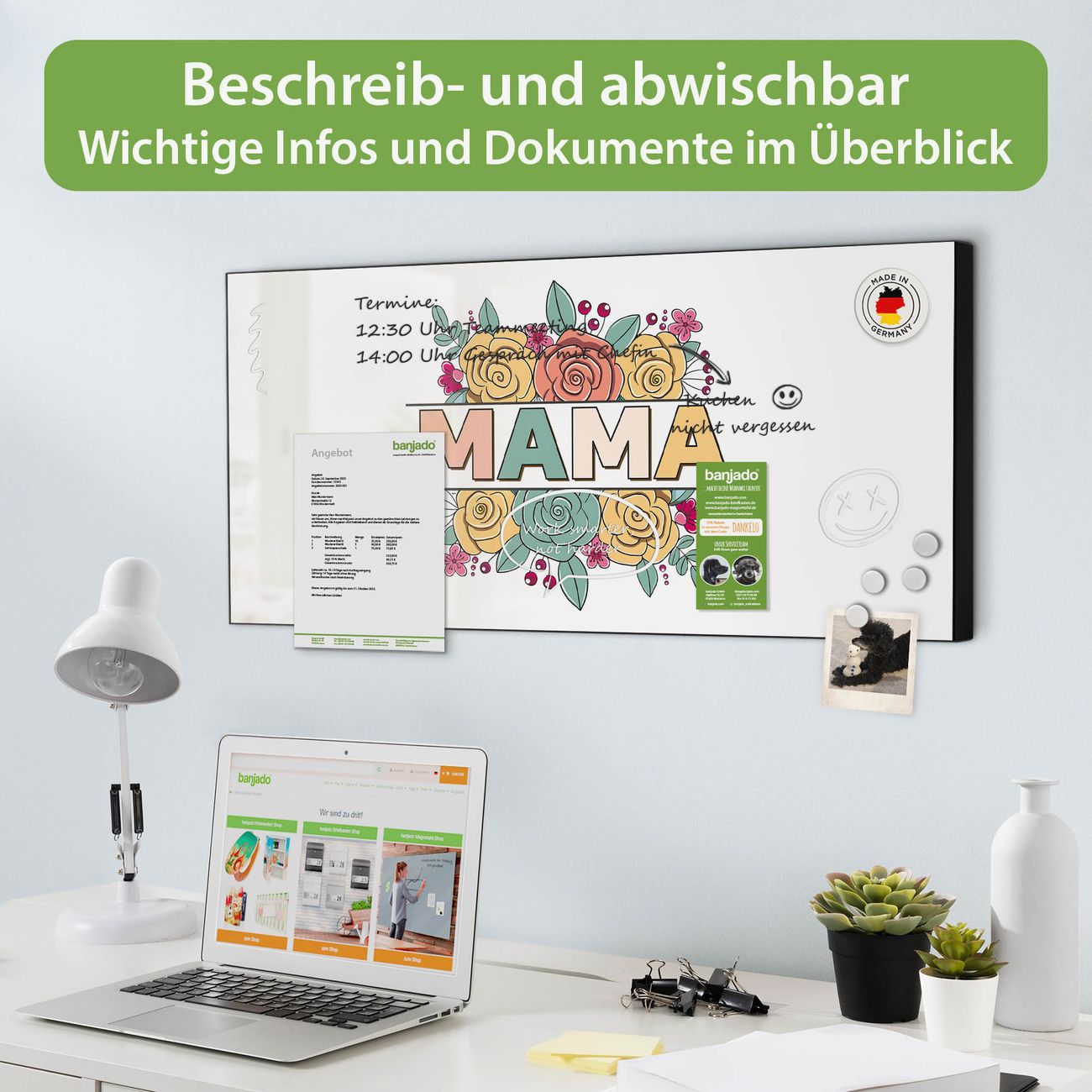 FUNKTION: Die banjado Magnettafel 78x37 cm im Design Motiv Blumengruß für Mama vereint Funktionalität und modernes Wohndesign auf stilvolle Weise. Diese hochwertige Magnetwand aus Metall hilft Ihnen dabei, Notizen, Fotos, Termine, Einkaufslisten oder Rezepte übersichtlich zu organisieren. Als praktisches Memoboard sorgt sie für Struktur im Alltag und setzt gleichzeitig einen dekorativen Akzent an Ihrer Wand. DESIGN: Die Metalltafel besteht aus robustem, lackiertem Stahl und ist mit allen handelsüblichen Magneten nutzbar. Besonders praktisch ist die beschreibbare Oberfläche. Sie können die Magnettafel ganz einfach mit Kreidestiften beschriften und die Inhalte bei Bedarf mit einem feuchten Tuch wieder entfernen. So eignet sich das Memoboard ideal für Wochenpläne, Menüpläne, To Do Listen oder kreative Botschaften. DETAILS: Mit ihrem großzügigen Querformat von 78x37 cm bietet die Magnettafel ausreichend Platz für Ihre Organisation. Das Motiv Motiv Blumengruß für Mama bringt eine warme, natürliche Optik in Küche, Flur, Büro oder Homeoffice und wirkt auch ohne Magnete oder Beschriftung wie ein modernes Wandbild. NUTZEN: Auf der Rückseite befinden sich vorgefertigte Löcher für eine schnelle und unkomplizierte Wandmontage. Jede banjado Magnettafel wird in Deutschland gefertigt und steht für Qualität, Langlebigkeit und liebevolle Verarbeitung. Dieses beschreibbare Memoboard ist die perfekte Kombination aus Metalltafel, Designobjekt und praktischer Magnetwand für Ihren Alltag. BANJADO: Wir sind ein kleines Team aus dem Herzen von Sachsen. Wir fertigen alle Artikel von Hand für Sie an, Sie erhalten keine preiswerte Importware. Auf Wunsch können Sie auch Ihr eigenes Foto auf die Magnettafel aufbringen, schreiben Sie uns an. Herzlichst, Ihr banjado-Team