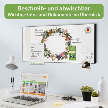 FUNKTION: Die banjado Magnettafel 78x37 cm im Design Motiv Blumenkranz der Jahreszeiten vereint Funktionalität und modernes Wohndesign auf stilvolle Weise. Diese hochwertige Magnetwand aus Metall hilft Ihnen dabei, Notizen, Fotos, Termine, Einkaufslisten oder Rezepte übersichtlich zu organisieren. Als praktisches Memoboard sorgt sie für Struktur im Alltag und setzt gleichzeitig einen dekorativen Akzent an Ihrer Wand. DESIGN: Die Metalltafel besteht aus robustem, lackiertem Stahl und ist mit allen handelsüblichen Magneten nutzbar. Besonders praktisch ist die beschreibbare Oberfläche. Sie können die Magnettafel ganz einfach mit Kreidestiften beschriften und die Inhalte bei Bedarf mit einem feuchten Tuch wieder entfernen. So eignet sich das Memoboard ideal für Wochenpläne, Menüpläne, To Do Listen oder kreative Botschaften. DETAILS: Mit ihrem großzügigen Querformat von 78x37 cm bietet die Magnettafel ausreichend Platz für Ihre Organisation. Das Motiv Motiv Blumenkranz der Jahreszeiten bringt eine warme, natürliche Optik in Küche, Flur, Büro oder Homeoffice und wirkt auch ohne Magnete oder Beschriftung wie ein modernes Wandbild. NUTZEN: Auf der Rückseite befinden sich vorgefertigte Löcher für eine schnelle und unkomplizierte Wandmontage. Jede banjado Magnettafel wird in Deutschland gefertigt und steht für Qualität, Langlebigkeit und liebevolle Verarbeitung. Dieses beschreibbare Memoboard ist die perfekte Kombination aus Metalltafel, Designobjekt und praktischer Magnetwand für Ihren Alltag. BANJADO: Wir sind ein kleines Team aus dem Herzen von Sachsen. Wir fertigen alle Artikel von Hand für Sie an, Sie erhalten keine preiswerte Importware. Auf Wunsch können Sie auch Ihr eigenes Foto auf die Magnettafel aufbringen, schreiben Sie uns an. Herzlichst, Ihr banjado-Team