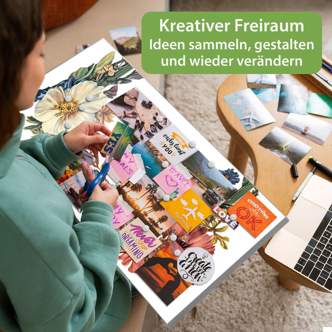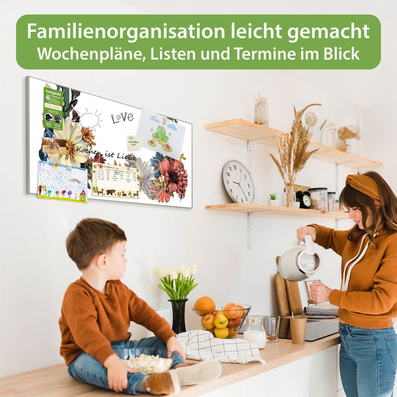 FUNKTION: Die banjado Magnettafel 78x37 cm im Design Motiv Blumenrahmen vereint Funktionalität und modernes Wohndesign auf stilvolle Weise. Diese hochwertige Magnetwand aus Metall hilft Ihnen dabei, Notizen, Fotos, Termine, Einkaufslisten oder Rezepte übersichtlich zu organisieren. Als praktisches Memoboard sorgt sie für Struktur im Alltag und setzt gleichzeitig einen dekorativen Akzent an Ihrer Wand. DESIGN: Die Metalltafel besteht aus robustem, lackiertem Stahl und ist mit allen handelsüblichen Magneten nutzbar. Besonders praktisch ist die beschreibbare Oberfläche. Sie können die Magnettafel ganz einfach mit Kreidestiften beschriften und die Inhalte bei Bedarf mit einem feuchten Tuch wieder entfernen. So eignet sich das Memoboard ideal für Wochenpläne, Menüpläne, To Do Listen oder kreative Botschaften. DETAILS: Mit ihrem großzügigen Querformat von 78x37 cm bietet die Magnettafel ausreichend Platz für Ihre Organisation. Das Motiv Motiv Blumenrahmen bringt eine warme, natürliche Optik in Küche, Flur, Büro oder Homeoffice und wirkt auch ohne Magnete oder Beschriftung wie ein modernes Wandbild. NUTZEN: Auf der Rückseite befinden sich vorgefertigte Löcher für eine schnelle und unkomplizierte Wandmontage. Jede banjado Magnettafel wird in Deutschland gefertigt und steht für Qualität, Langlebigkeit und liebevolle Verarbeitung. Dieses beschreibbare Memoboard ist die perfekte Kombination aus Metalltafel, Designobjekt und praktischer Magnetwand für Ihren Alltag. BANJADO: Wir sind ein kleines Team aus dem Herzen von Sachsen. Wir fertigen alle Artikel von Hand für Sie an, Sie erhalten keine preiswerte Importware. Auf Wunsch können Sie auch Ihr eigenes Foto auf die Magnettafel aufbringen, schreiben Sie uns an. Herzlichst, Ihr banjado-Team