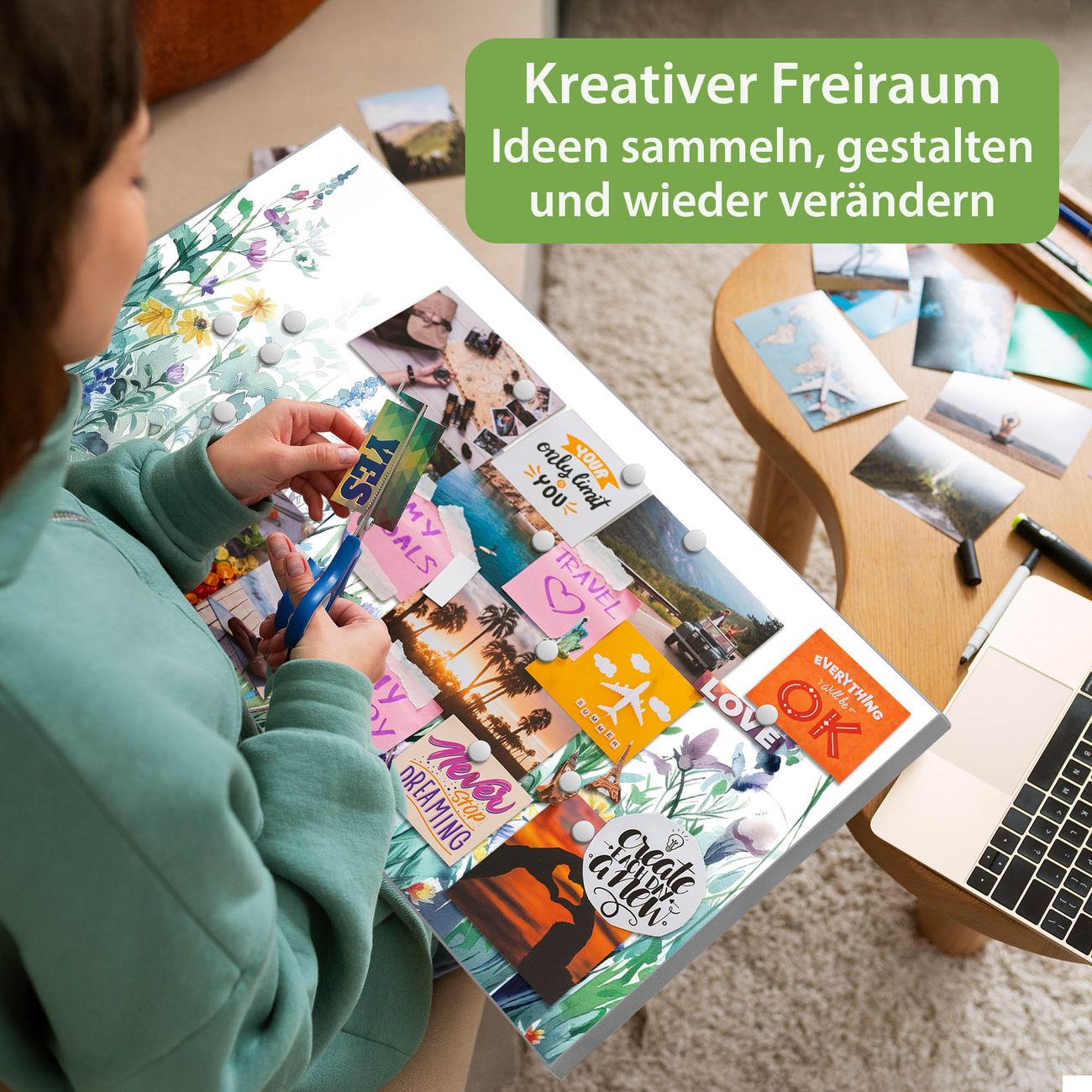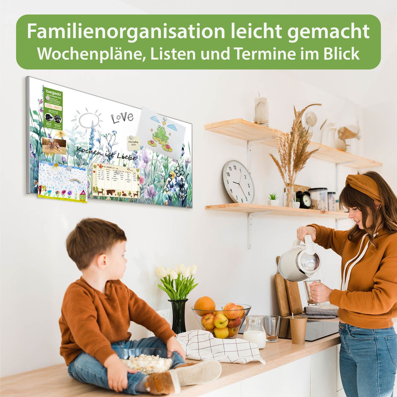 FUNKTION: Die banjado Magnettafel 78x37 cm im Design Motiv Blumenwiese in Aquarell vereint Funktionalität und modernes Wohndesign auf stilvolle Weise. Diese hochwertige Magnetwand aus Metall hilft Ihnen dabei, Notizen, Fotos, Termine, Einkaufslisten oder Rezepte übersichtlich zu organisieren. Als praktisches Memoboard sorgt sie für Struktur im Alltag und setzt gleichzeitig einen dekorativen Akzent an Ihrer Wand. DESIGN: Die Metalltafel besteht aus robustem, lackiertem Stahl und ist mit allen handelsüblichen Magneten nutzbar. Besonders praktisch ist die beschreibbare Oberfläche. Sie können die Magnettafel ganz einfach mit Kreidestiften beschriften und die Inhalte bei Bedarf mit einem feuchten Tuch wieder entfernen. So eignet sich das Memoboard ideal für Wochenpläne, Menüpläne, To Do Listen oder kreative Botschaften. DETAILS: Mit ihrem großzügigen Querformat von 78x37 cm bietet die Magnettafel ausreichend Platz für Ihre Organisation. Das Motiv Motiv Blumenwiese in Aquarell bringt eine warme, natürliche Optik in Küche, Flur, Büro oder Homeoffice und wirkt auch ohne Magnete oder Beschriftung wie ein modernes Wandbild. NUTZEN: Auf der Rückseite befinden sich vorgefertigte Löcher für eine schnelle und unkomplizierte Wandmontage. Jede banjado Magnettafel wird in Deutschland gefertigt und steht für Qualität, Langlebigkeit und liebevolle Verarbeitung. Dieses beschreibbare Memoboard ist die perfekte Kombination aus Metalltafel, Designobjekt und praktischer Magnetwand für Ihren Alltag. BANJADO: Wir sind ein kleines Team aus dem Herzen von Sachsen. Wir fertigen alle Artikel von Hand für Sie an, Sie erhalten keine preiswerte Importware. Auf Wunsch können Sie auch Ihr eigenes Foto auf die Magnettafel aufbringen, schreiben Sie uns an. Herzlichst, Ihr banjado-Team