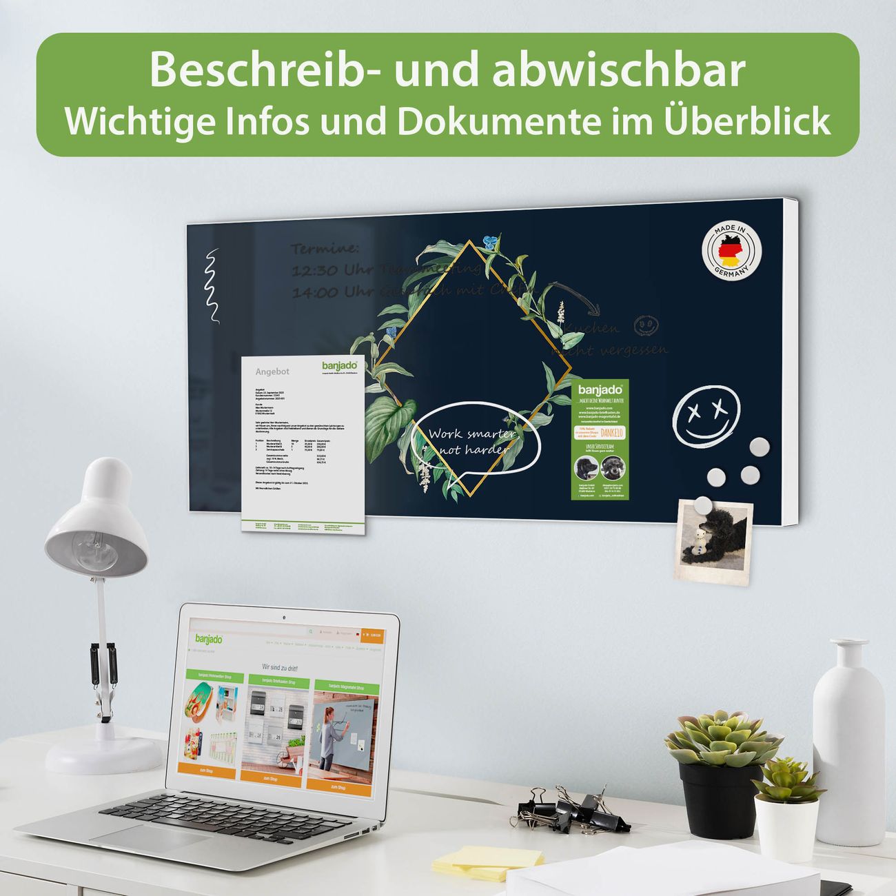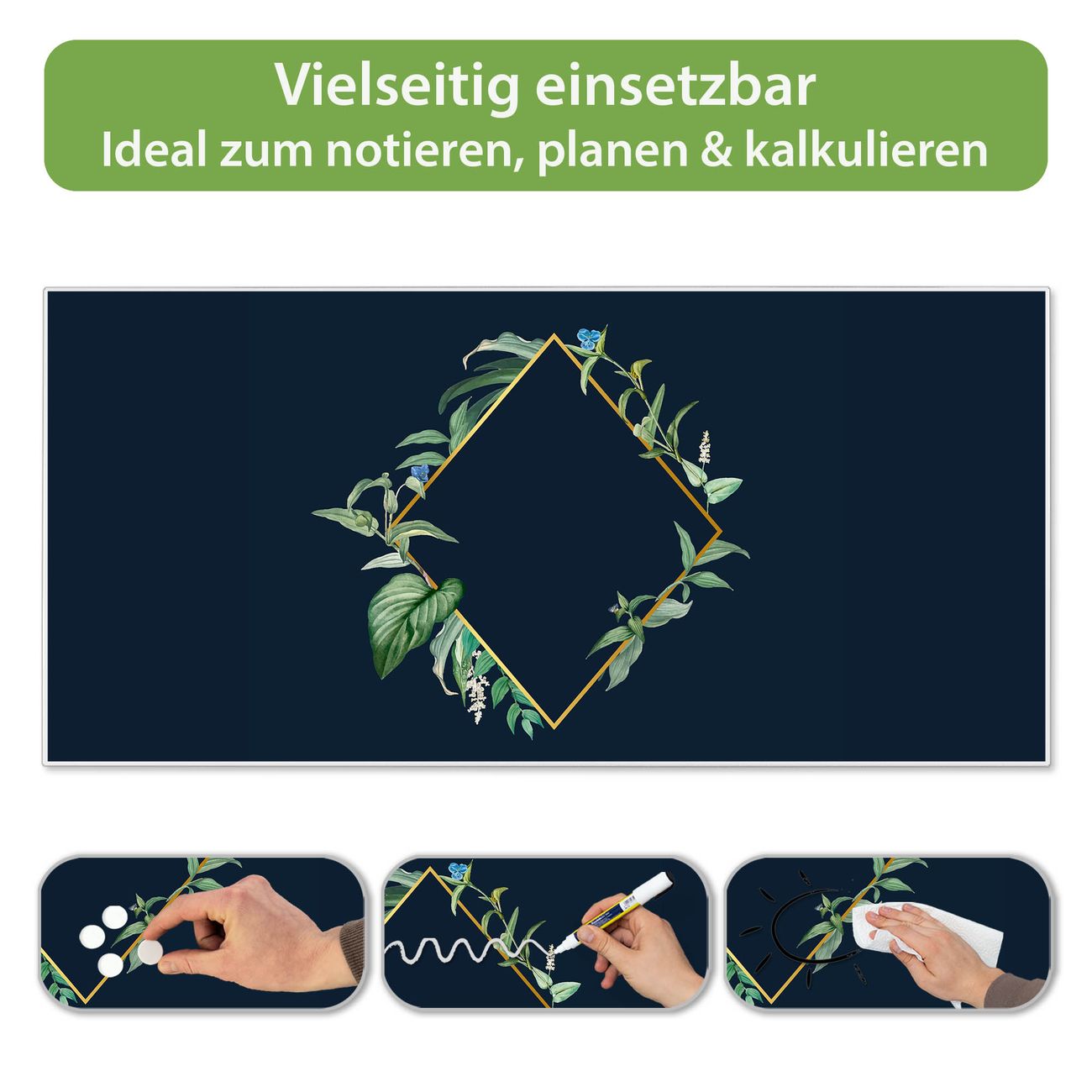 FUNKTION: Die banjado Magnettafel 78x37 cm im Design Motiv Botanischer Rahmen vereint Funktionalität und modernes Wohndesign auf stilvolle Weise. Diese hochwertige Magnetwand aus Metall hilft Ihnen dabei, Notizen, Fotos, Termine, Einkaufslisten oder Rezepte übersichtlich zu organisieren. Als praktisches Memoboard sorgt sie für Struktur im Alltag und setzt gleichzeitig einen dekorativen Akzent an Ihrer Wand. DESIGN: Die Metalltafel besteht aus robustem, lackiertem Stahl und ist mit allen handelsüblichen Magneten nutzbar. Besonders praktisch ist die beschreibbare Oberfläche. Sie können die Magnettafel ganz einfach mit Kreidestiften beschriften und die Inhalte bei Bedarf mit einem feuchten Tuch wieder entfernen. So eignet sich das Memoboard ideal für Wochenpläne, Menüpläne, To Do Listen oder kreative Botschaften. DETAILS: Mit ihrem großzügigen Querformat von 78x37 cm bietet die Magnettafel ausreichend Platz für Ihre Organisation. Das Motiv Motiv Botanischer Rahmen bringt eine warme, natürliche Optik in Küche, Flur, Büro oder Homeoffice und wirkt auch ohne Magnete oder Beschriftung wie ein modernes Wandbild. NUTZEN: Auf der Rückseite befinden sich vorgefertigte Löcher für eine schnelle und unkomplizierte Wandmontage. Jede banjado Magnettafel wird in Deutschland gefertigt und steht für Qualität, Langlebigkeit und liebevolle Verarbeitung. Dieses beschreibbare Memoboard ist die perfekte Kombination aus Metalltafel, Designobjekt und praktischer Magnetwand für Ihren Alltag. BANJADO: Wir sind ein kleines Team aus dem Herzen von Sachsen. Wir fertigen alle Artikel von Hand für Sie an, Sie erhalten keine preiswerte Importware. Auf Wunsch können Sie auch Ihr eigenes Foto auf die Magnettafel aufbringen, schreiben Sie uns an. Herzlichst, Ihr banjado-Team