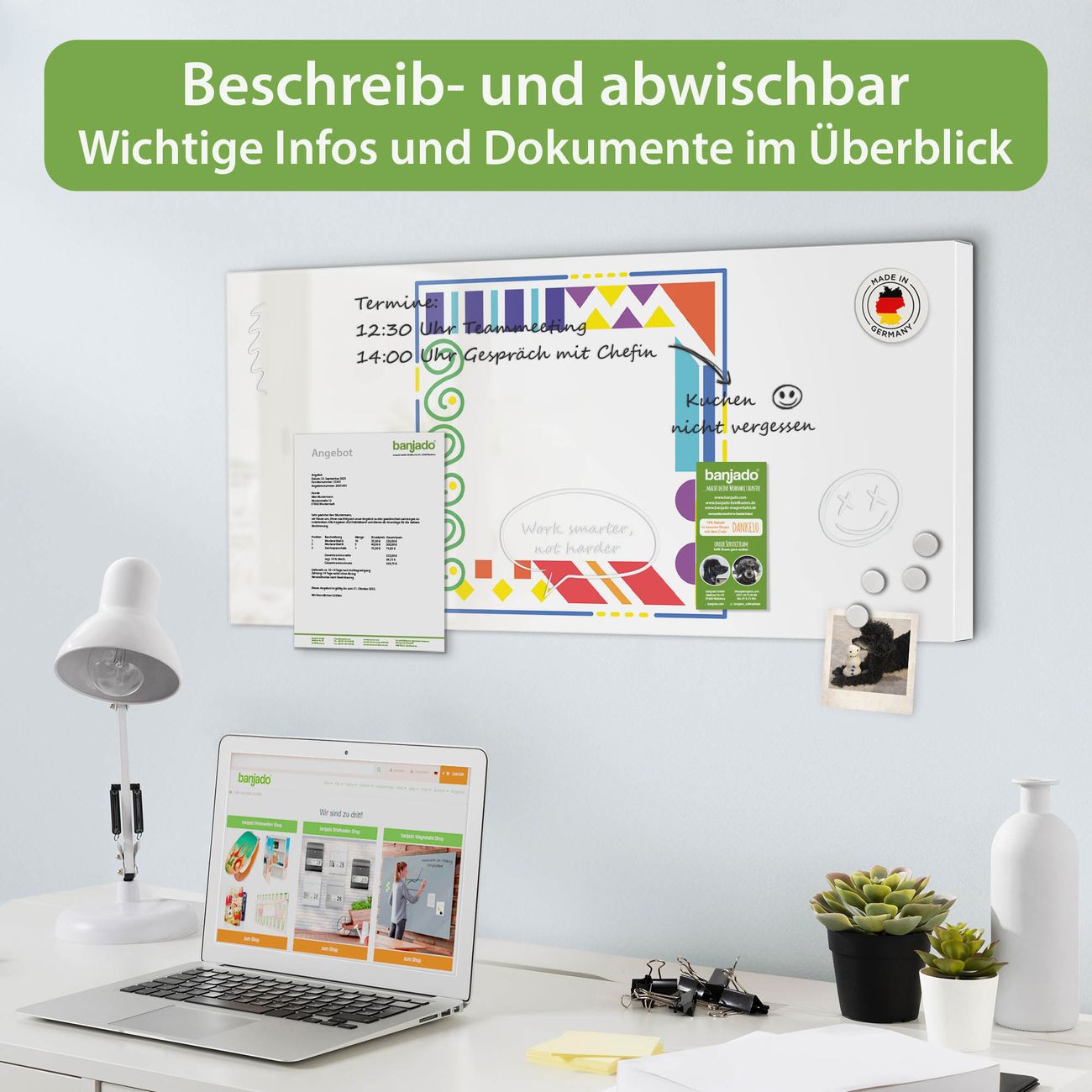 FUNKTION: Die banjado Magnettafel 78x37 cm im Design Motiv Bunte Ecken vereint Funktionalität und modernes Wohndesign auf stilvolle Weise. Diese hochwertige Magnetwand aus Metall hilft Ihnen dabei, Notizen, Fotos, Termine, Einkaufslisten oder Rezepte übersichtlich zu organisieren. Als praktisches Memoboard sorgt sie für Struktur im Alltag und setzt gleichzeitig einen dekorativen Akzent an Ihrer Wand. DESIGN: Die Metalltafel besteht aus robustem, lackiertem Stahl und ist mit allen handelsüblichen Magneten nutzbar. Besonders praktisch ist die beschreibbare Oberfläche. Sie können die Magnettafel ganz einfach mit Kreidestiften beschriften und die Inhalte bei Bedarf mit einem feuchten Tuch wieder entfernen. So eignet sich das Memoboard ideal für Wochenpläne, Menüpläne, To Do Listen oder kreative Botschaften. DETAILS: Mit ihrem großzügigen Querformat von 78x37 cm bietet die Magnettafel ausreichend Platz für Ihre Organisation. Das Motiv Motiv Bunte Ecken bringt eine warme, natürliche Optik in Küche, Flur, Büro oder Homeoffice und wirkt auch ohne Magnete oder Beschriftung wie ein modernes Wandbild. NUTZEN: Auf der Rückseite befinden sich vorgefertigte Löcher für eine schnelle und unkomplizierte Wandmontage. Jede banjado Magnettafel wird in Deutschland gefertigt und steht für Qualität, Langlebigkeit und liebevolle Verarbeitung. Dieses beschreibbare Memoboard ist die perfekte Kombination aus Metalltafel, Designobjekt und praktischer Magnetwand für Ihren Alltag. BANJADO: Wir sind ein kleines Team aus dem Herzen von Sachsen. Wir fertigen alle Artikel von Hand für Sie an, Sie erhalten keine preiswerte Importware. Auf Wunsch können Sie auch Ihr eigenes Foto auf die Magnettafel aufbringen, schreiben Sie uns an. Herzlichst, Ihr banjado-Team